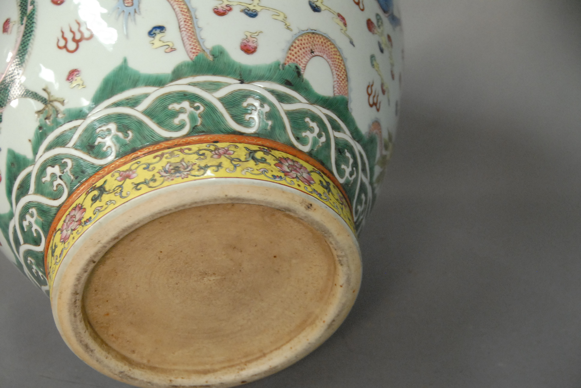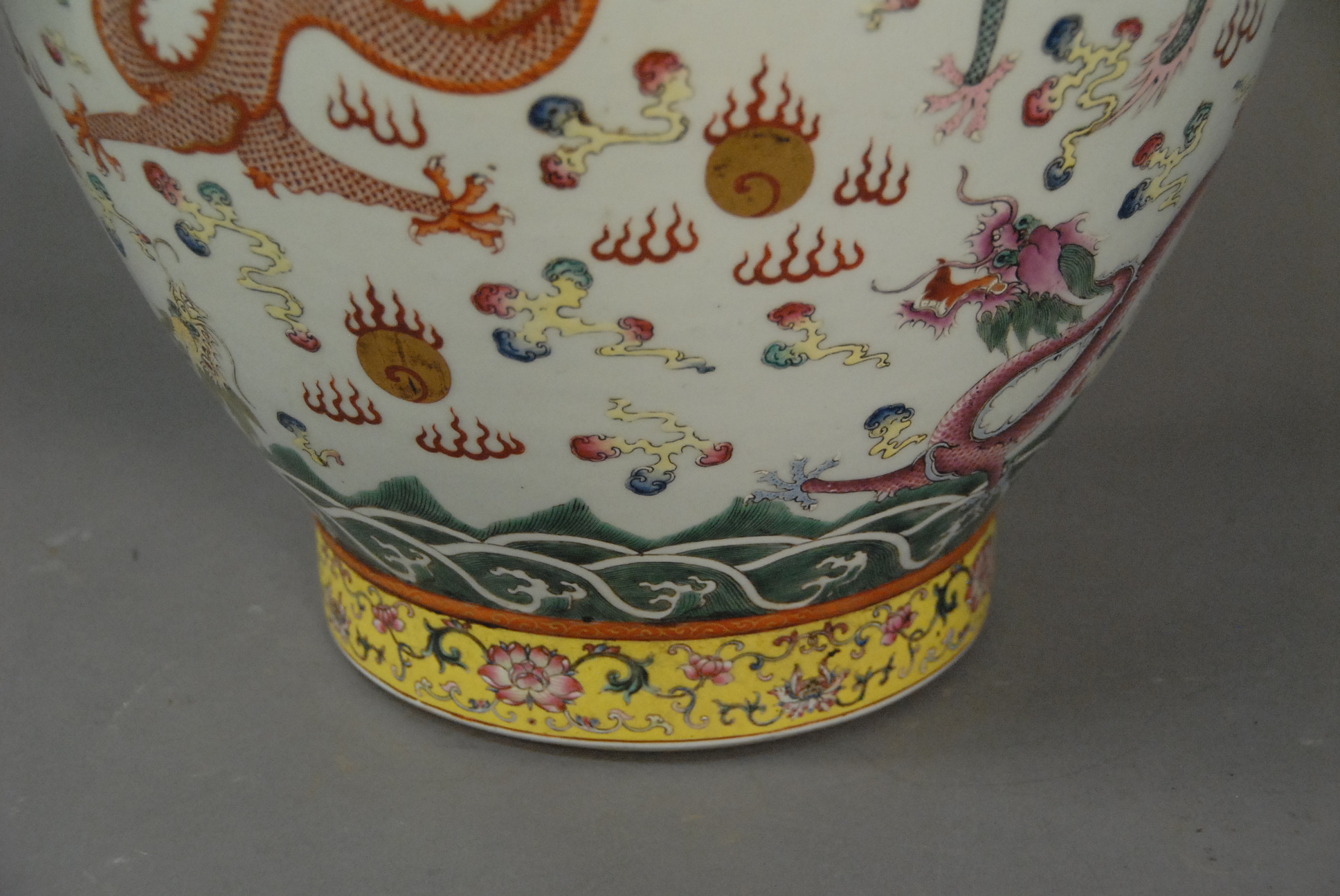 Large Famille Rose balluster form vase with flaming cloud and five claw dragon design. ht. 23 in.