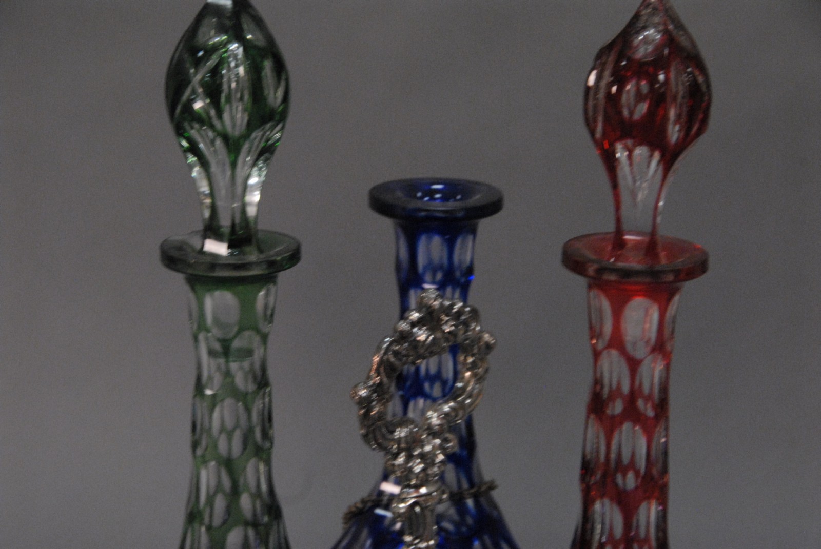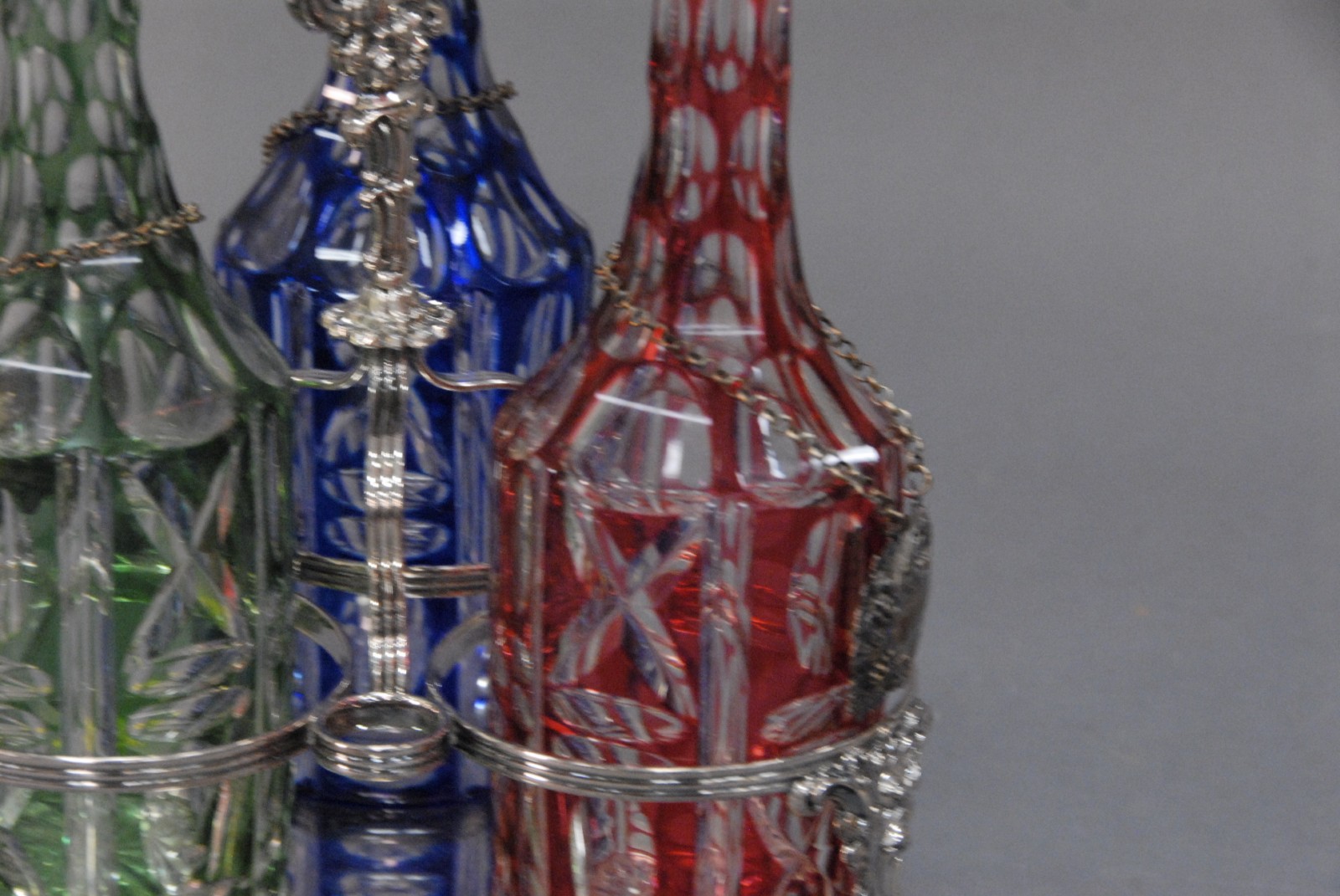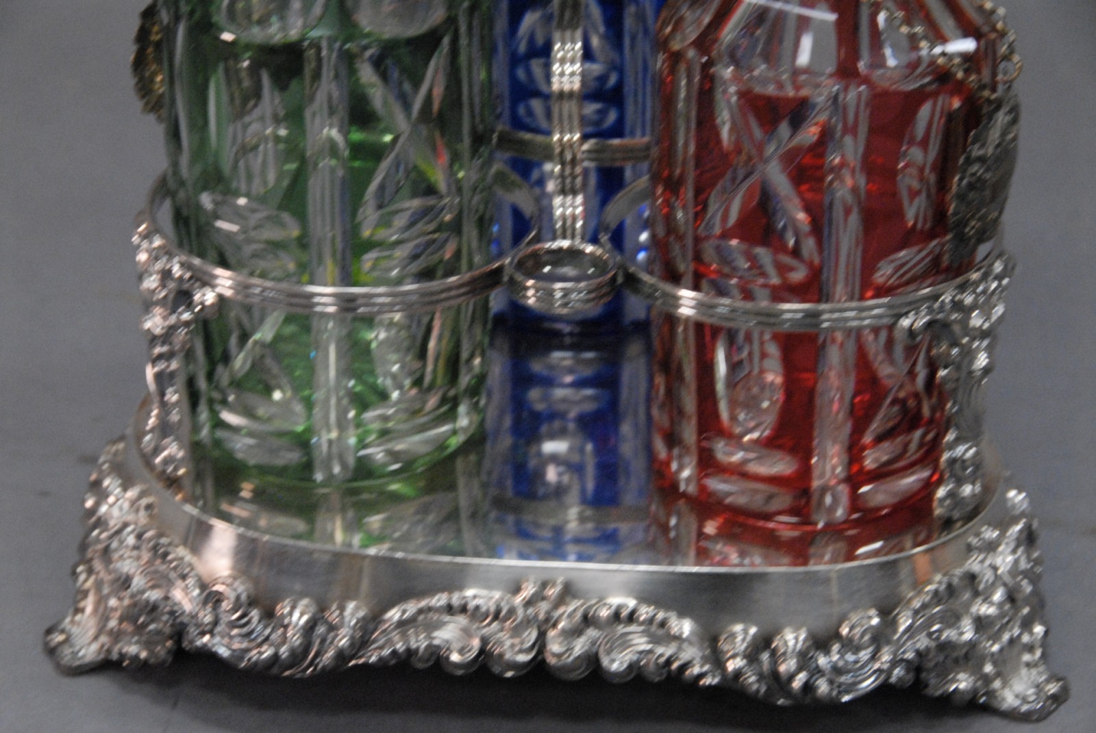 Sheffield silver plated triple decanter set having three decanters, one blue, one green and one red, each cut to clear with silver liquor labels one stopper missing. Provenance: Governor Henry Roberts Edward Roberts 1110 Prospect Ave Hartford to present owner.