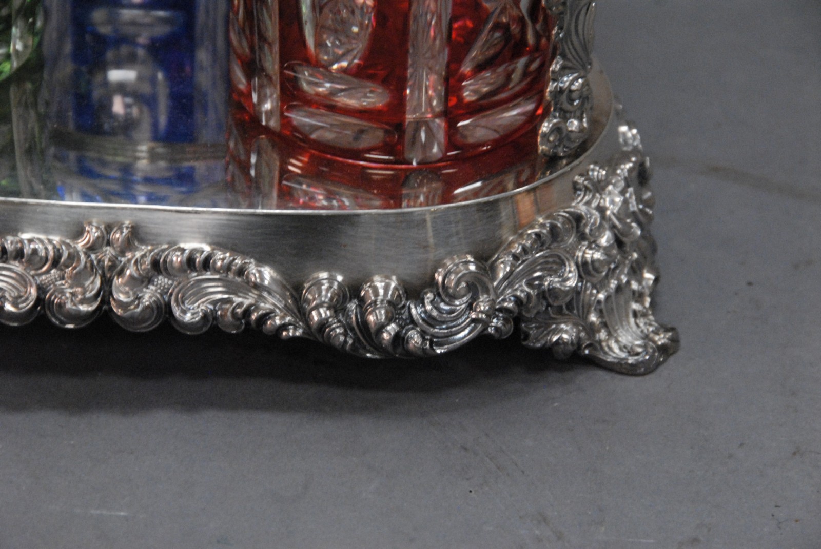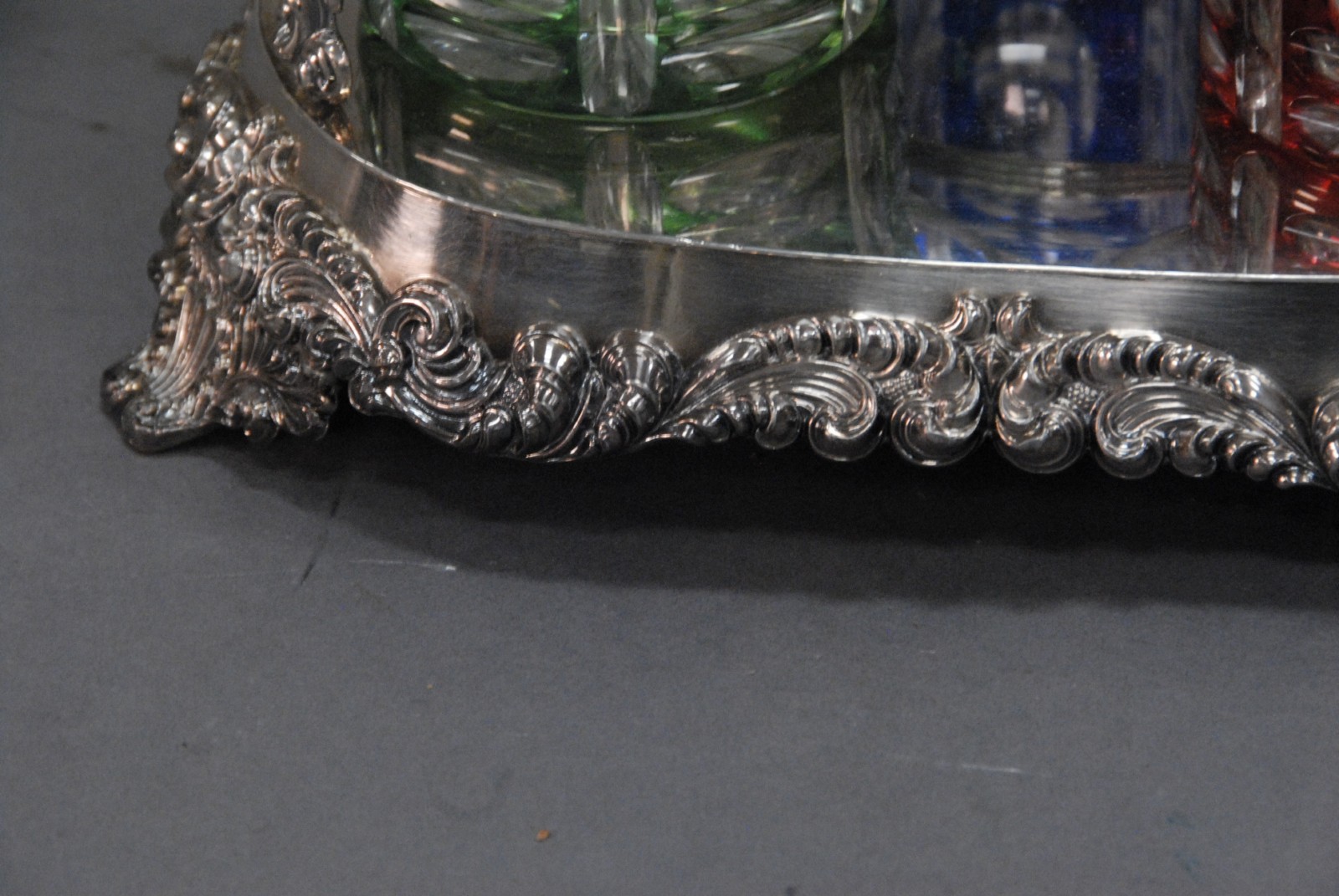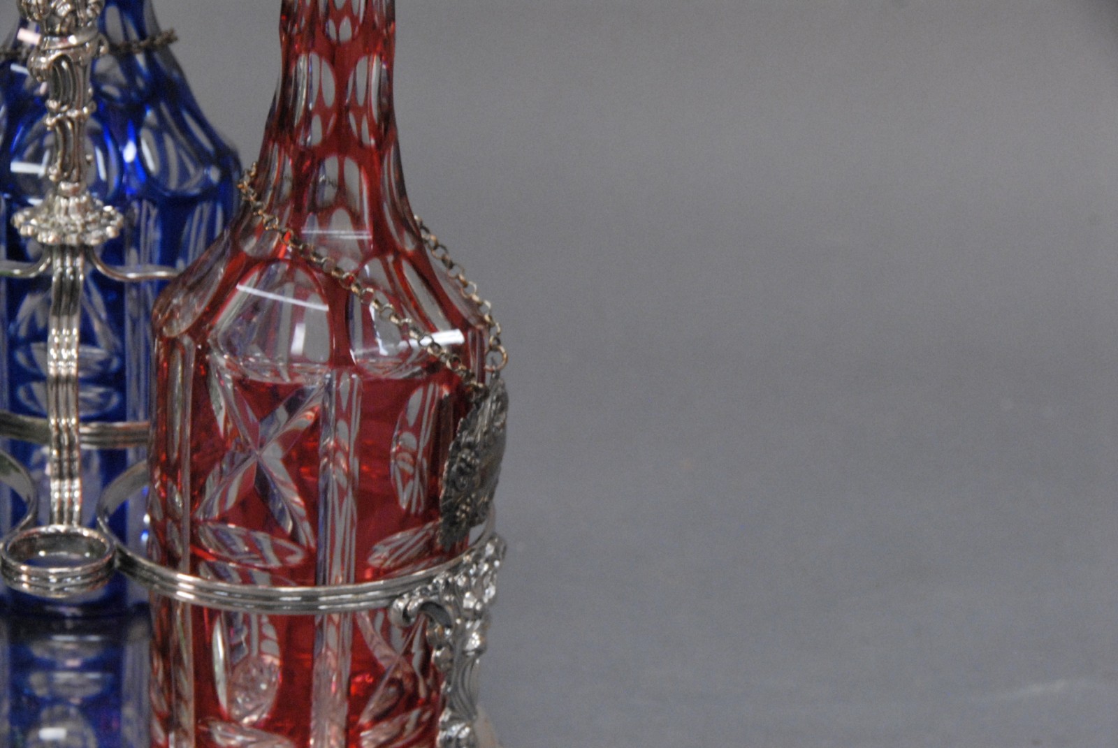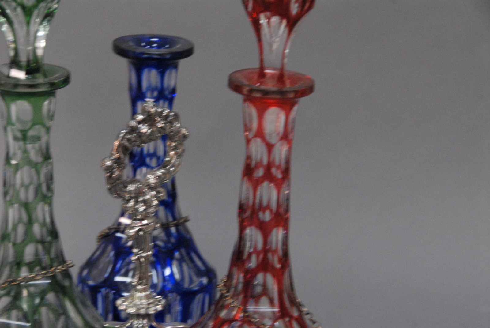 Sheffield silver plated triple decanter set having three decanters, one blue, one green and one red, each cut to clear with silver liquor labels one stopper missing. Provenance: Governor Henry Roberts Edward Roberts 1110 Prospect Ave Hartford to present owner.