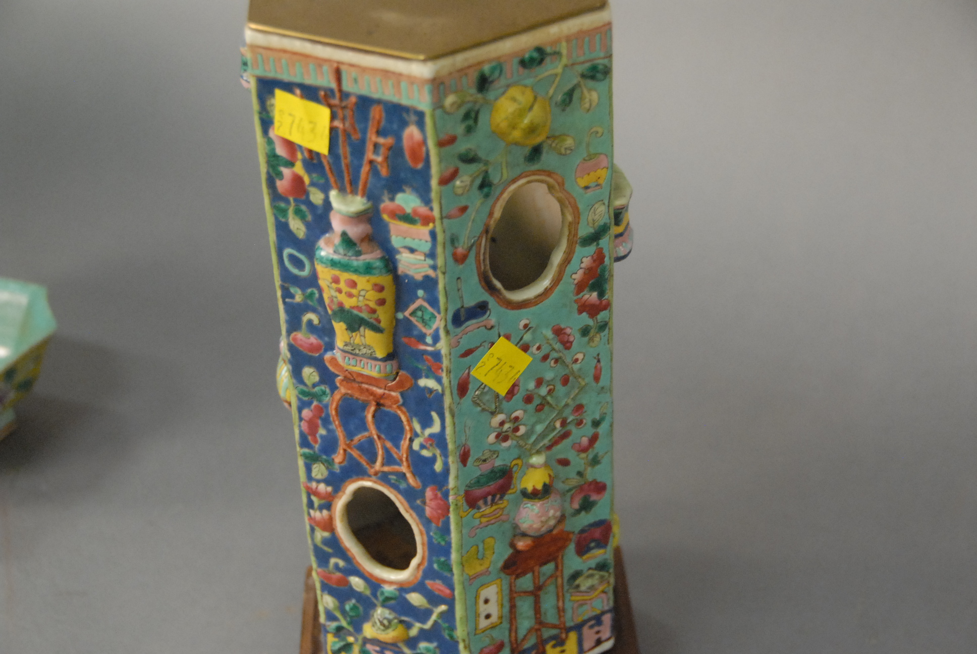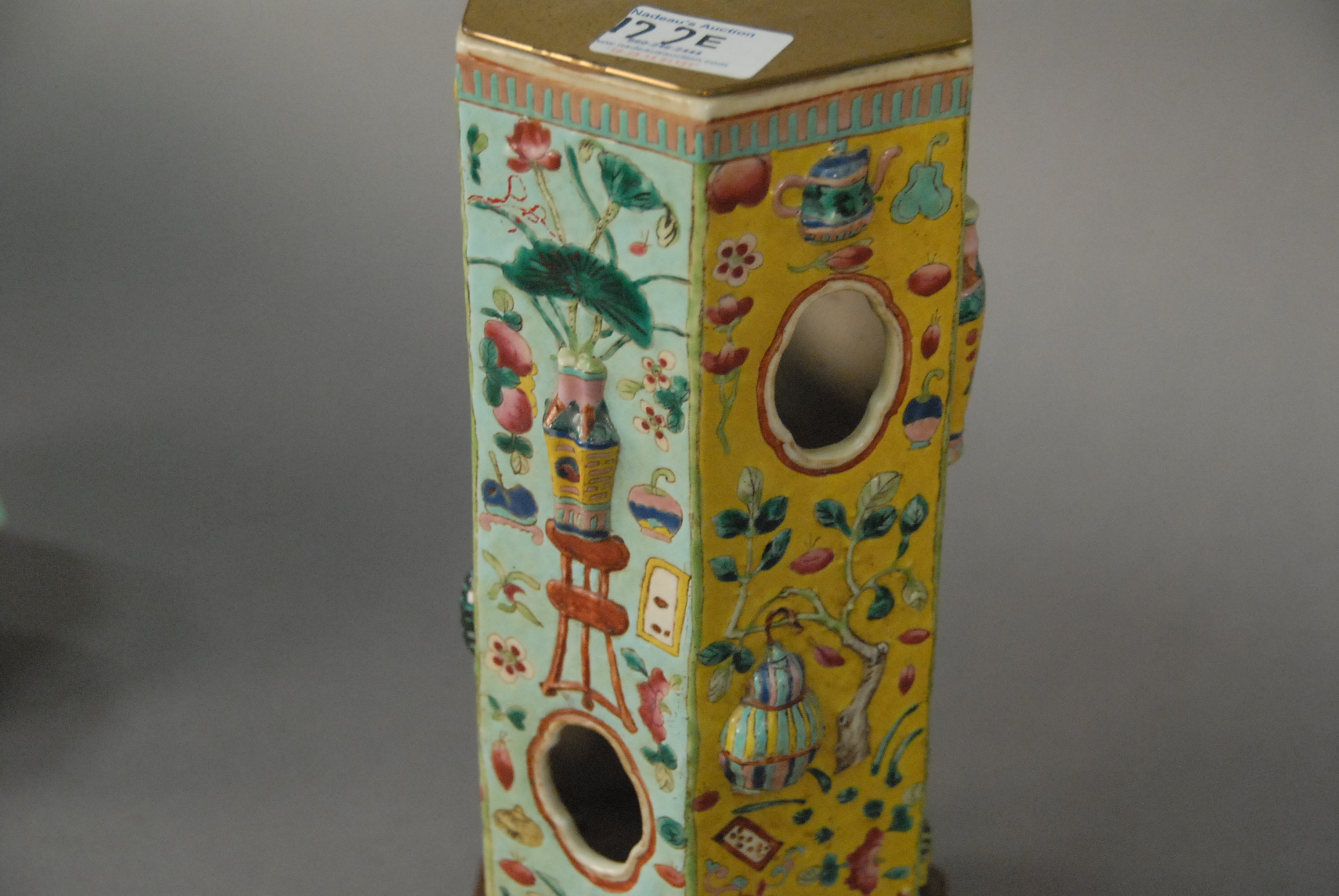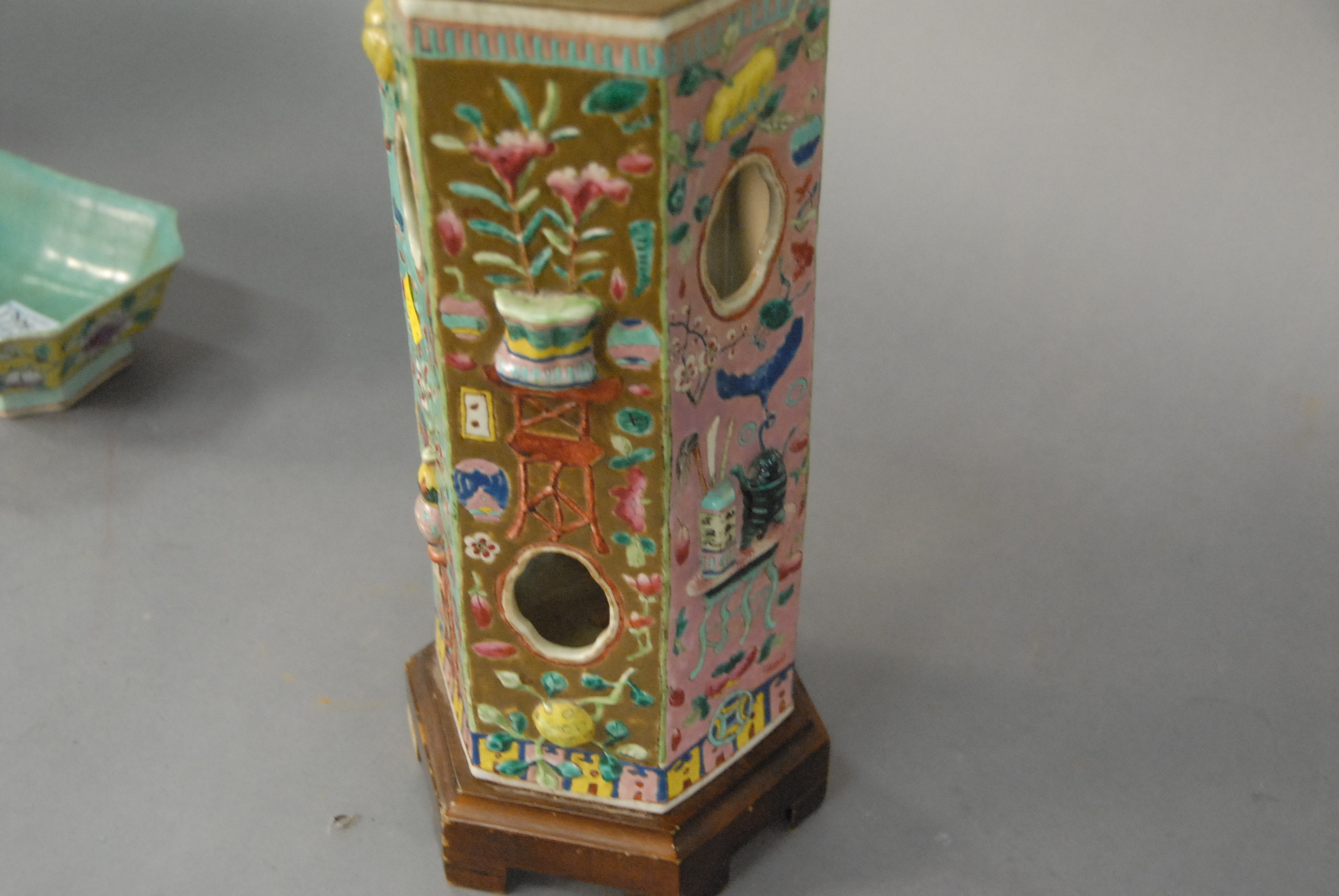 Lot 177E: Famille Rose hexagon lantern vase, panels with molded vases having flowers and cut out window, on stand. ht. 11 in.