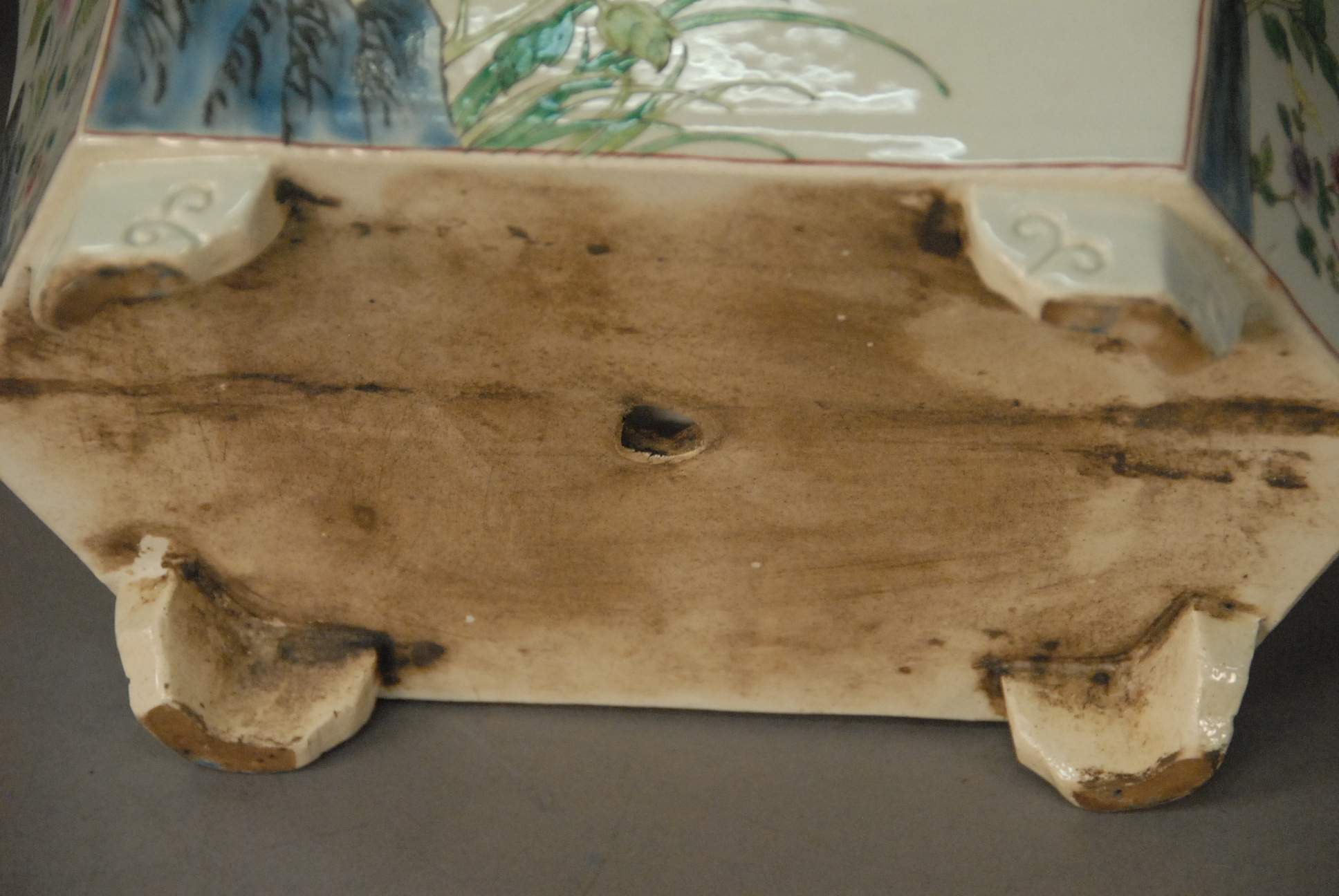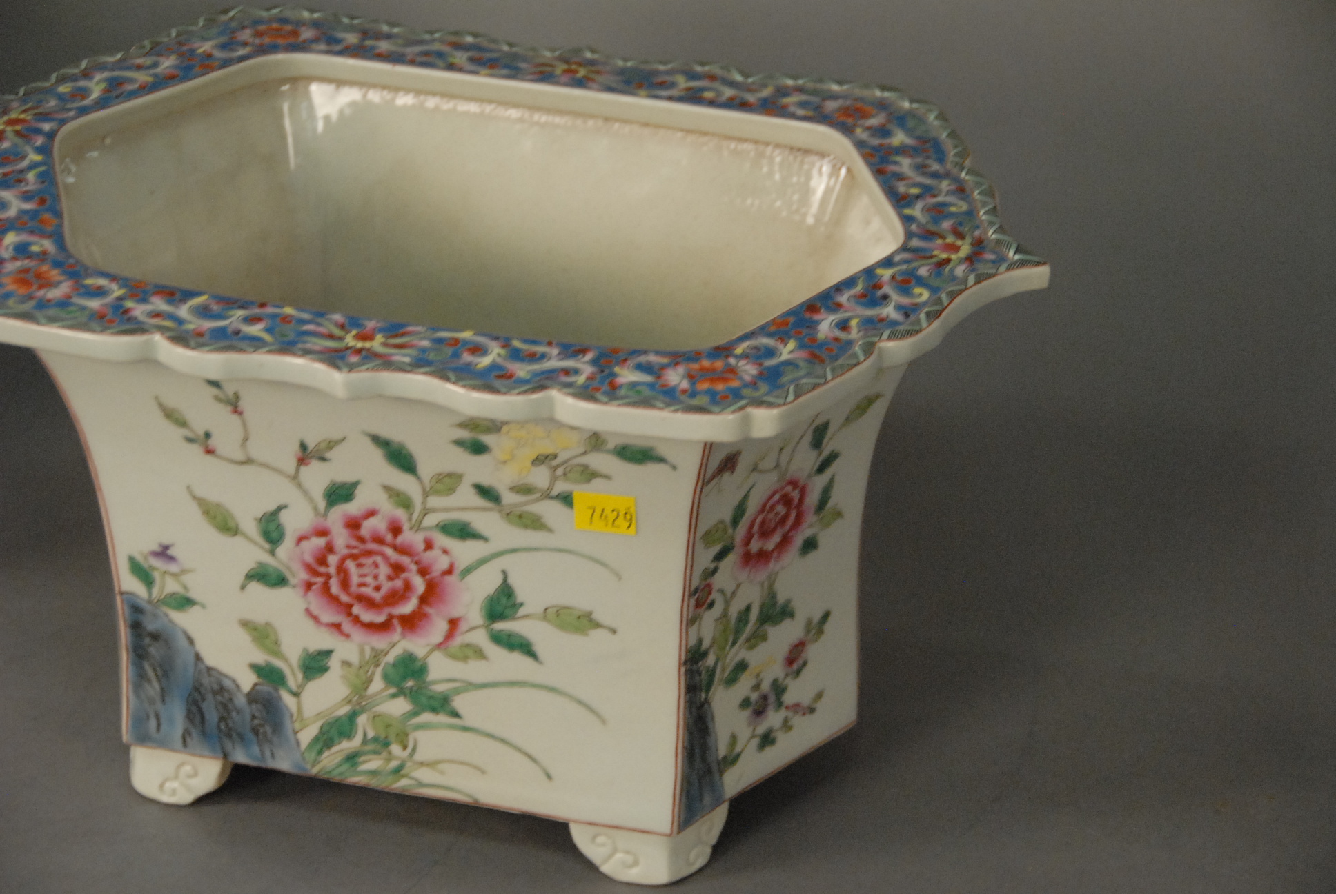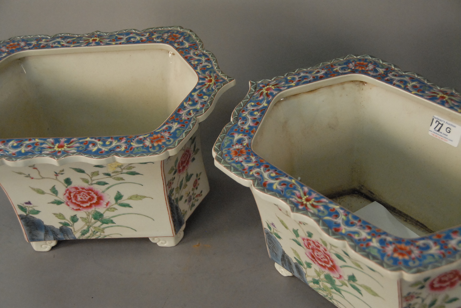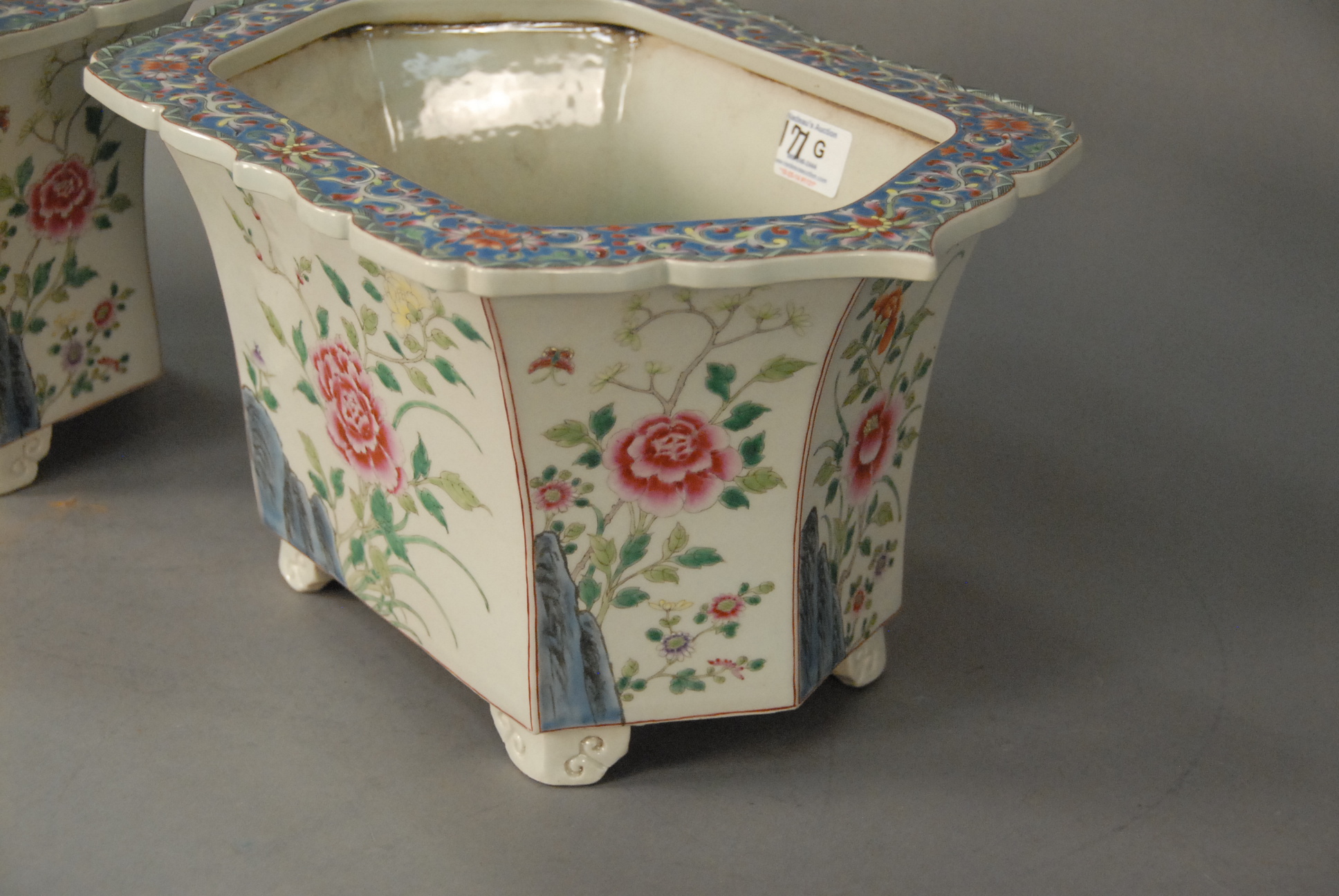 Pair of Famille Rose jardinieres with floral decoration. 9 x 14