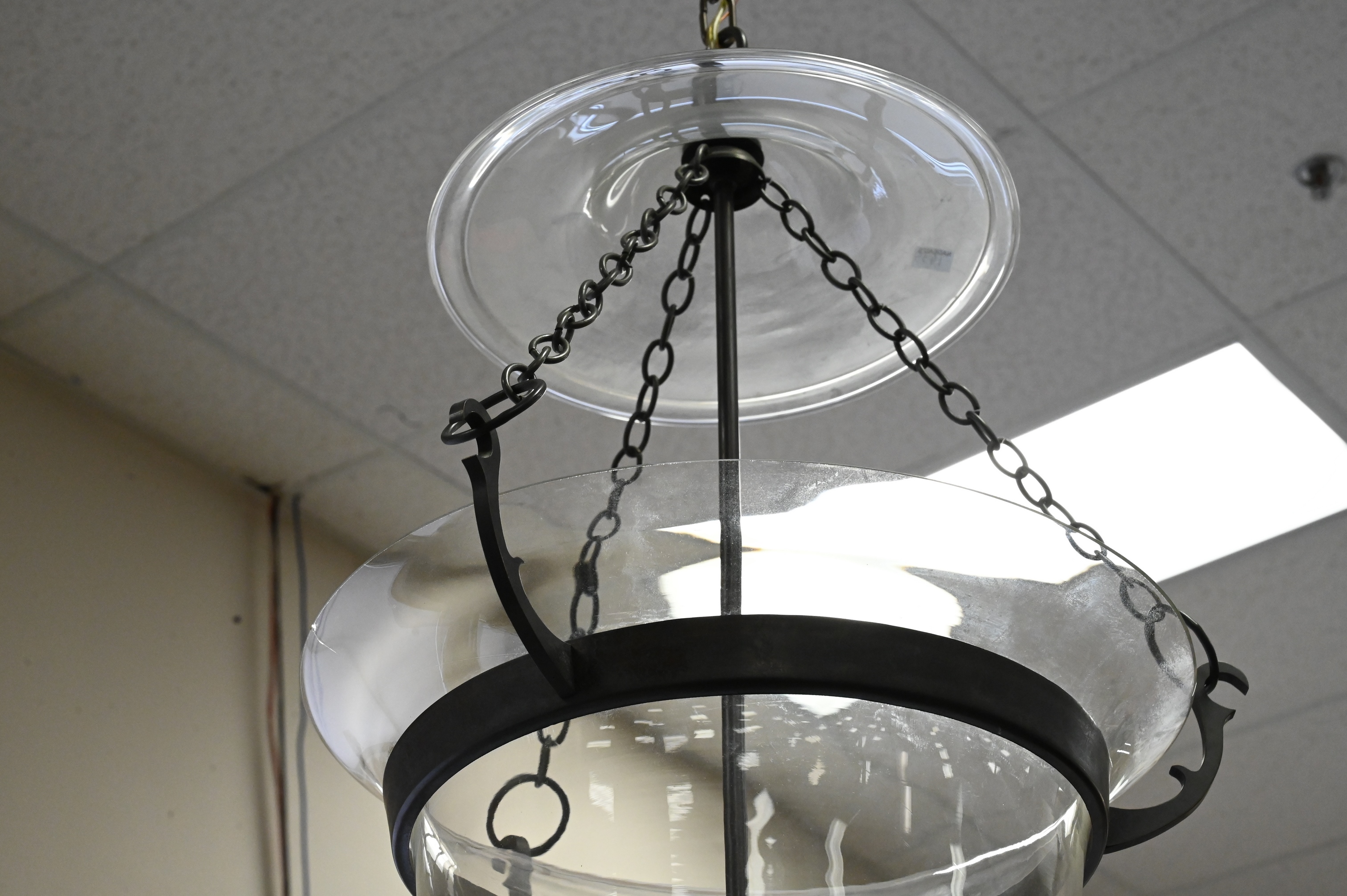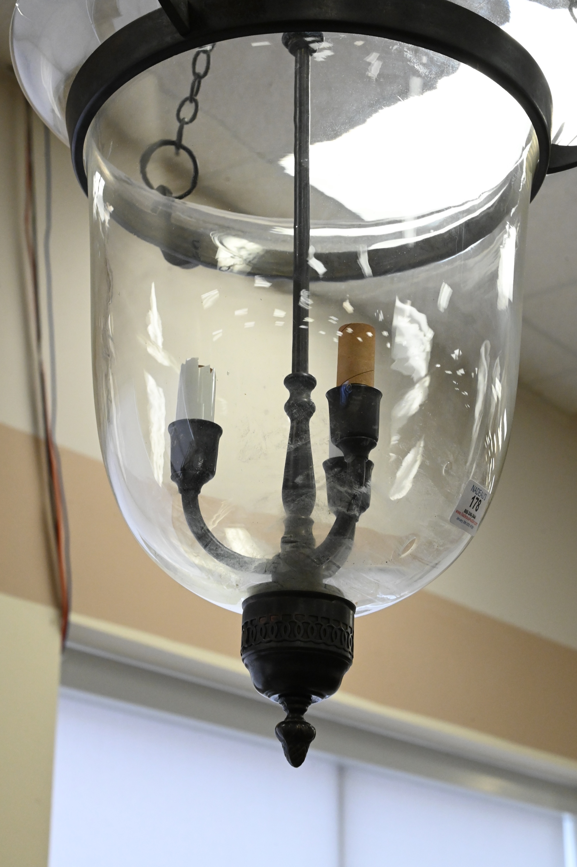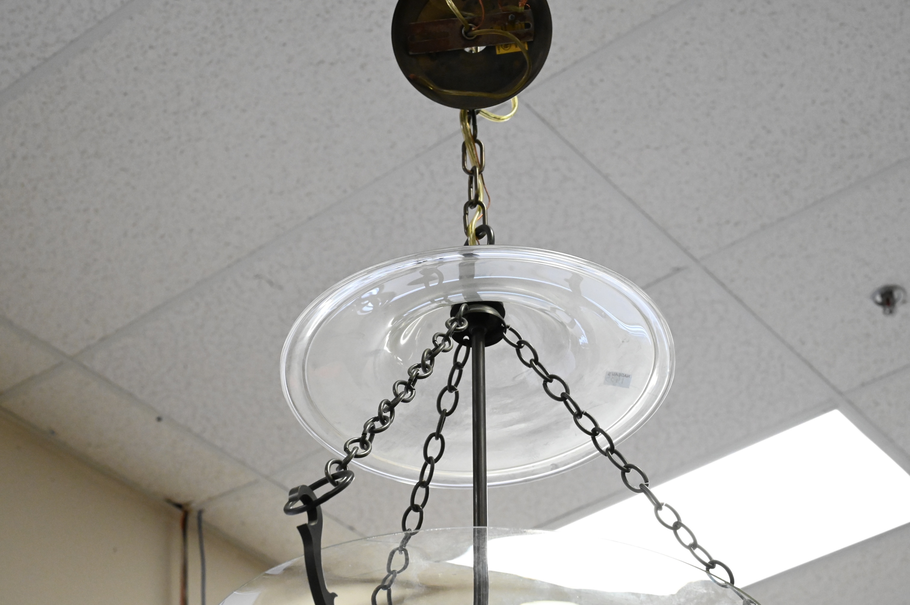 Bell Shaped Three Light Glass Hanging Light/Chandelier, approximate height 32 inches.