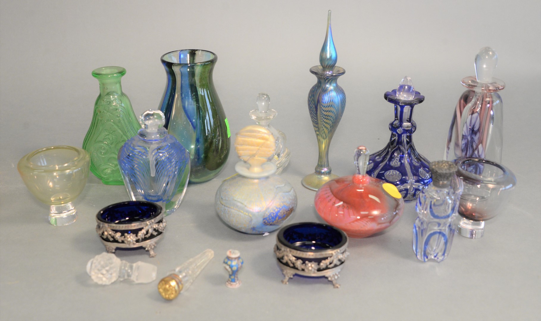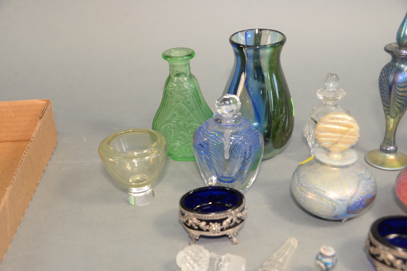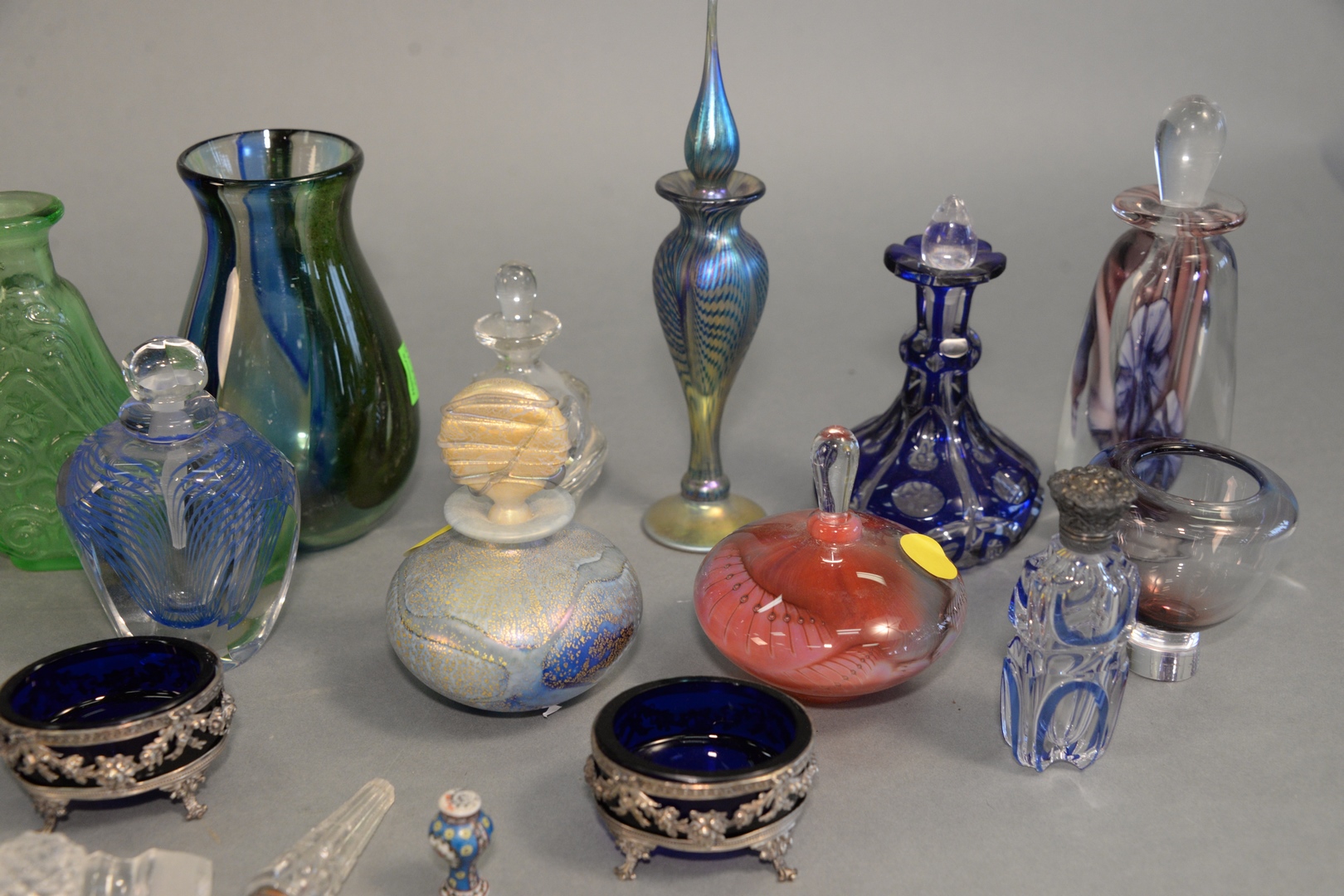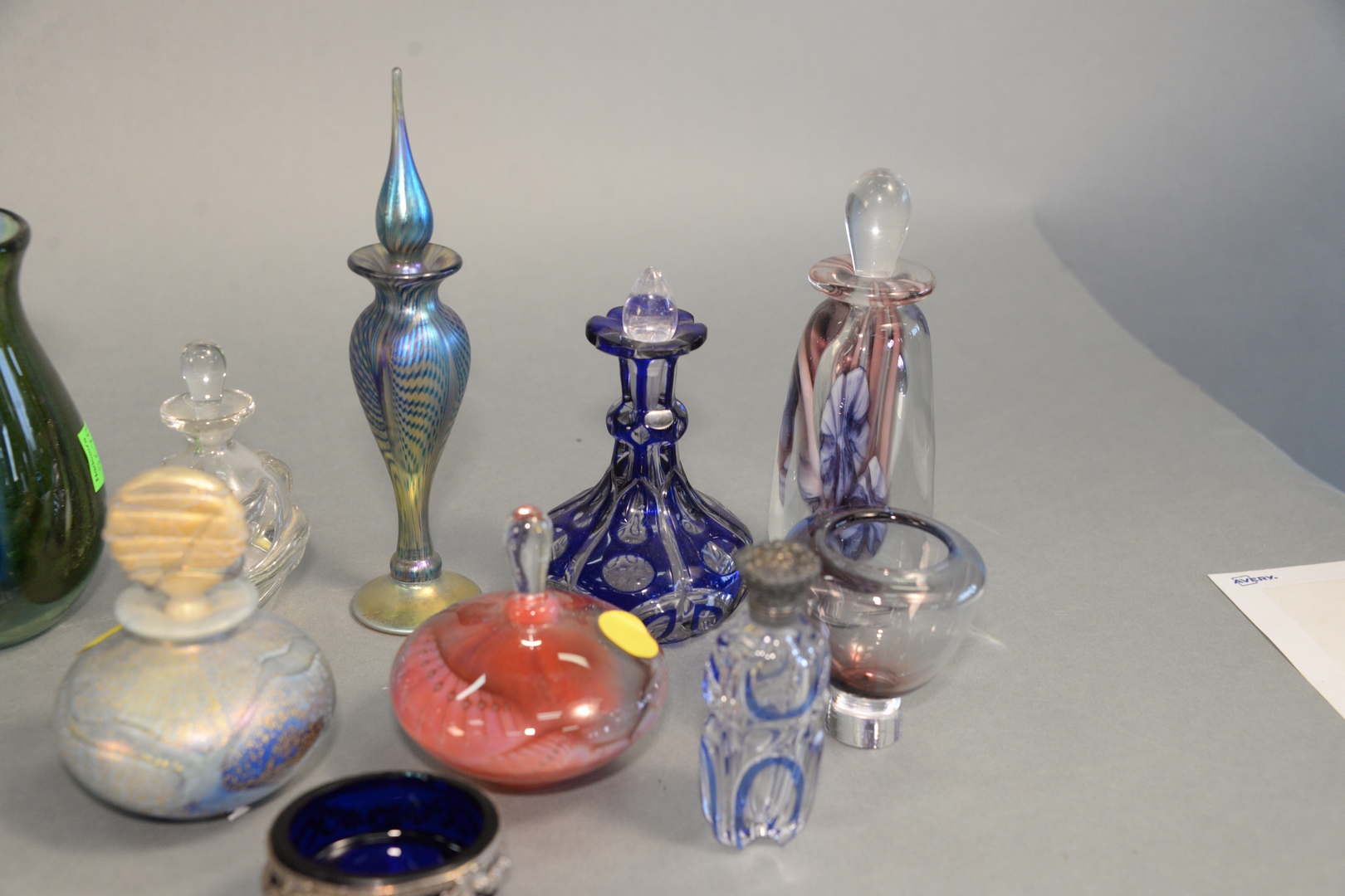 Lot 178: Box Lot of Perfume Bottles and Stoppers to include bottles signed Orrefors, James Clark, and William Glasner highest height 7 1/2 in…
