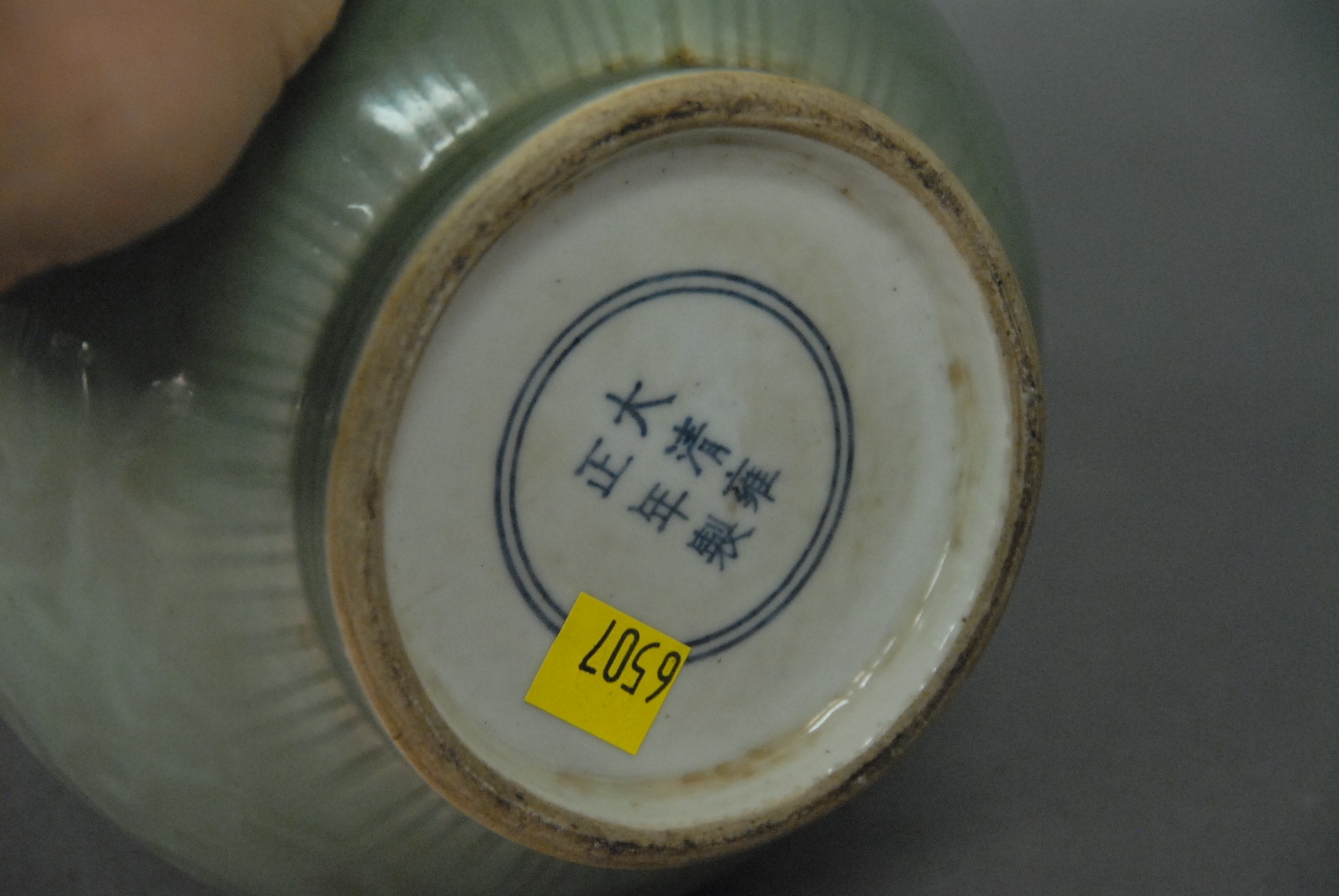 Lot 178: Celadon glazed pear shaped vase with molded foo dog handles and scrolling flower design on the body with Yongzheng mark on bottom, h…