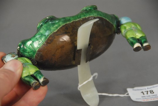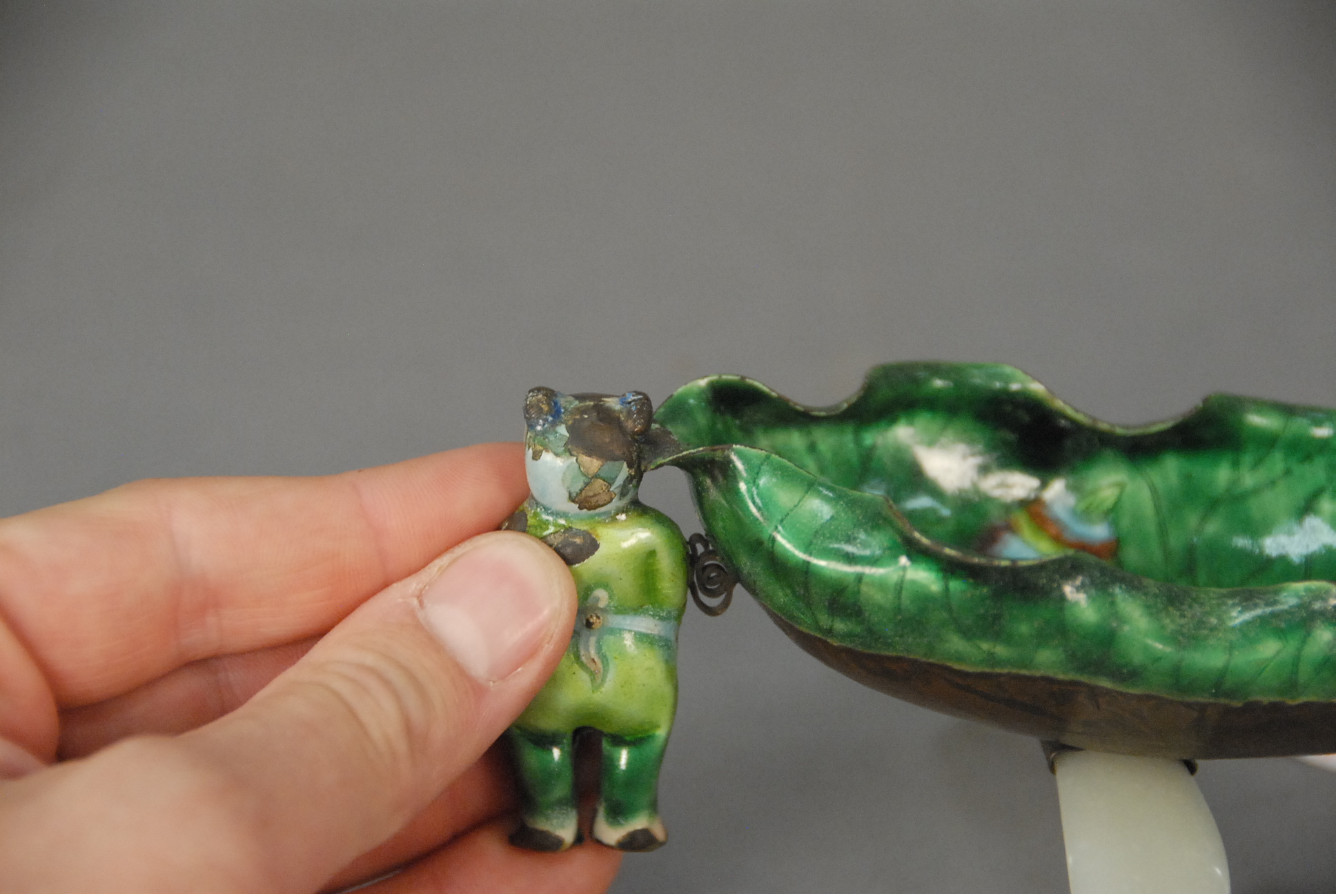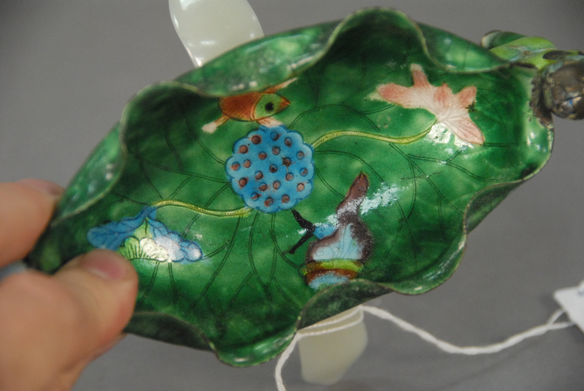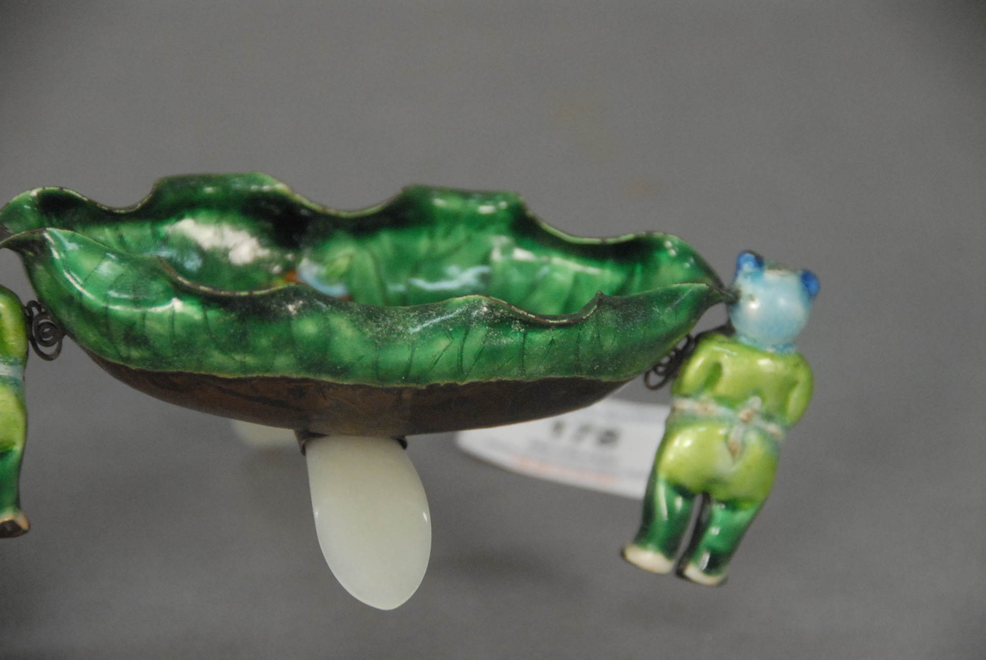 Lot 178: Chinese enameled figural bowl with scalloped rim and full length figure on either side with white jade leg in center. ht. 2 1/2in. lg. 6in.