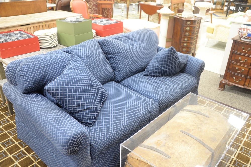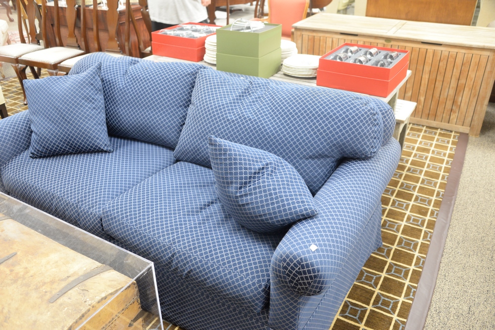 Lot 178: Custom Two Cushion Loveseat, in blue upholstery, height 30 1/2 inches, length 72 inches, depth 36 inches.