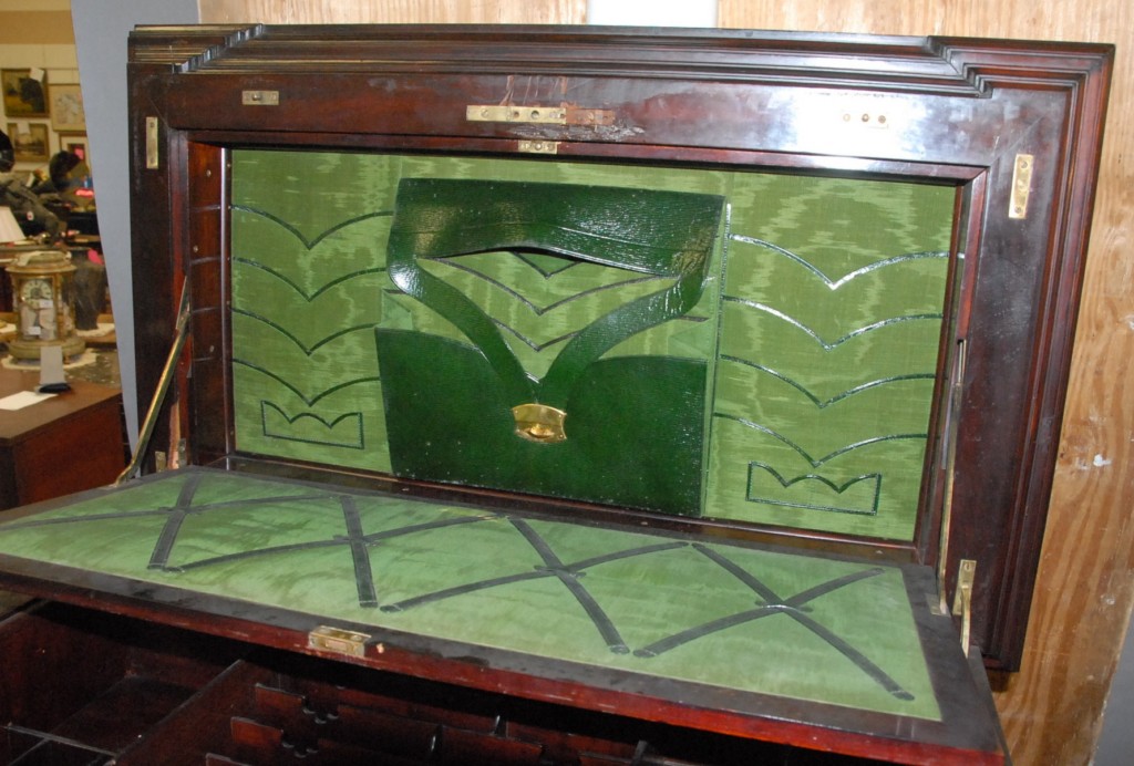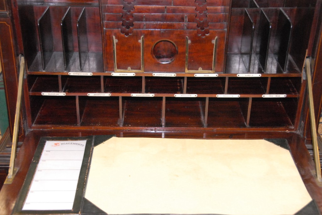 Edwardian mahogany desk in two parts, upper section with lift top opening to reveal green leather compartment over wood compartments and fall front with original leather blotter and porcelain day calendar on base with green leather lined drawers signed J. C. Vickery London. height 52in. width 36in.