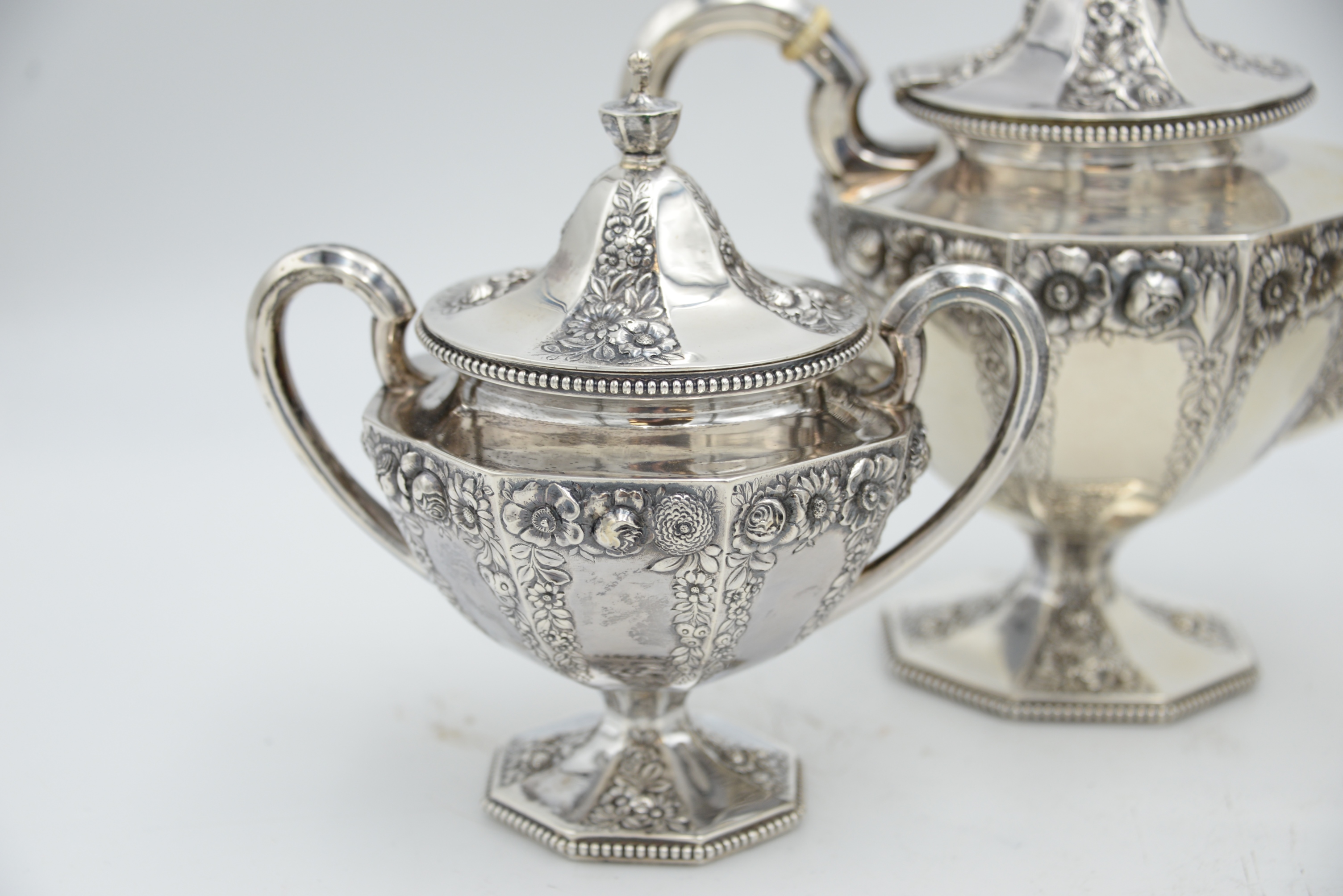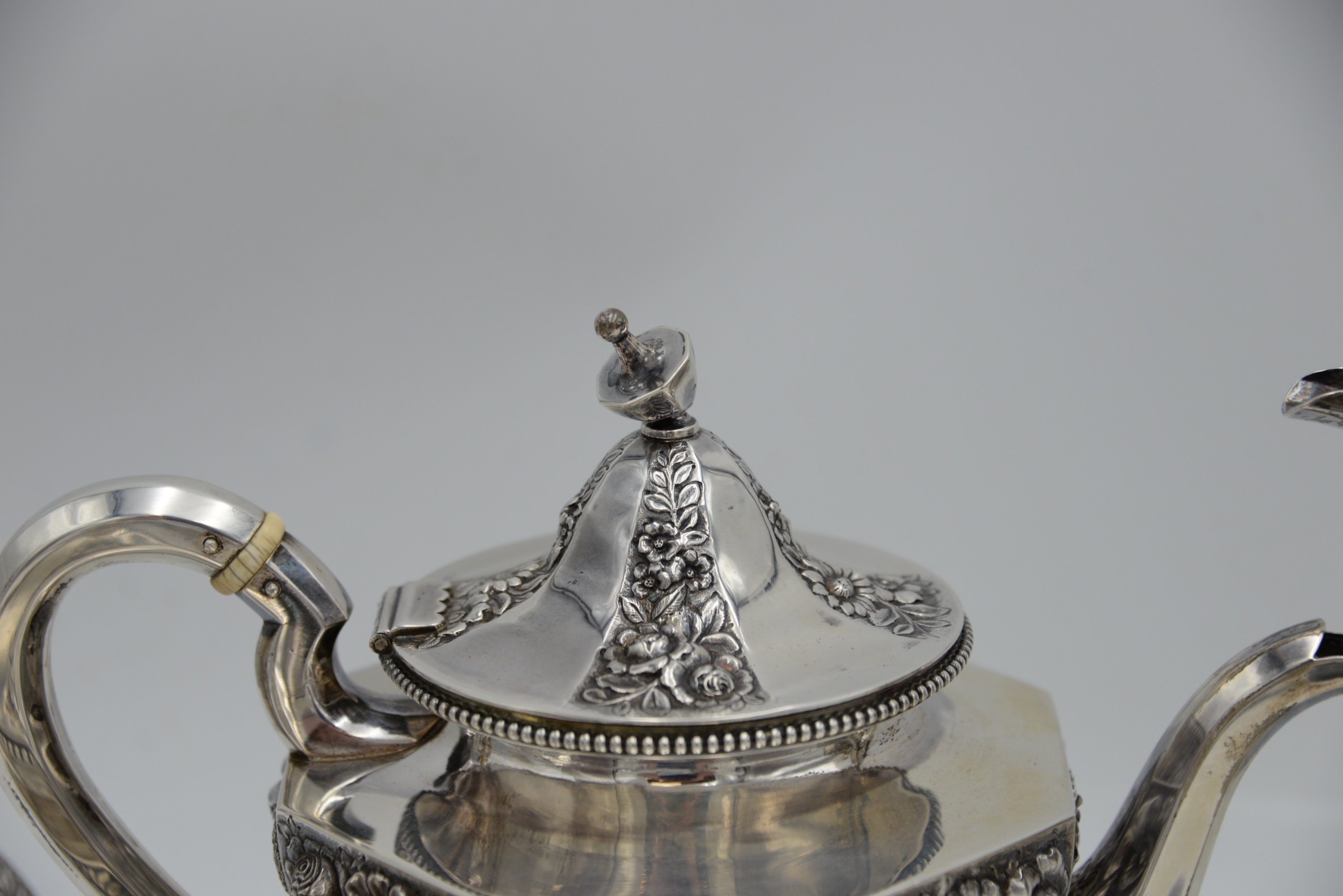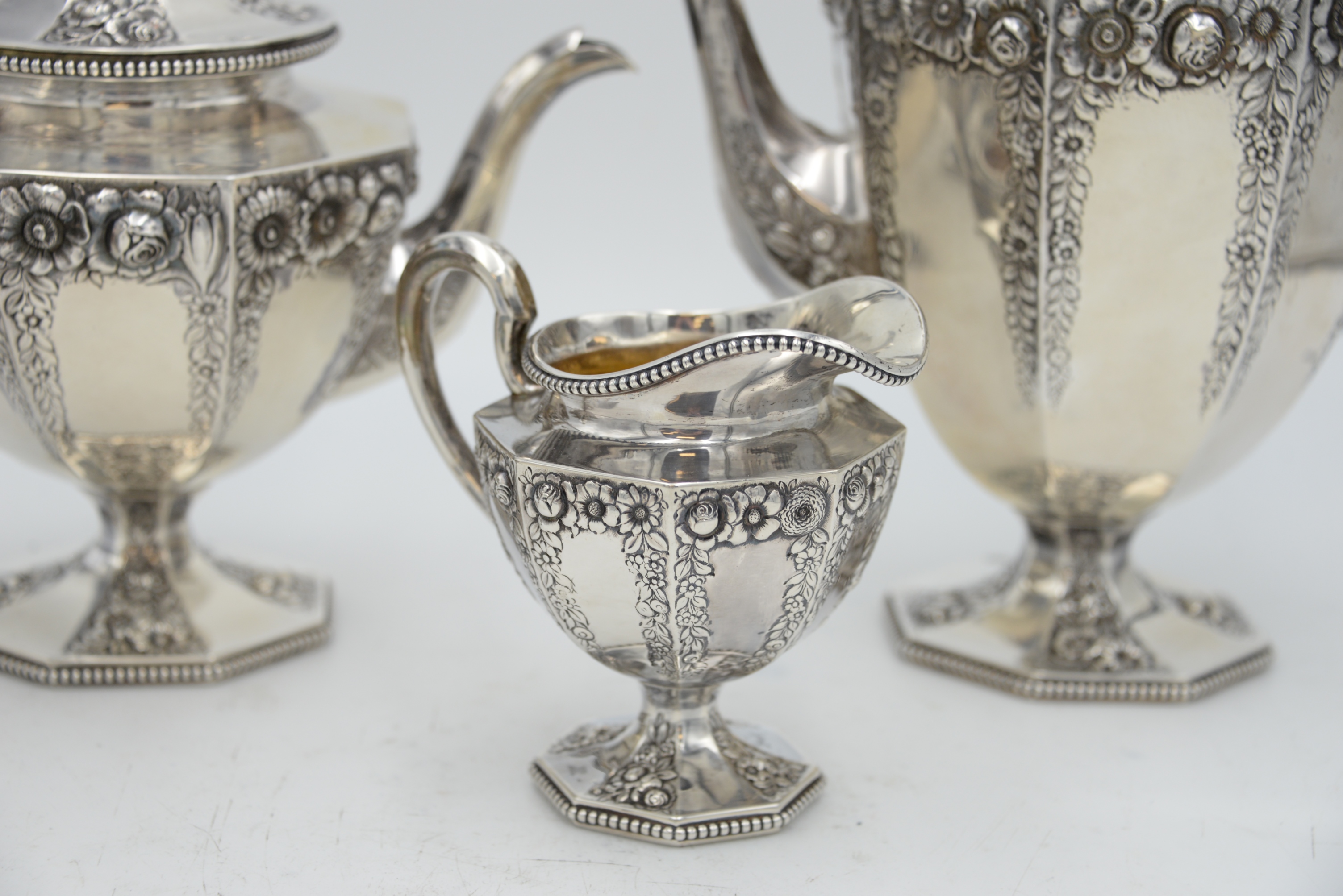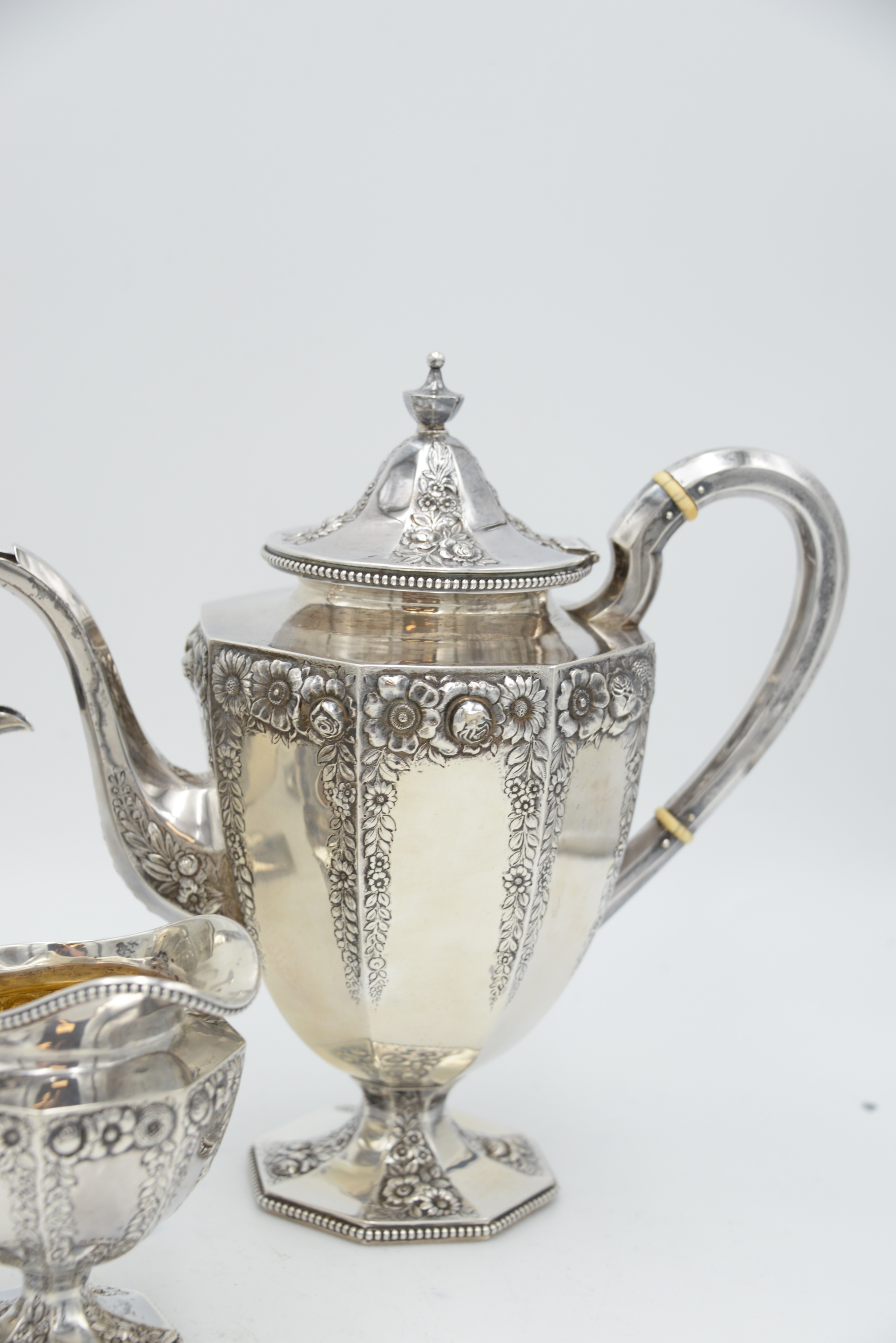 Four Piece Sterling Silver Tea and Coffee Set, having repousse flowers, marked “Mermod Jaccard & Company, St. Louis”, height 4 3/4 – 11 inches, 75.8 t.oz.