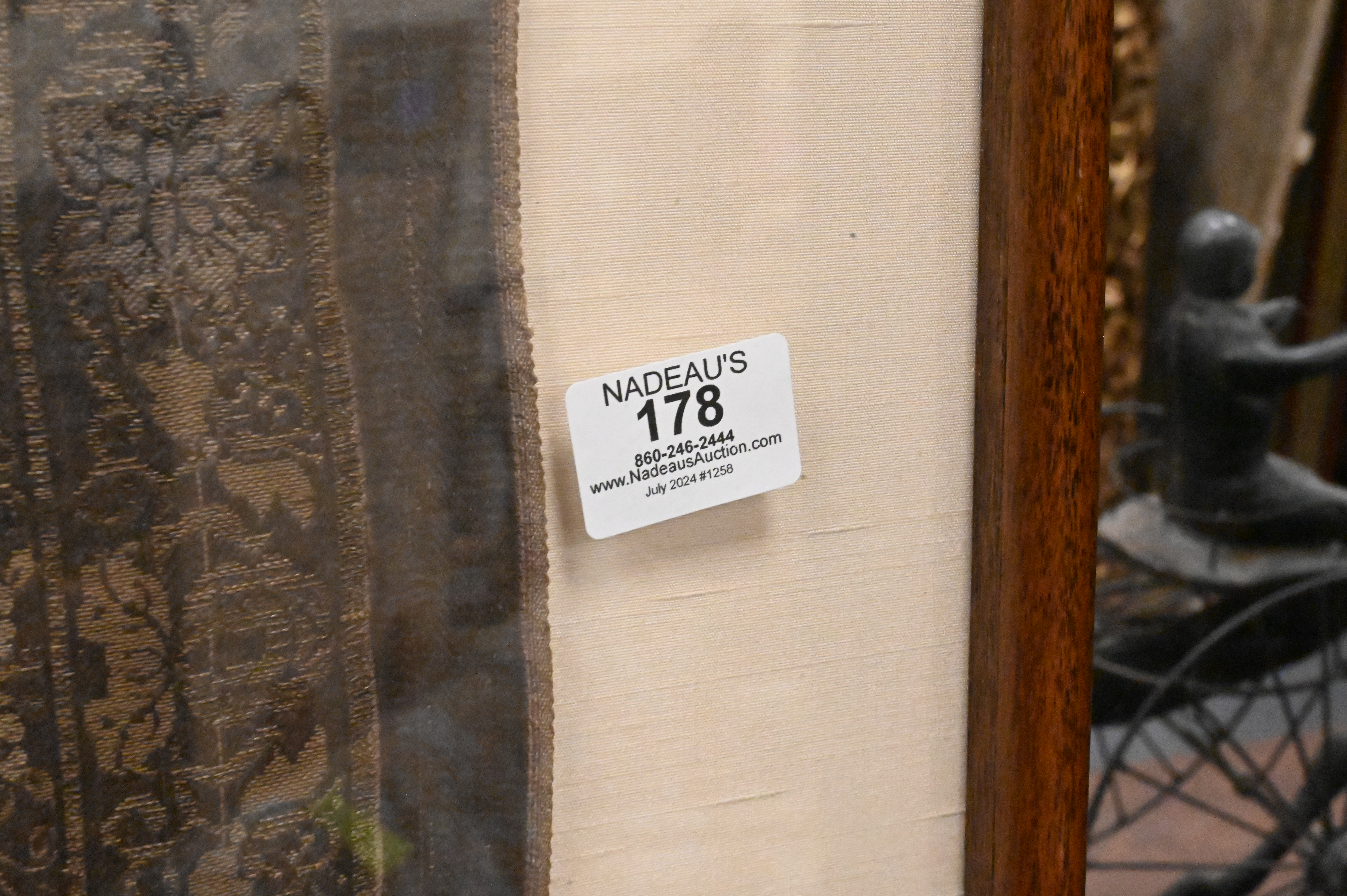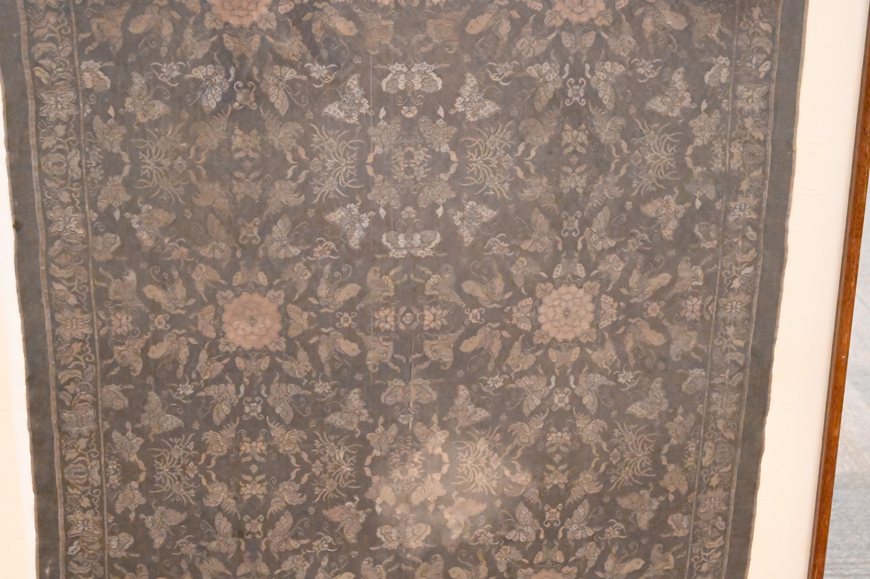 fragment panel, silk embroidered having butterfly lotus flower motif in custom wood frame with silk border