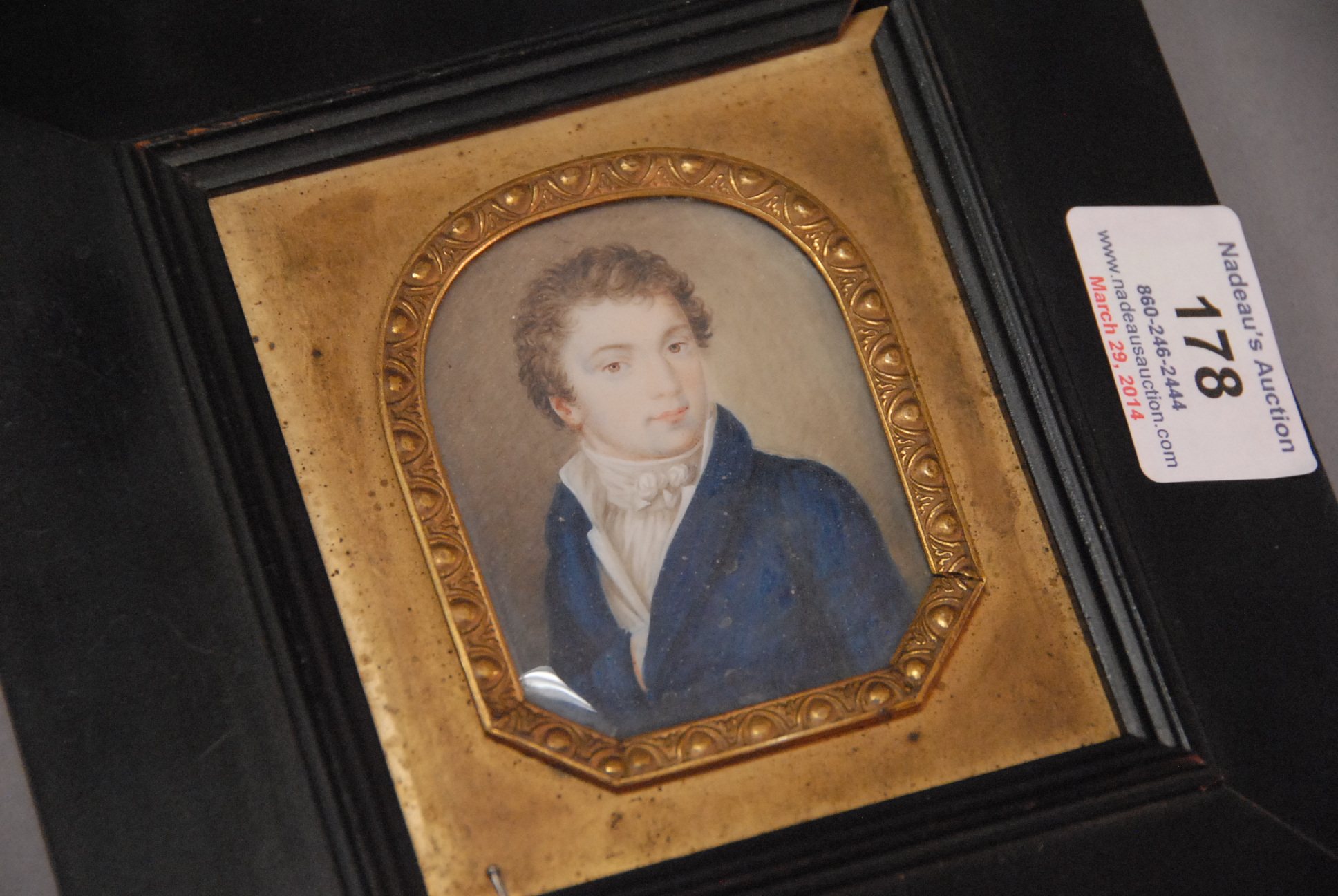 Miniature painting in brass frame of gentleman in blue coat. 2 1/2 x 2