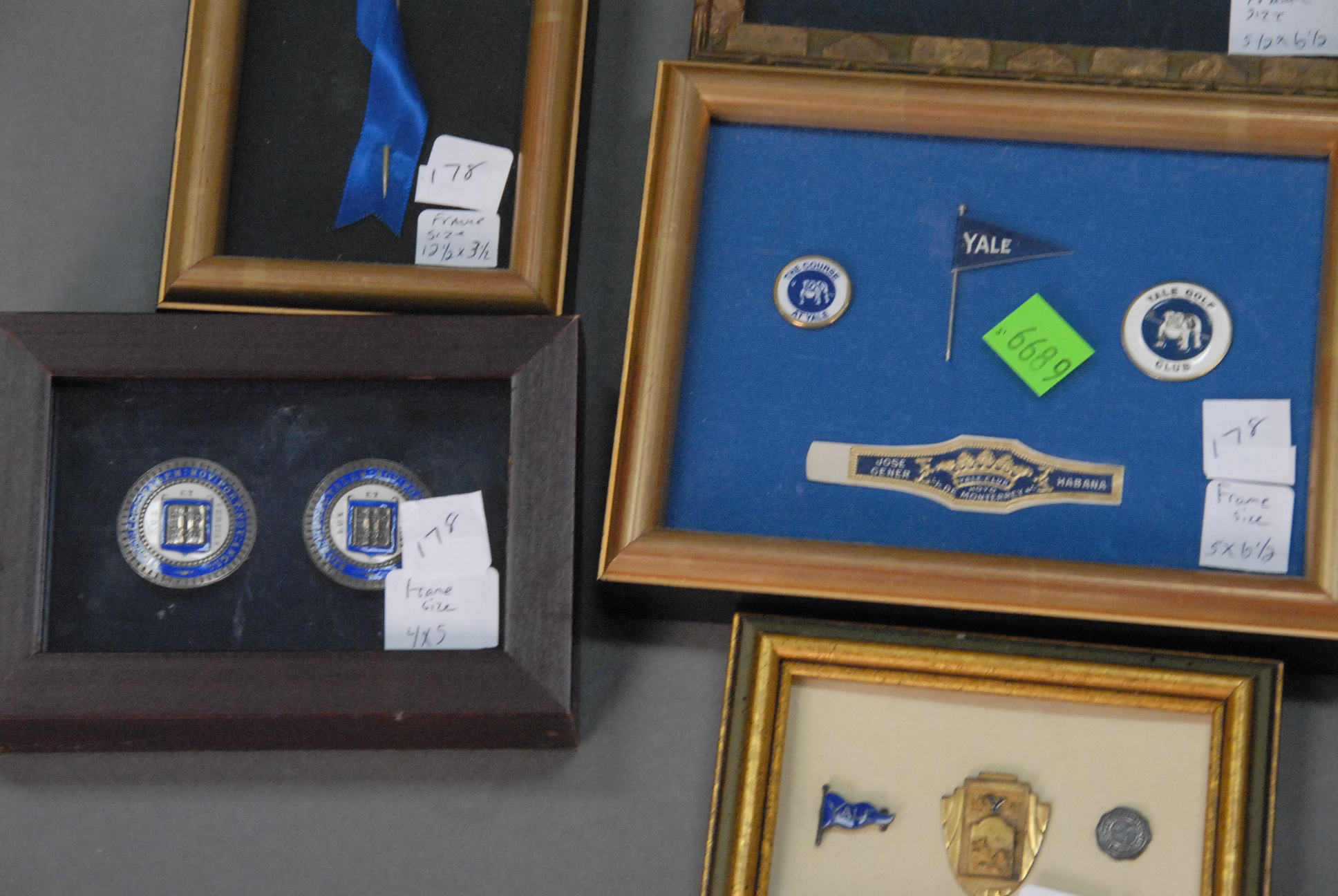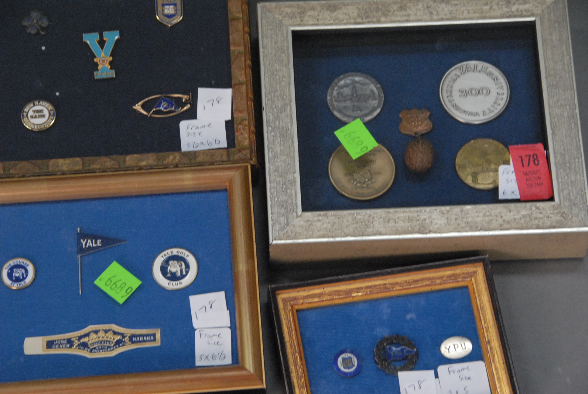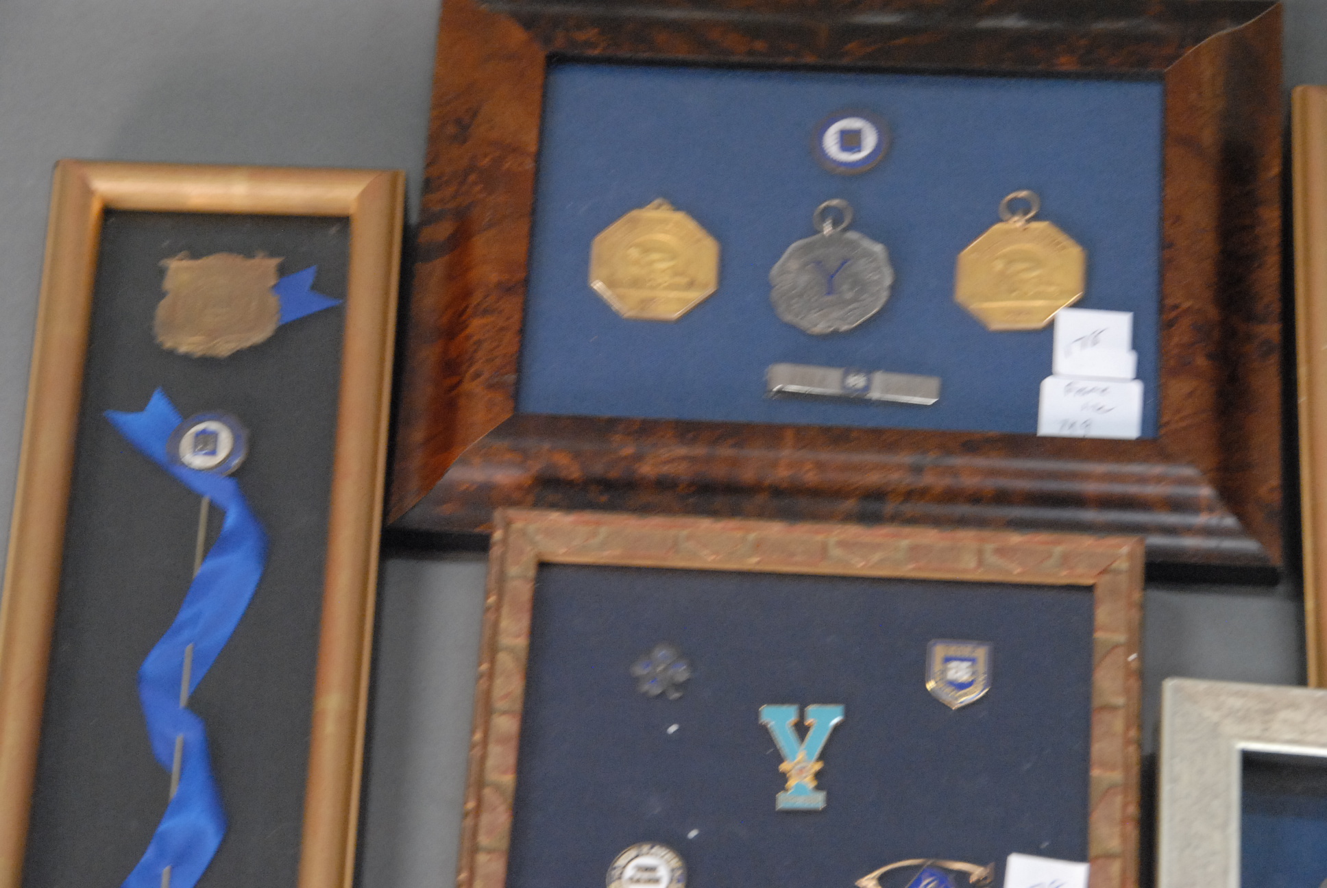 Lot 178: Nine piece framed lot silver and enameled robe clips, several medals and enameled medals, frame sizes 3 x 5 to 7 x 9.