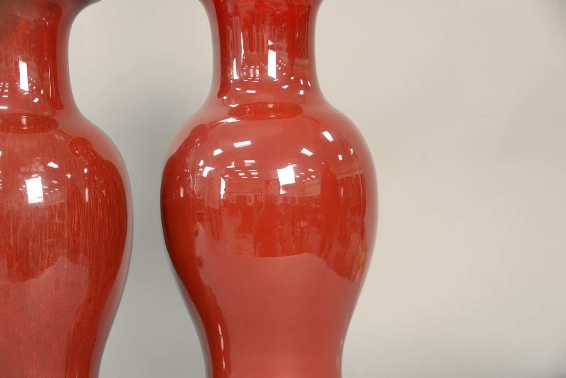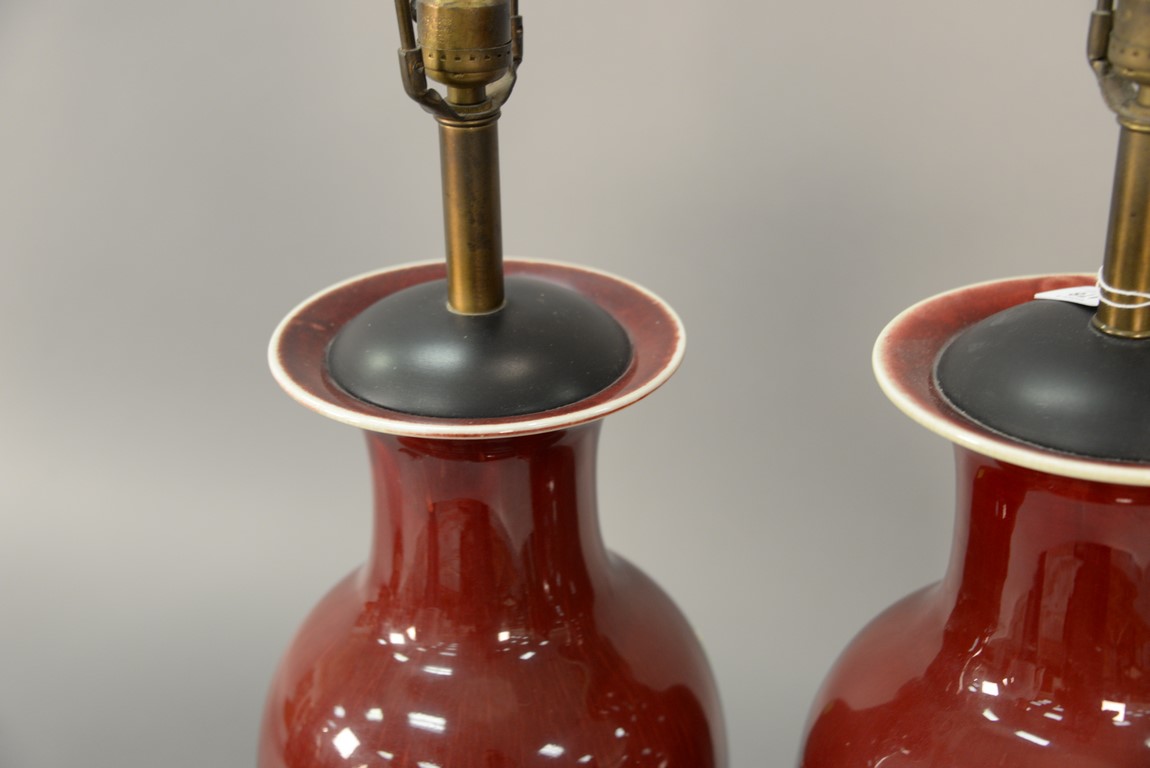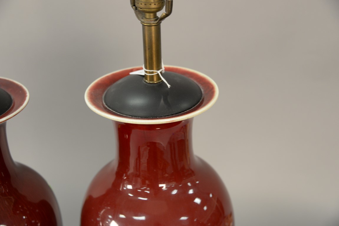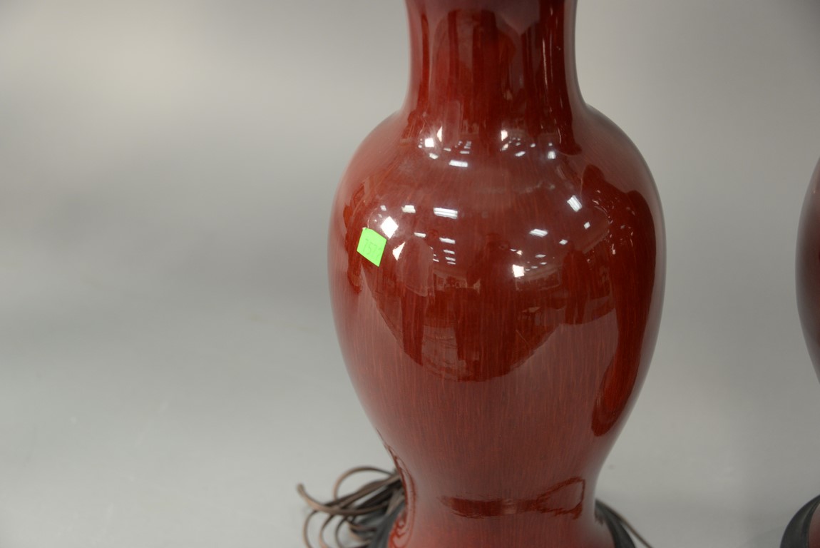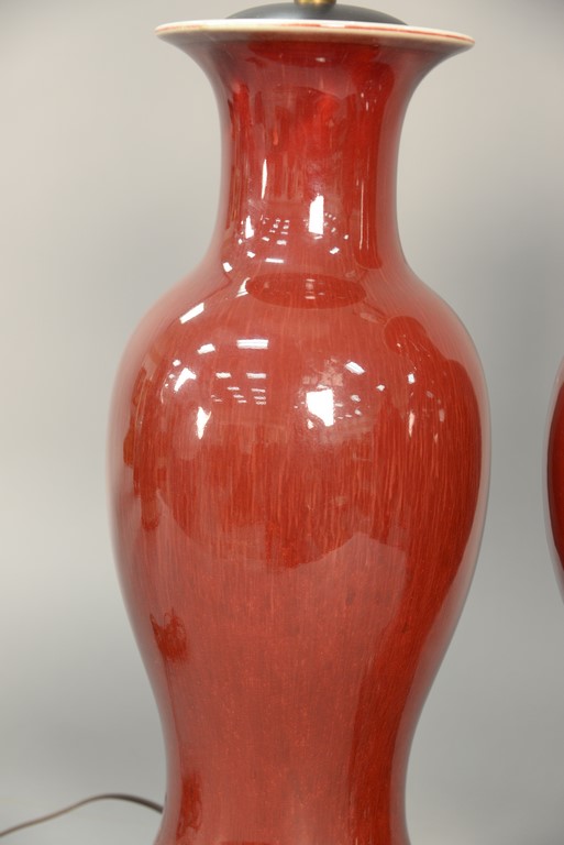 Lot 178: Pair of Chinese oxblood glazed porcelain vases in baluster shape with trumpet form top, both made into table lamps. vase ht. 18 in. total ht. 37 1/2 in.