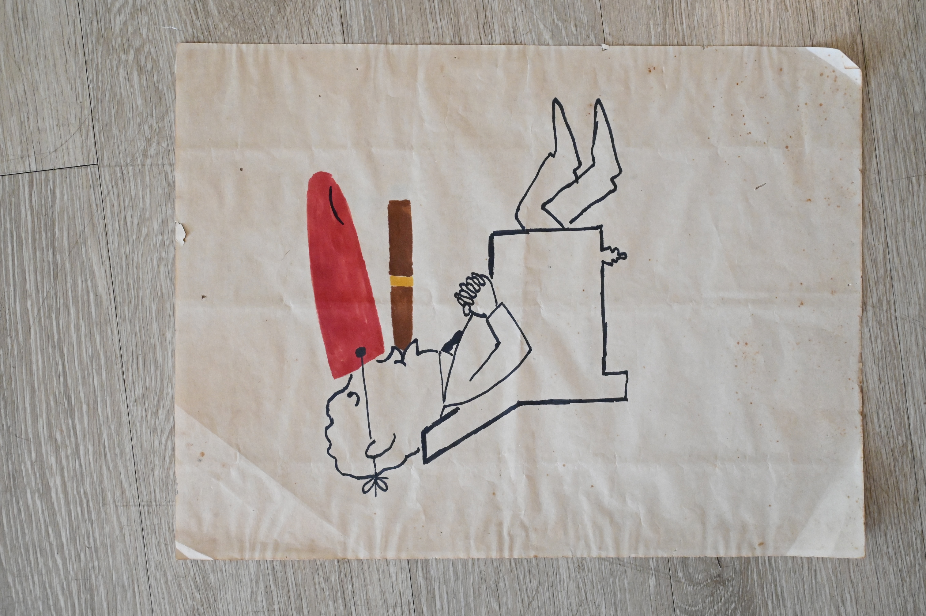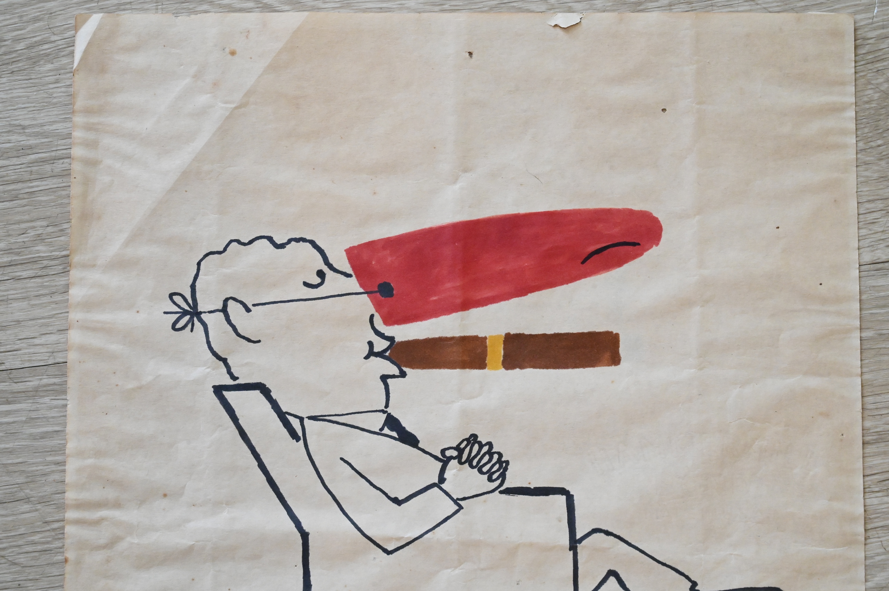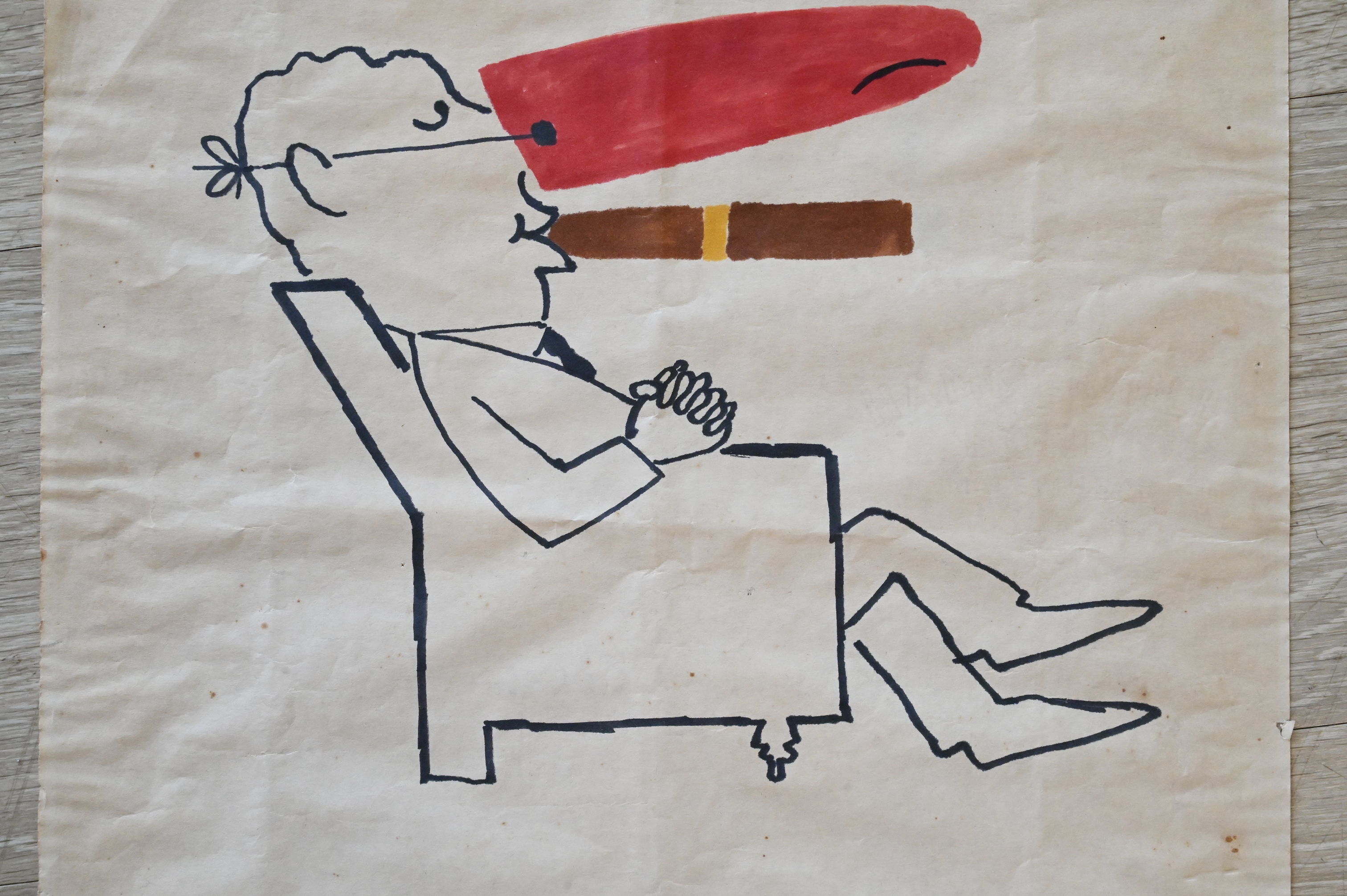 Cigar Chair, man reclining while smoking a cigar wearing a fake nose