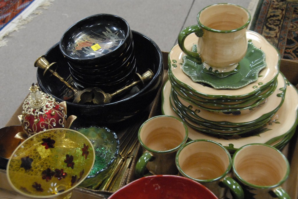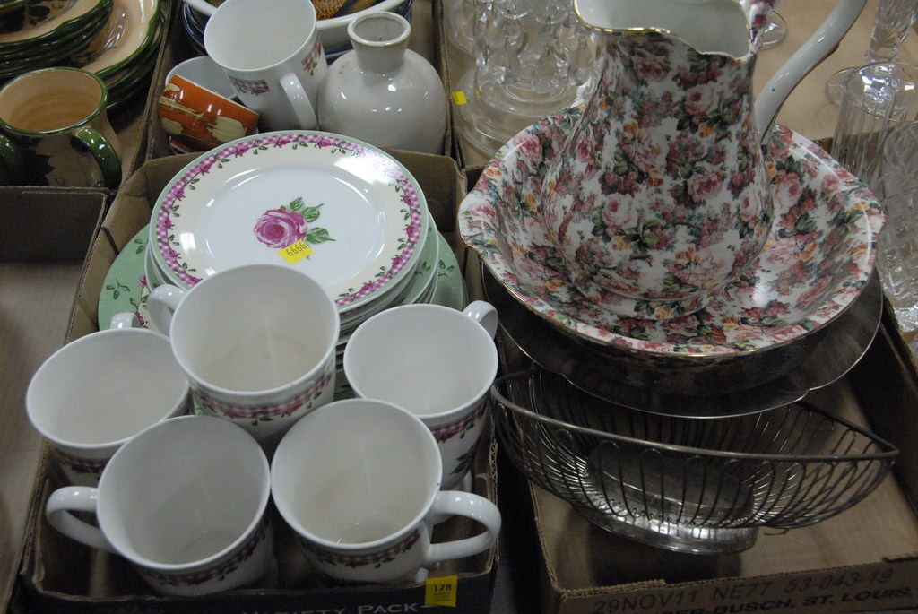 Seven box lots of contemporary pottery, china, lacquerware, pitcher and bowl, etc.