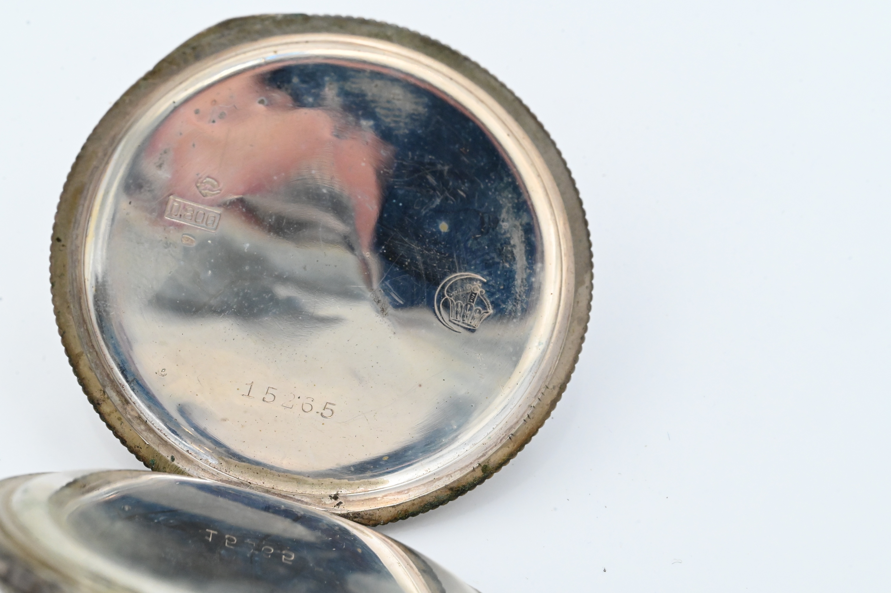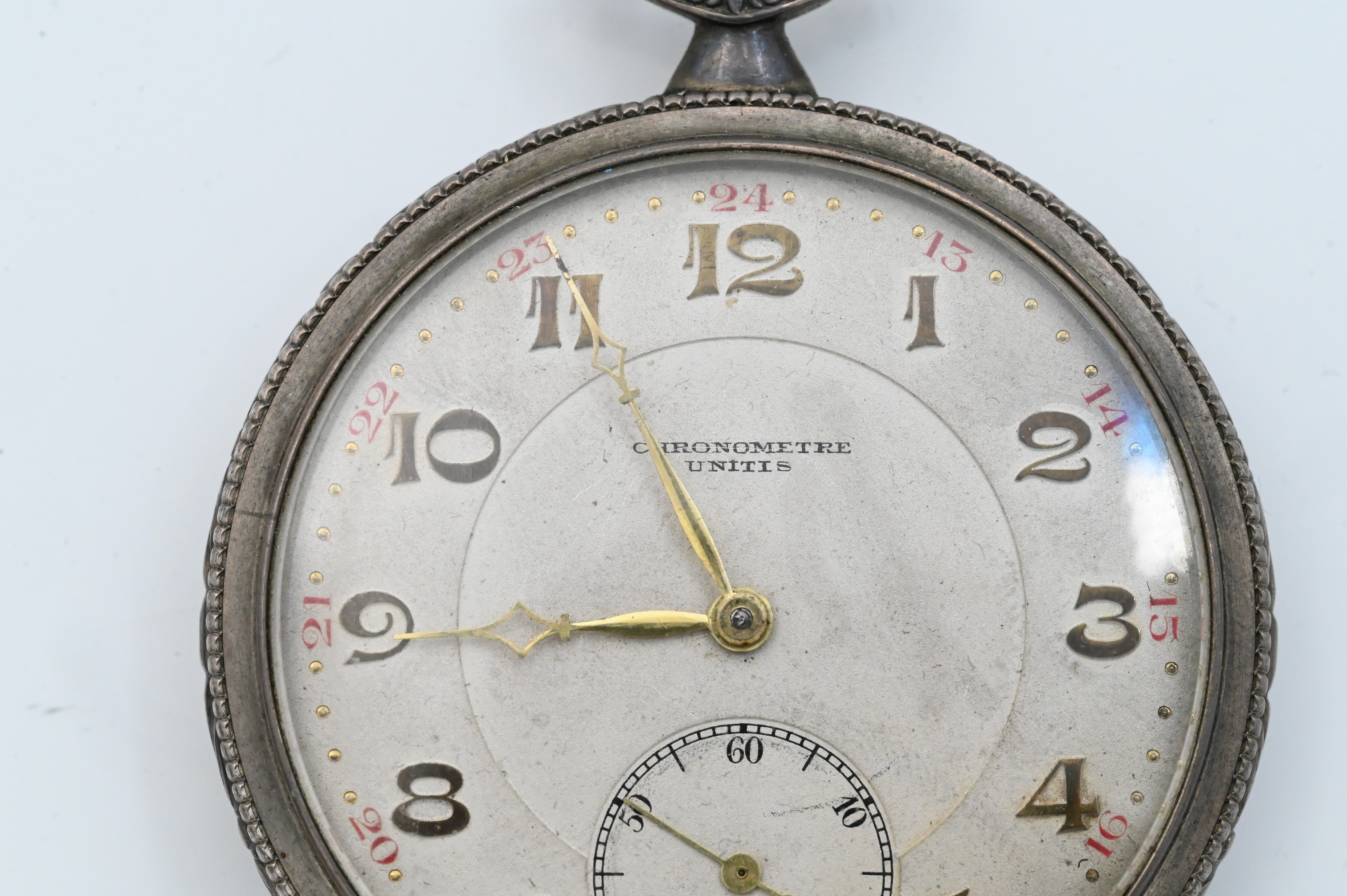 Marked Chronomètre Unité to the dial, with Arabic numerals, subsidiary seconds dial, and gilt hands within a silver case stamped 800 and numbered 1565. The interior case bears additional Swiss hallmarks.