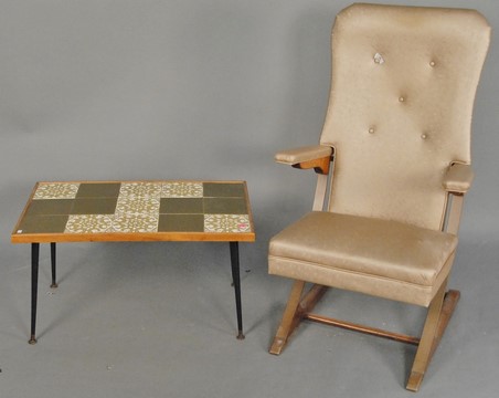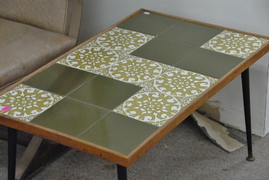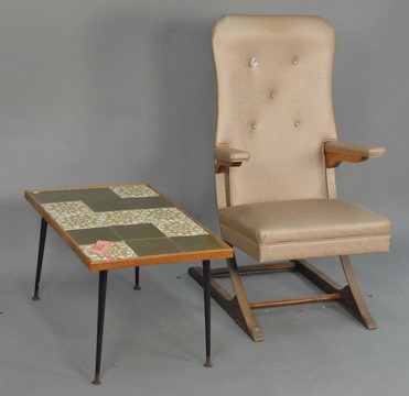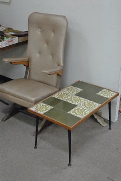 Tile top avocado coffee table and a spring armchair.