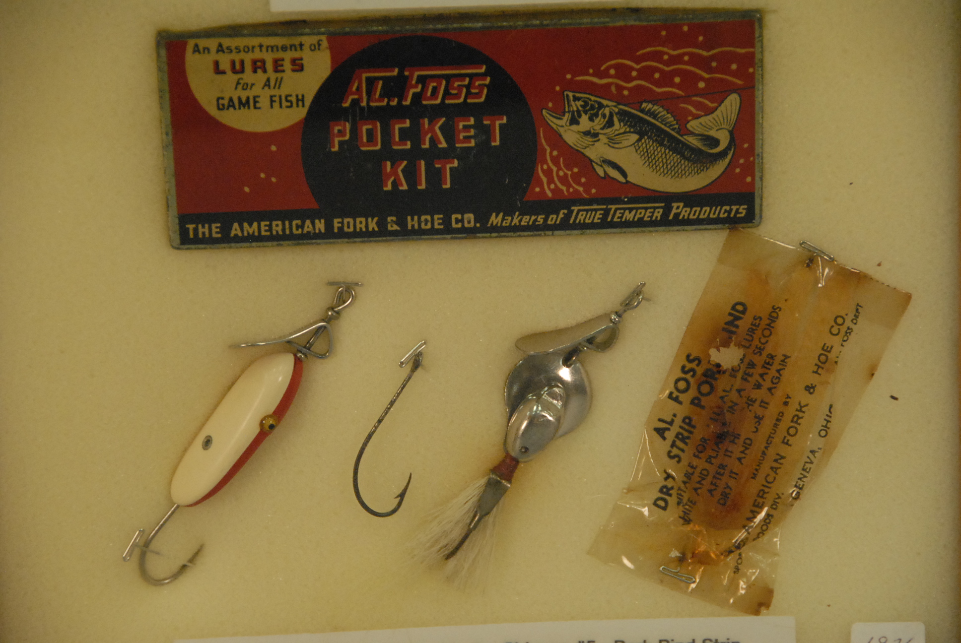 Two cases with Al Foss Pocket Kit with Oriental Wiggler, spare hook, and Shimmy #5, and a pork rind strip along with a salt water super lure.
