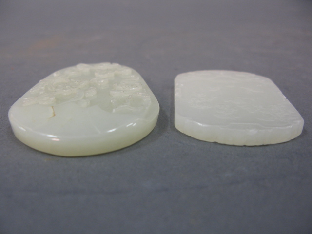 Two jadeite pendants one of boys playing and the other carved with bird in three.