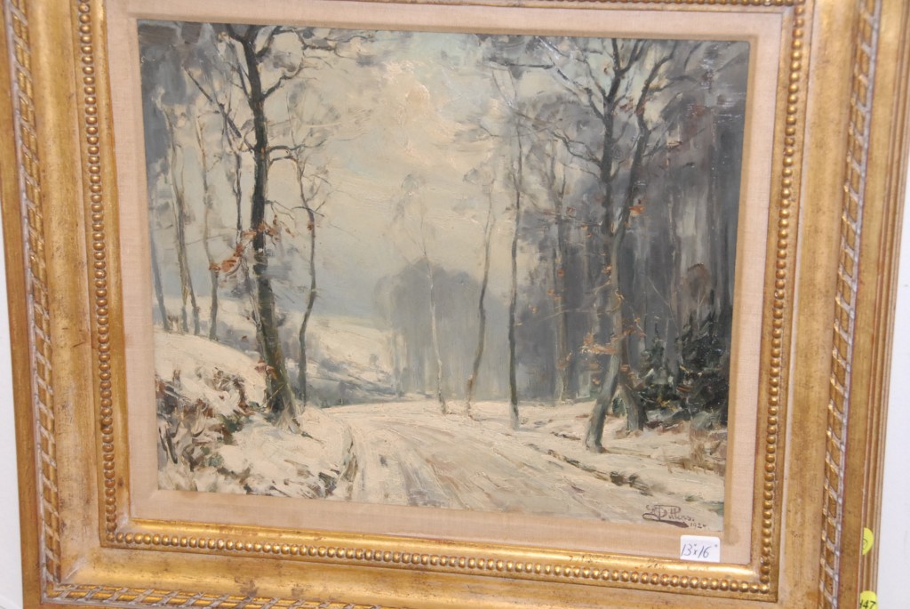 Two winter landscapes oil on canvas by J. J. Rukund 14 x 19 and oil on board painting by A. Dippers 13 x 16