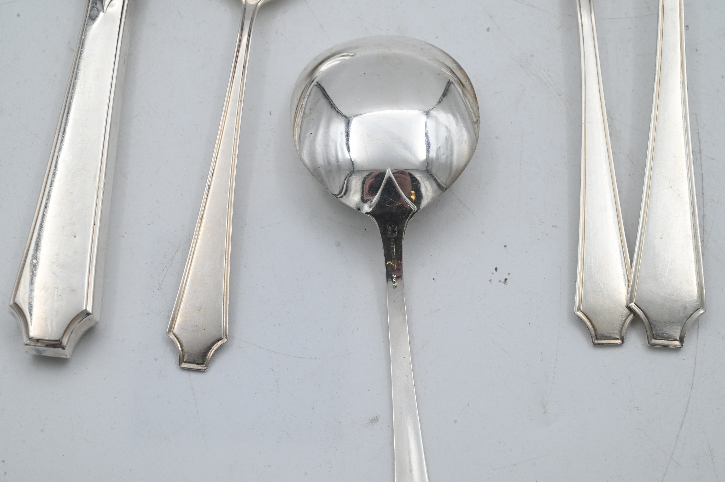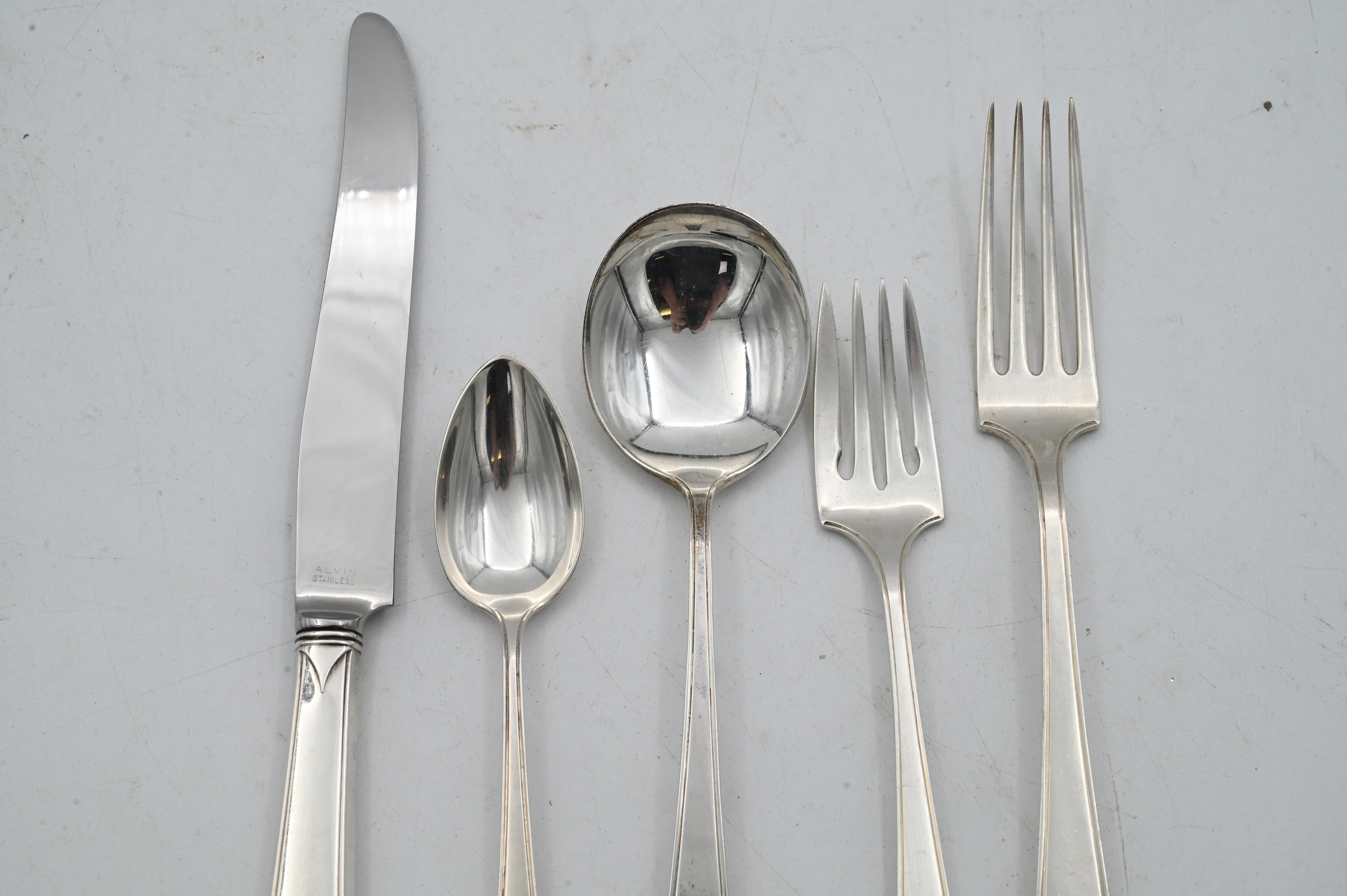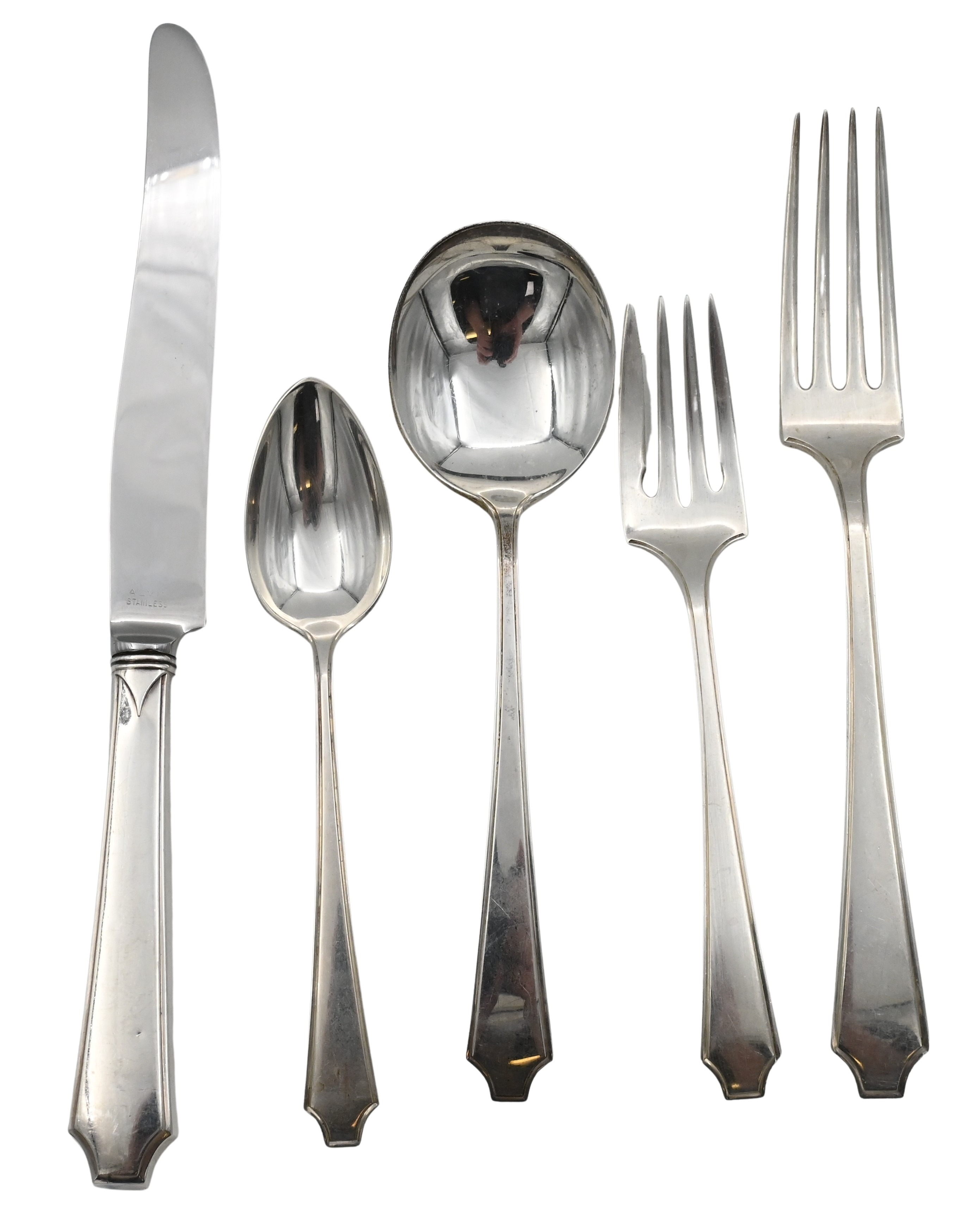 to include 12 dinner forks, 12 salad forks, 12 soup spoons, 24 teaspoons, 4 place spoons, 1 ice tea spoon, 12 dinner knives, 12 butter knives, and 7 serving pieces
