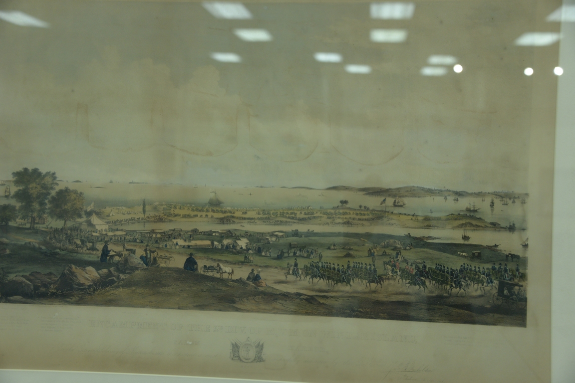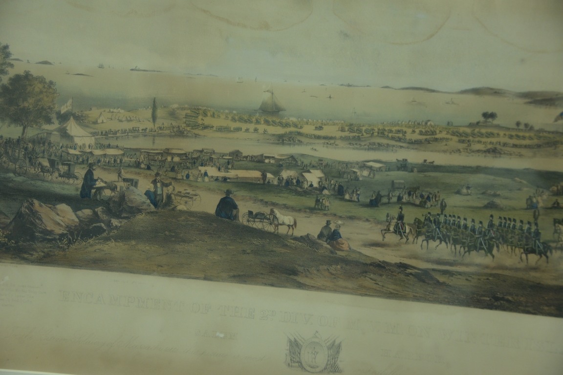 Lot 179: After Jonathan Badger Bachelder 1825-1894 handcolored lithograph Encampment of the 2nd Div. of M.V.M. on Winter Island, Salem Har…