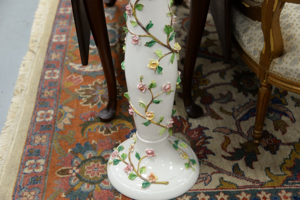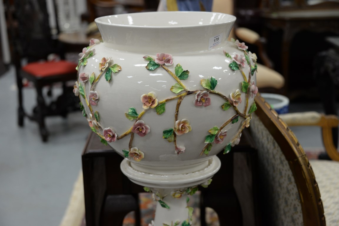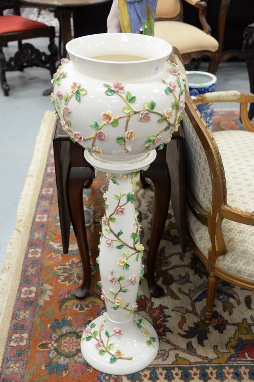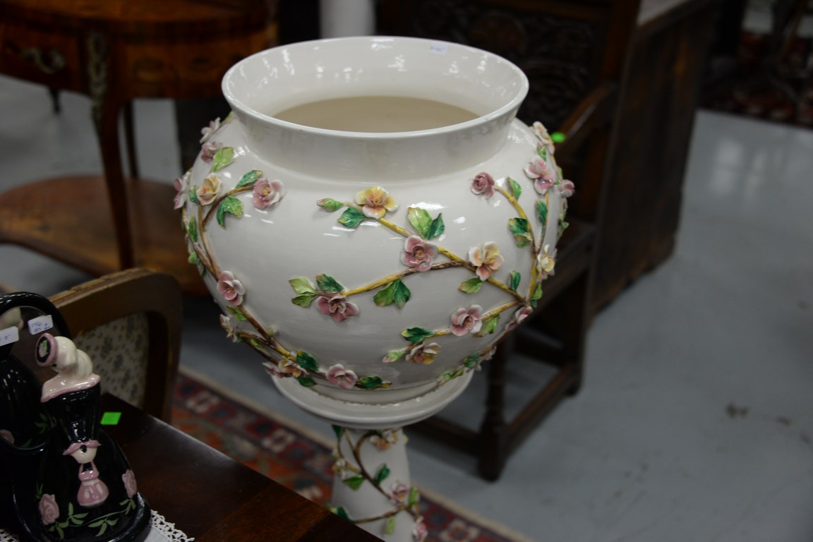 Ceramic planter on stand with applied flowers.