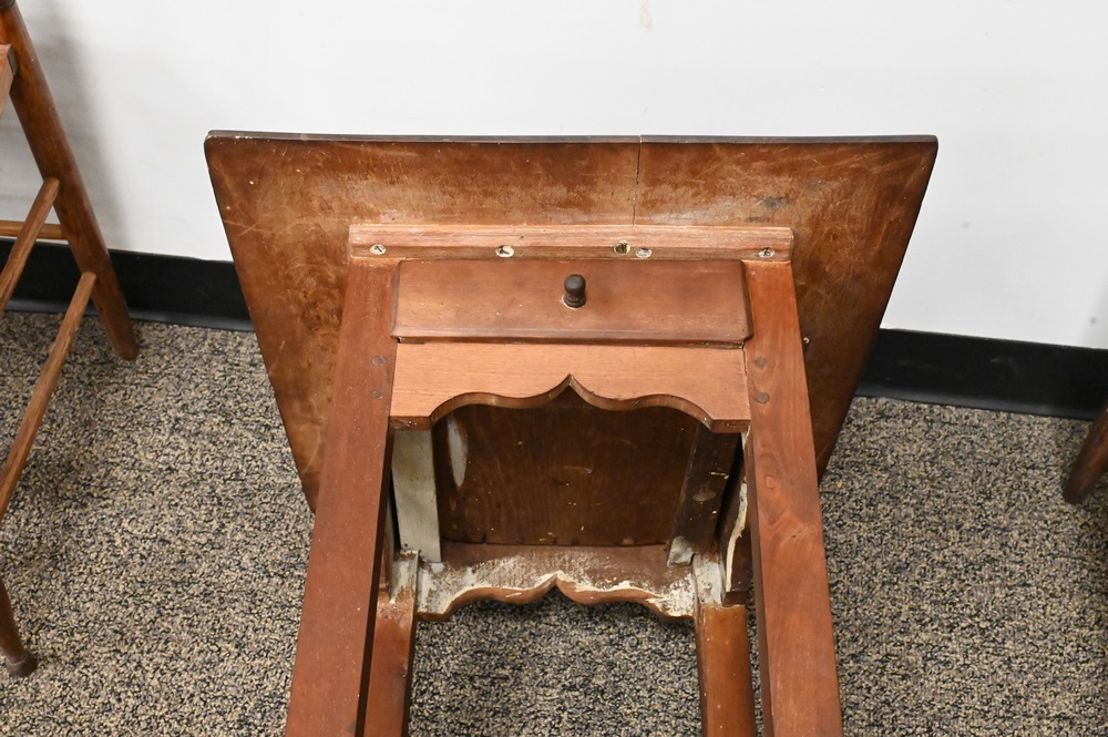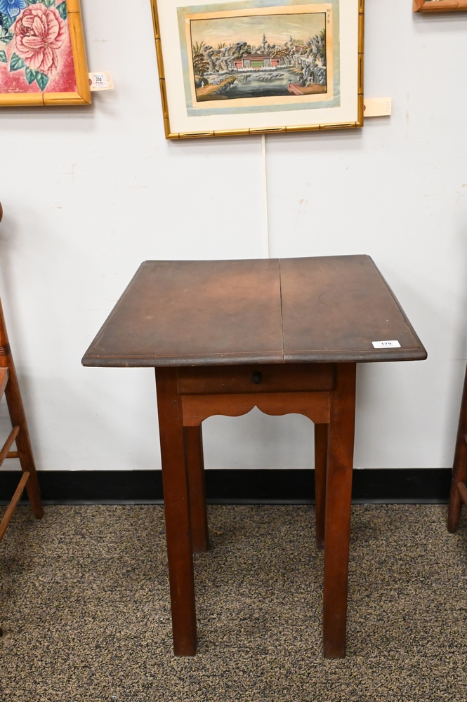 Lot 179: Chippendale Cherry Side Table, having large overhanging top over one drawer, over scalloped skirt, set on squared legs, circa 1760, height 27 inches, depth 45 inches, top 20″ x 22 1/2″. Provenance: Estate of Florence Yannios, Waterfront Home, Guilford, CT.