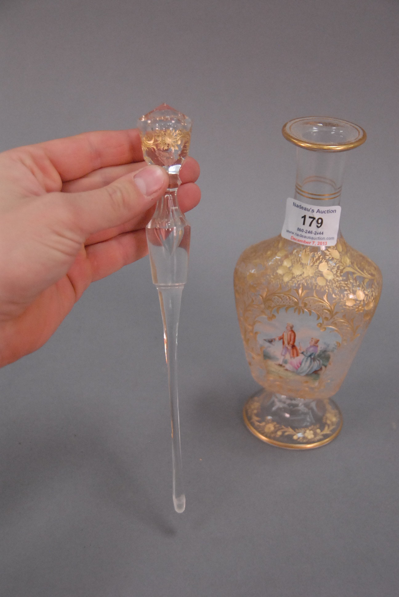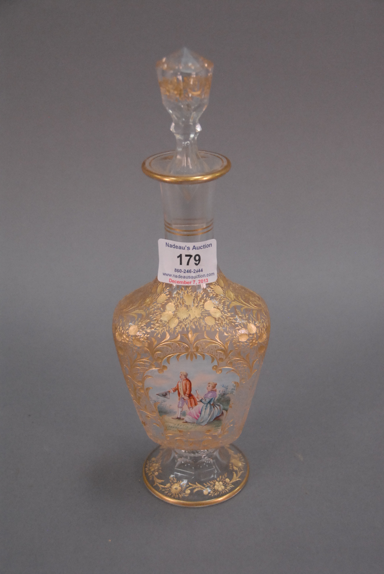 Crystal bottle with etched gold decoration and hand painted panels, ht. 11in.