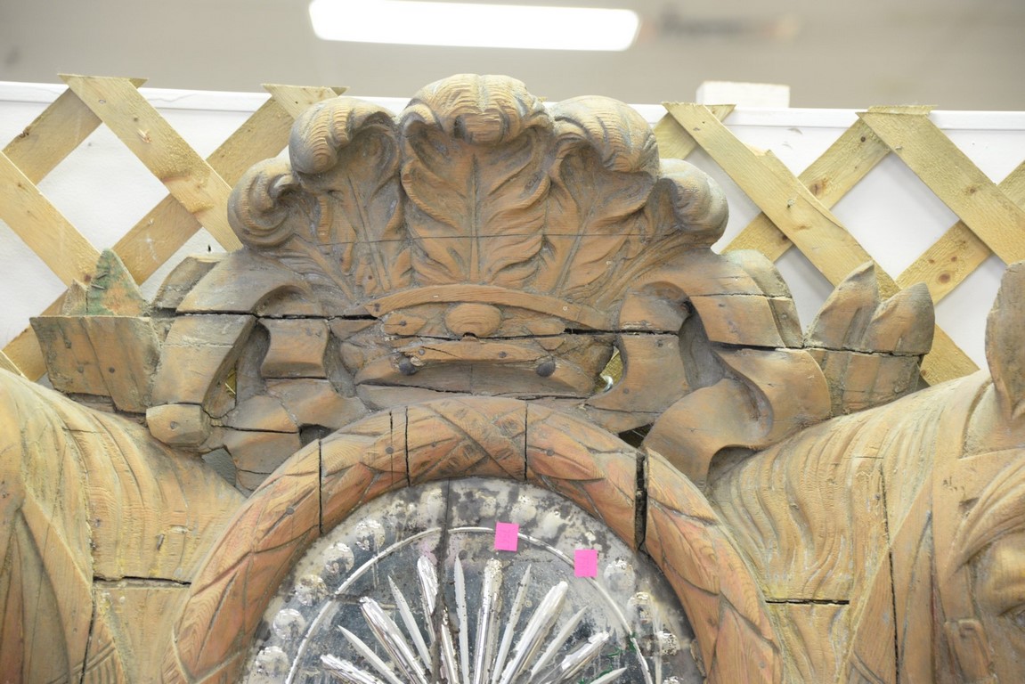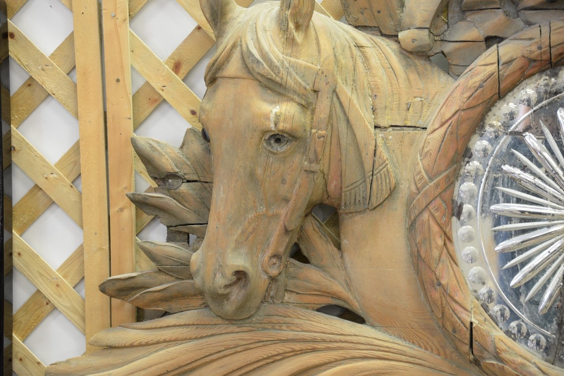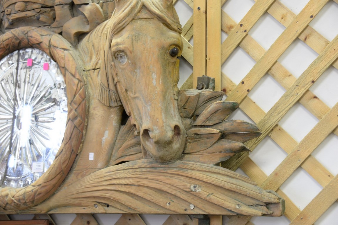 Lot 179: Decorative oval mirror with pine frame having large horse heads, possibly from a carousel mirror as is. ht. 33 in. wd. 60 in.