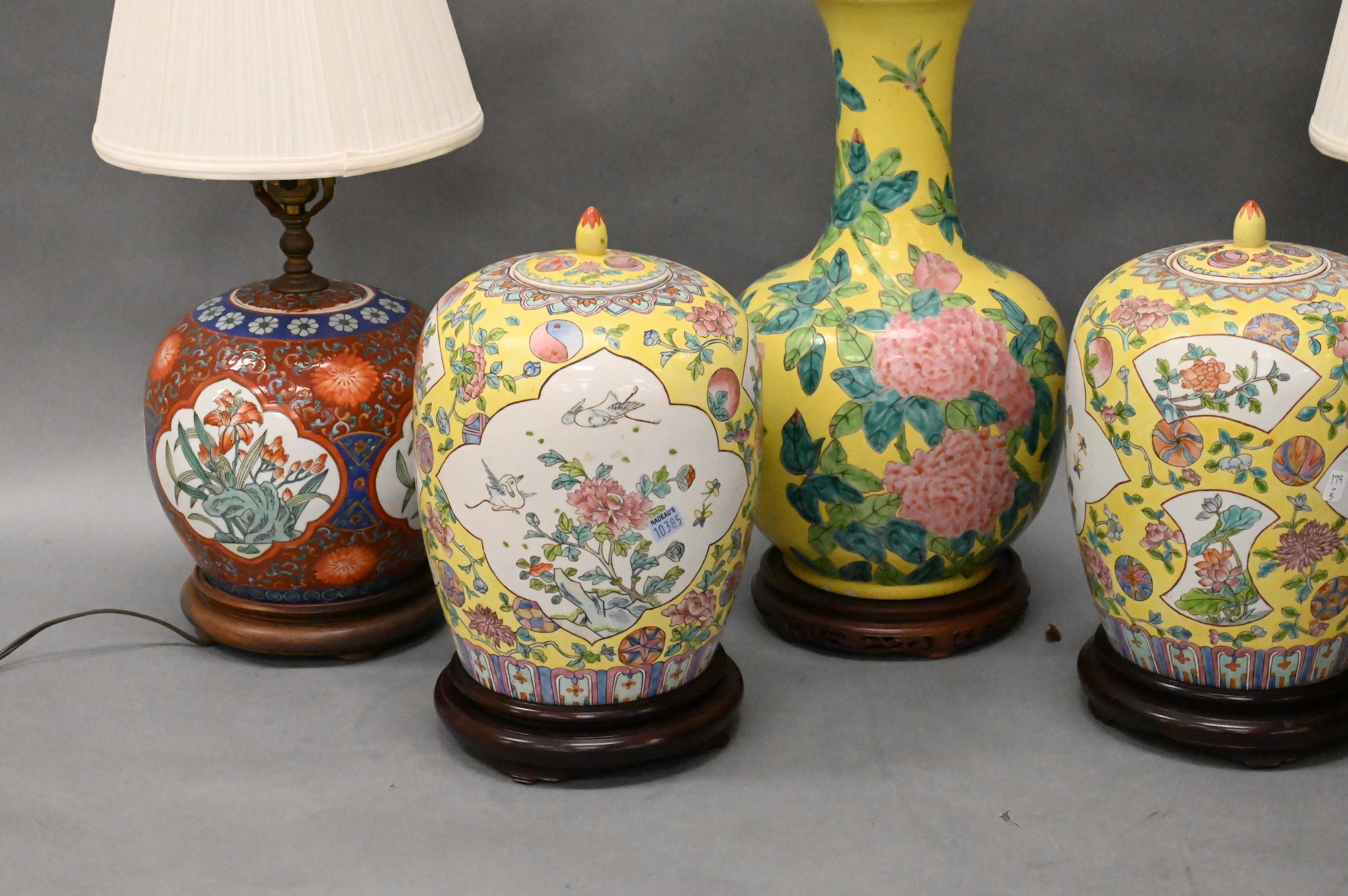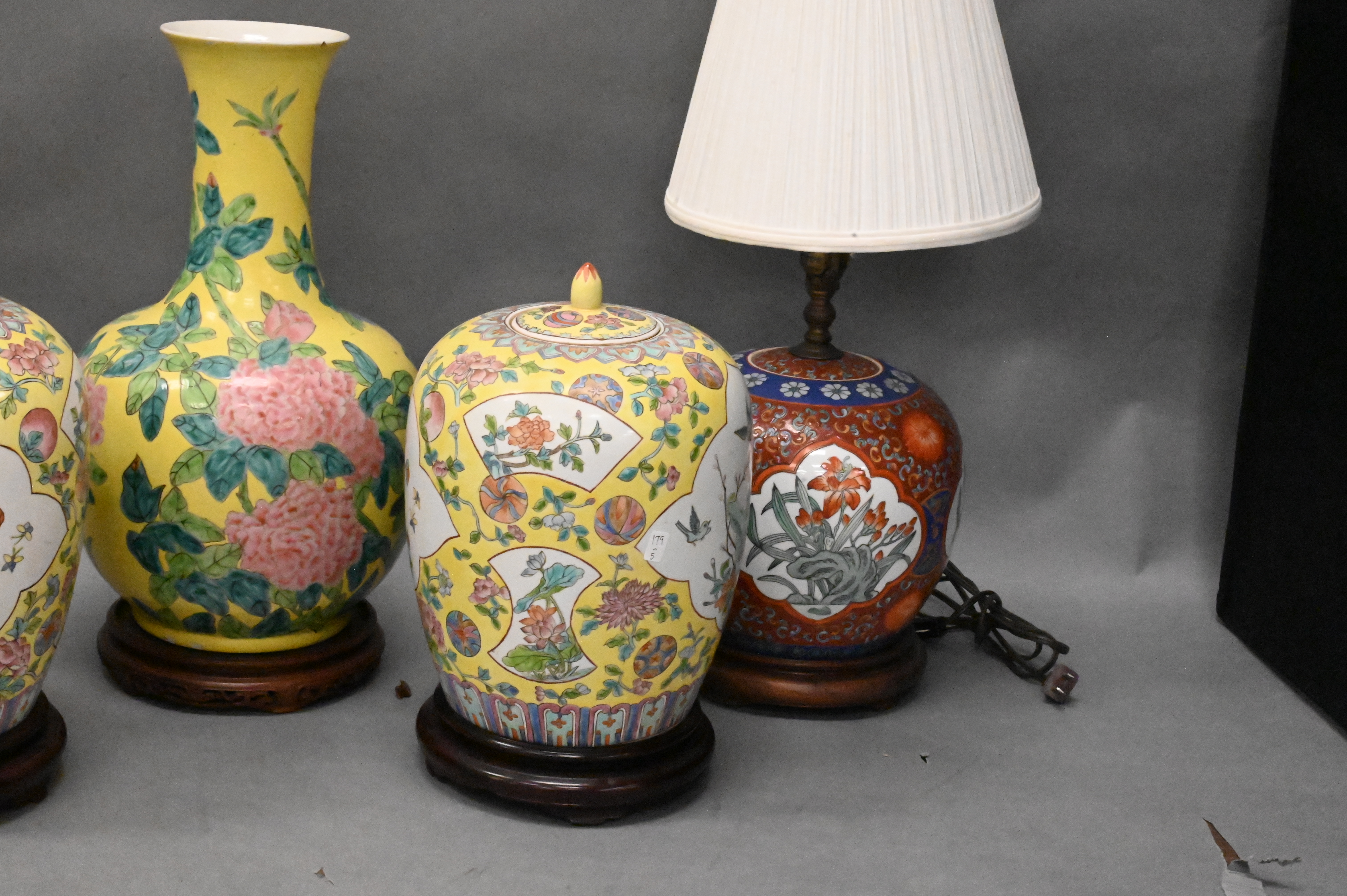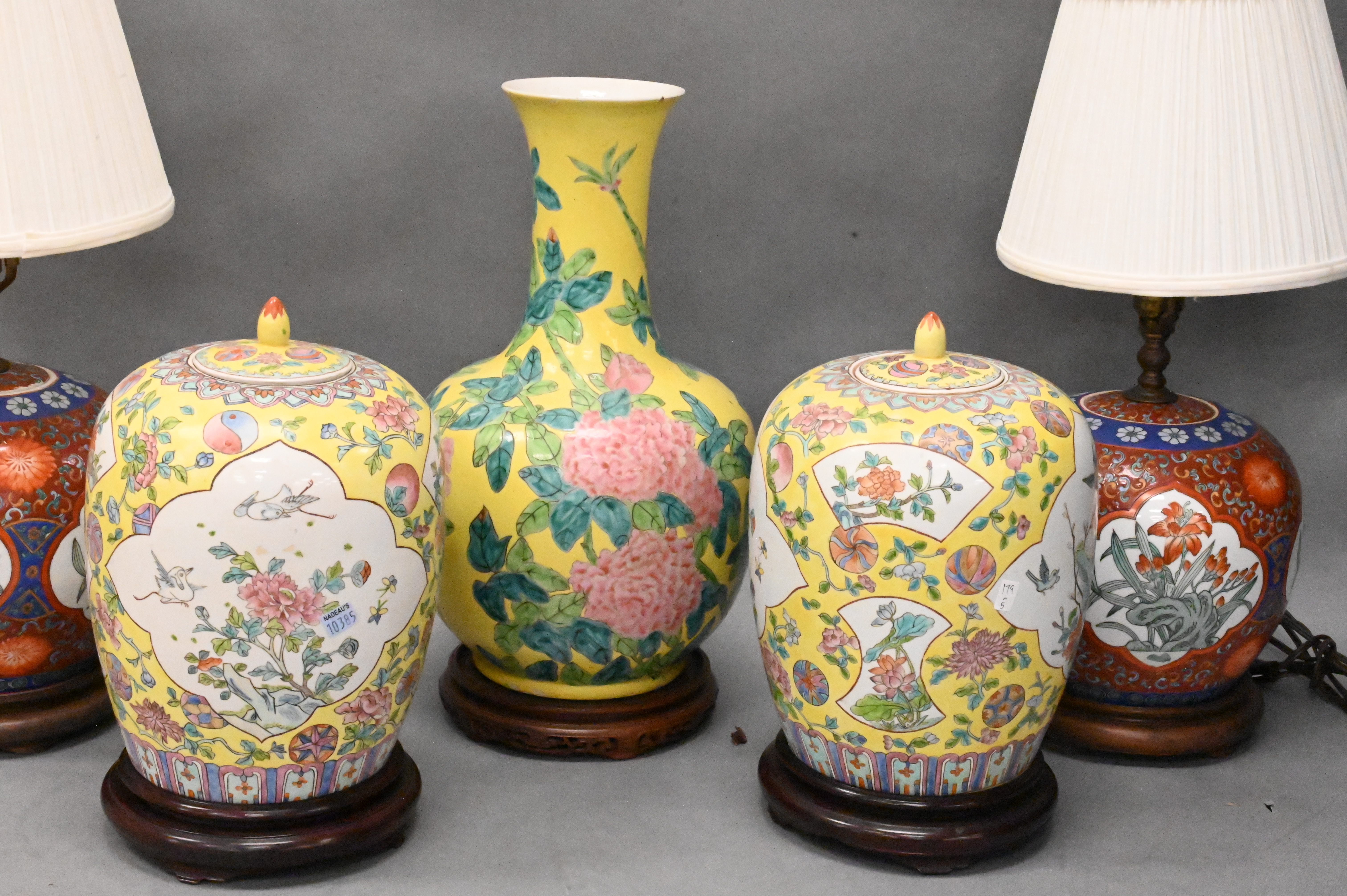to include pair of yellow ground ginger jars (Famille Jeune), yellow ground trumpet form vase having floral motif and character mark to base both having carved bases, along with pair of Chinese porcelain covered ginger jars now mounted as lamps 20th century