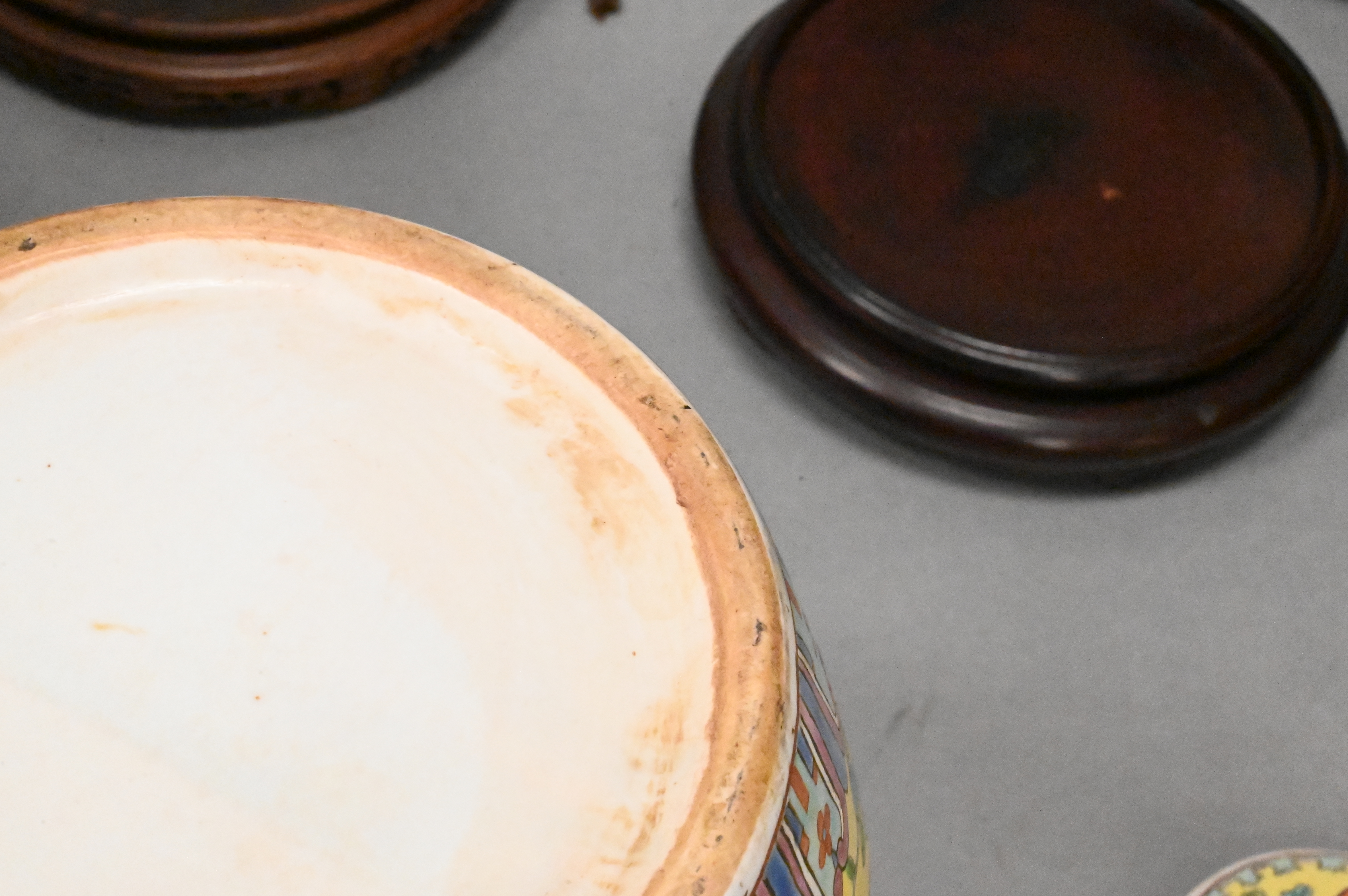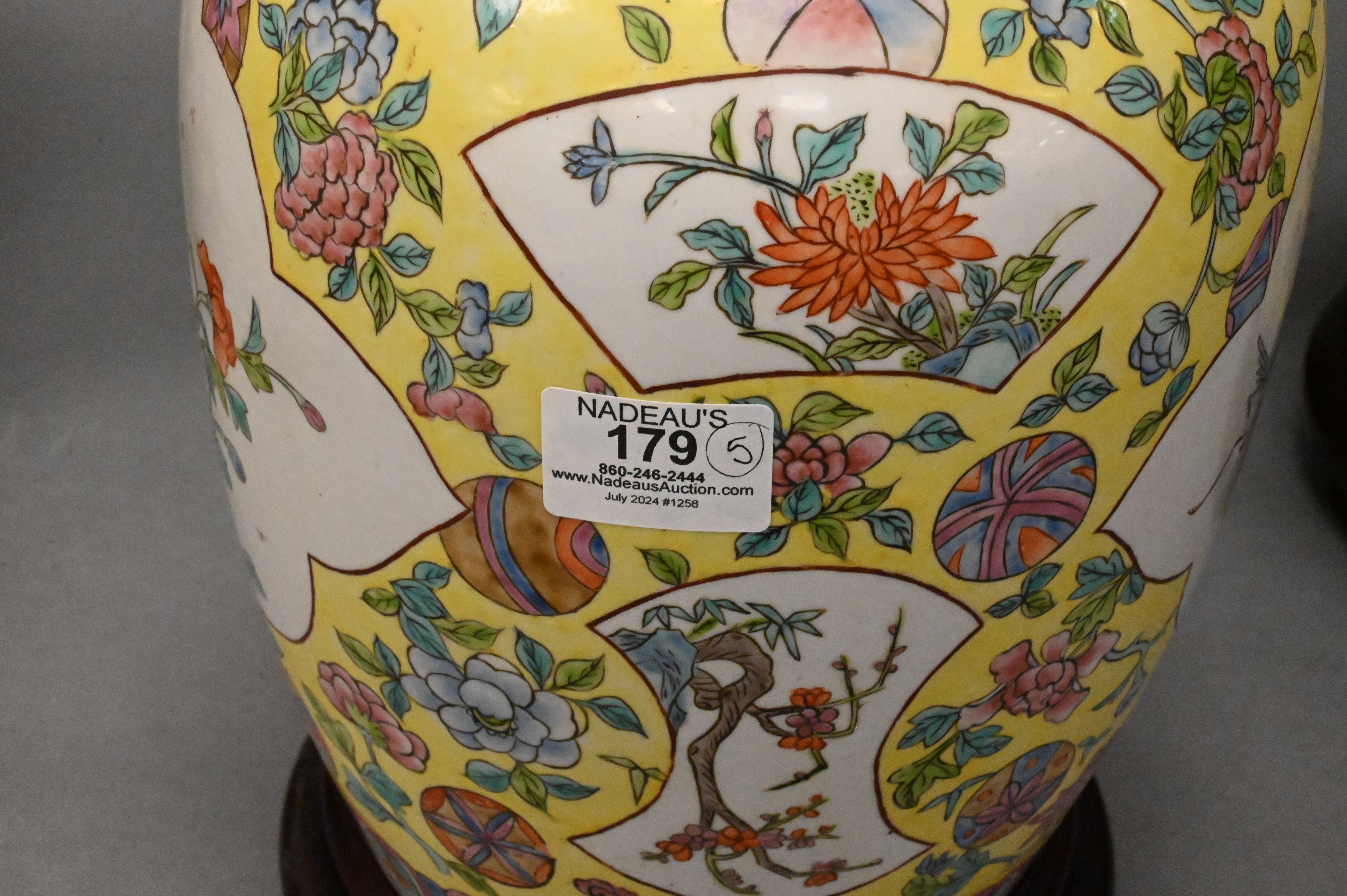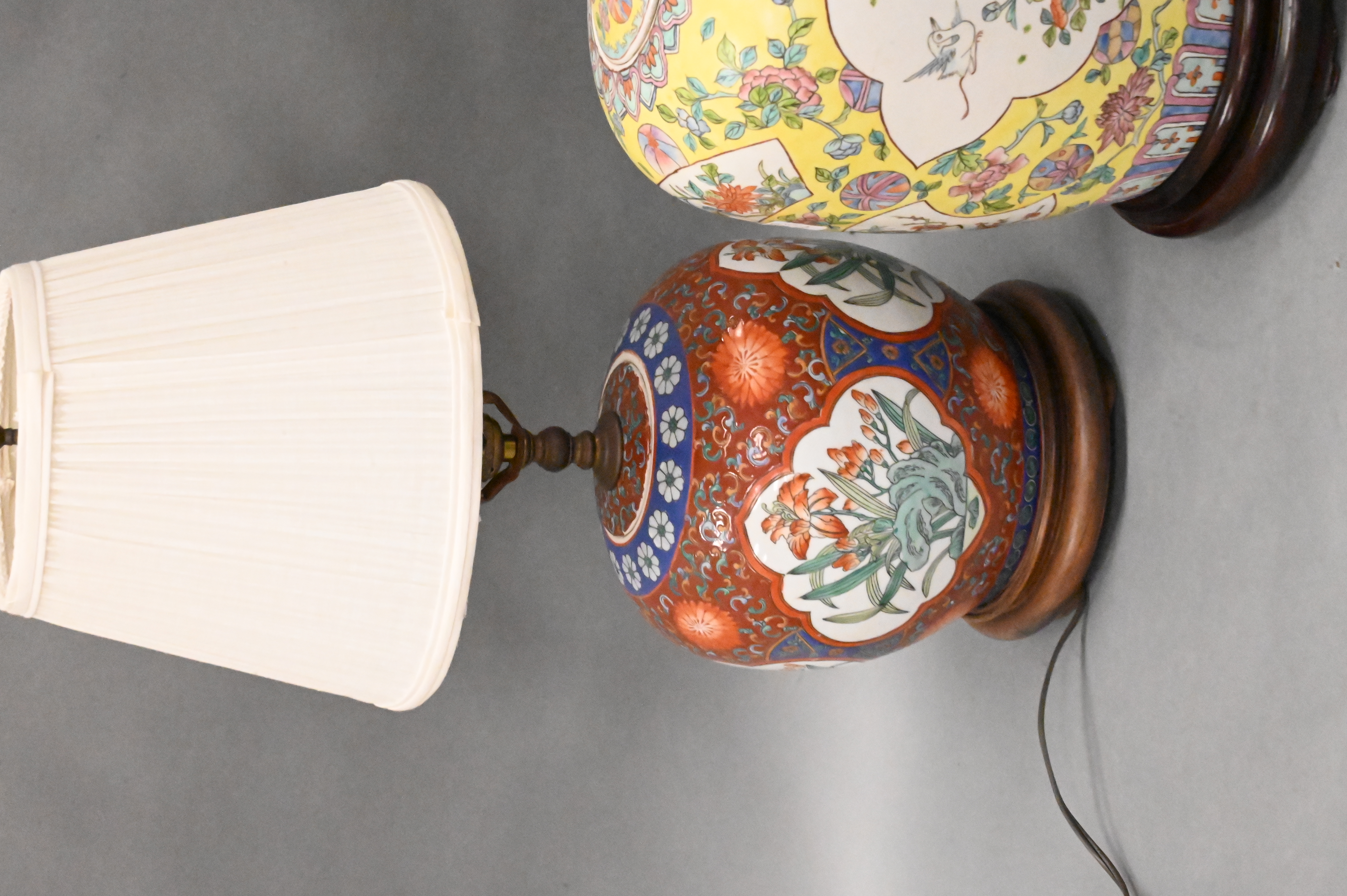 to include pair of yellow ground ginger jars (Famille Jeune), yellow ground trumpet form vase having floral motif and character mark to base both having carved bases, along with pair of Chinese porcelain covered ginger jars now mounted as lamps 20th century