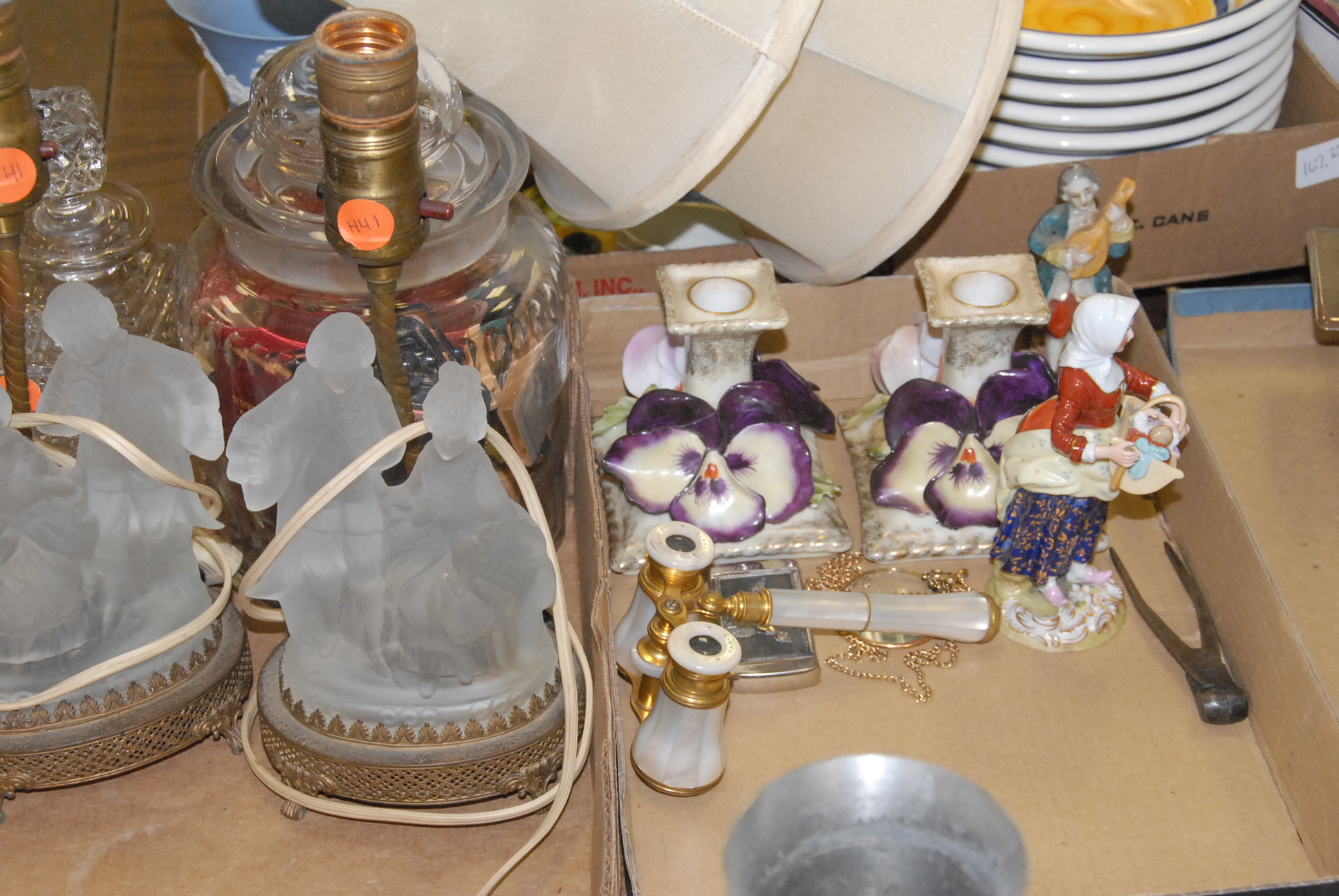 Four box lots of miscellaneous items including pewter covered cologne bottles, pair of lamps, opera glasses, couple of small lift top boxes, candle sticks, etc.