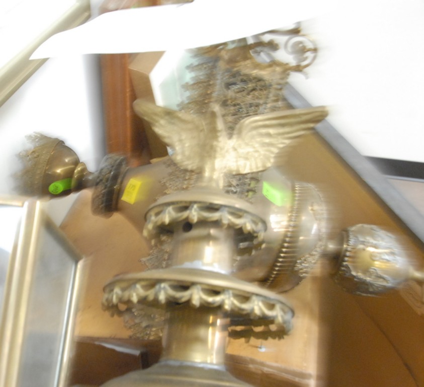 Group lot brass hanging light with cranberry shade and two outdoor brass lights.