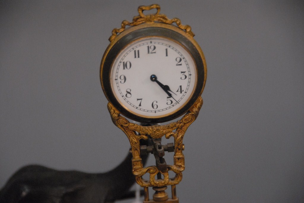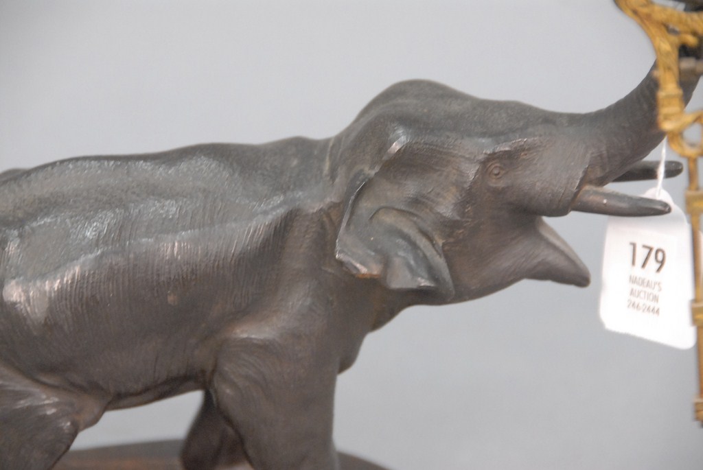 Lot 179: Junghans Elephant Swinger clock, German, brass elephant figure with trunk supporting swinging arm clock, ht. 11.