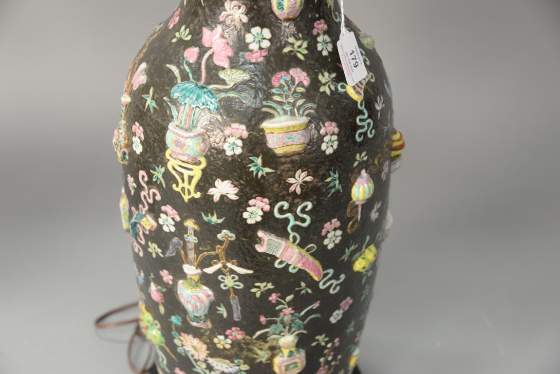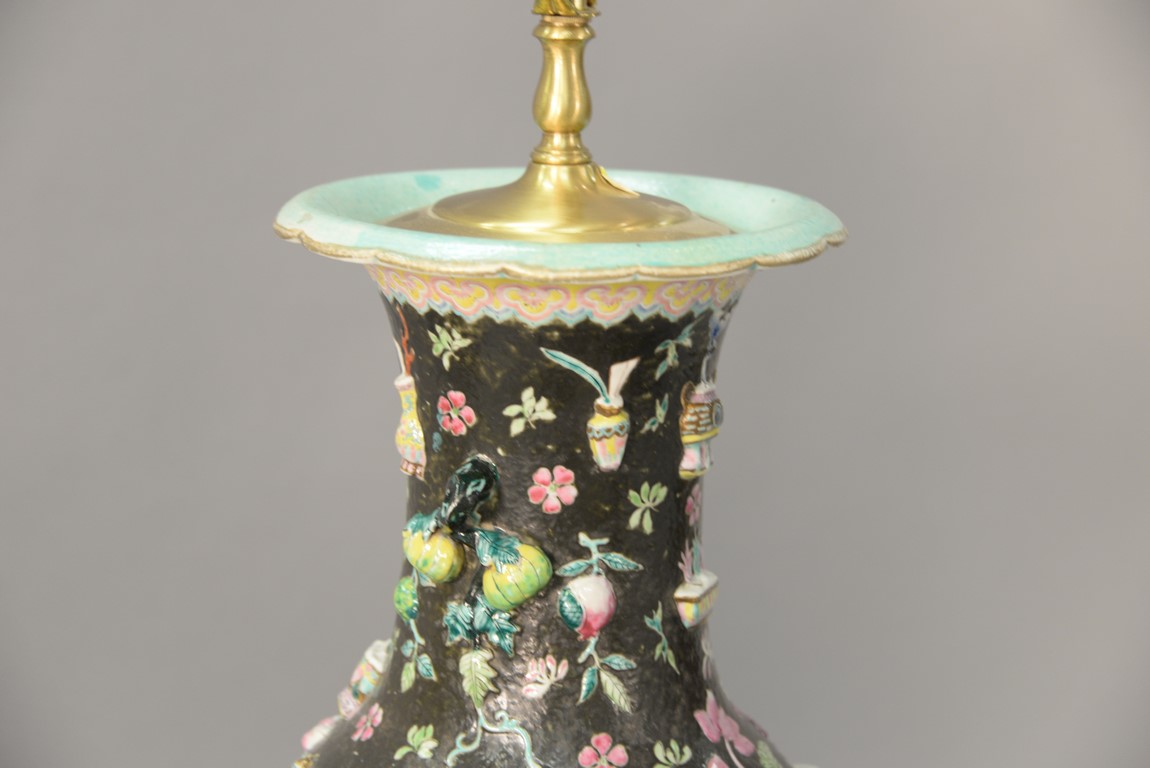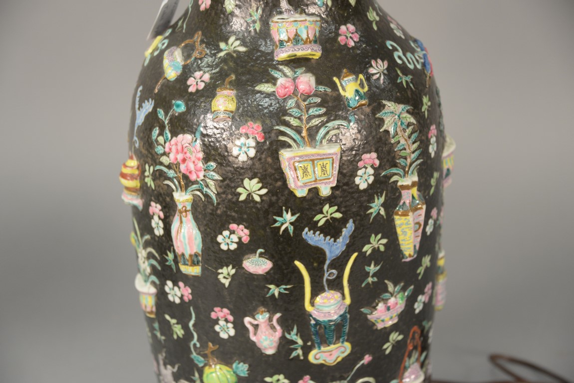 Lot 179: Large Famille Noir baluster form porcelain vase molded with a lively display of the Hundred Antiques and precious Emblems in high and low relief various floral bouquets, vases, planters, and scholar objects, made into table lamp, 19th century.
