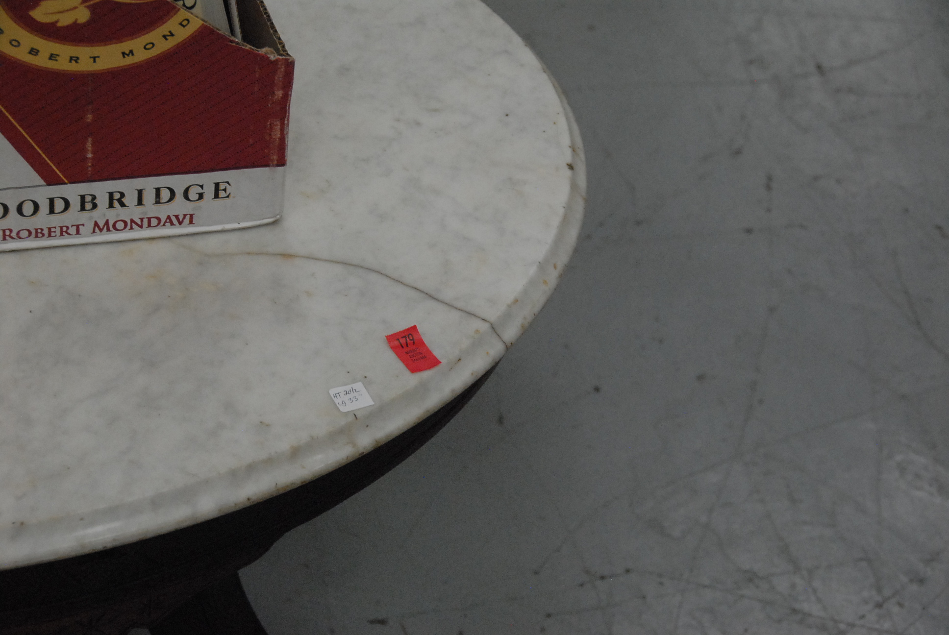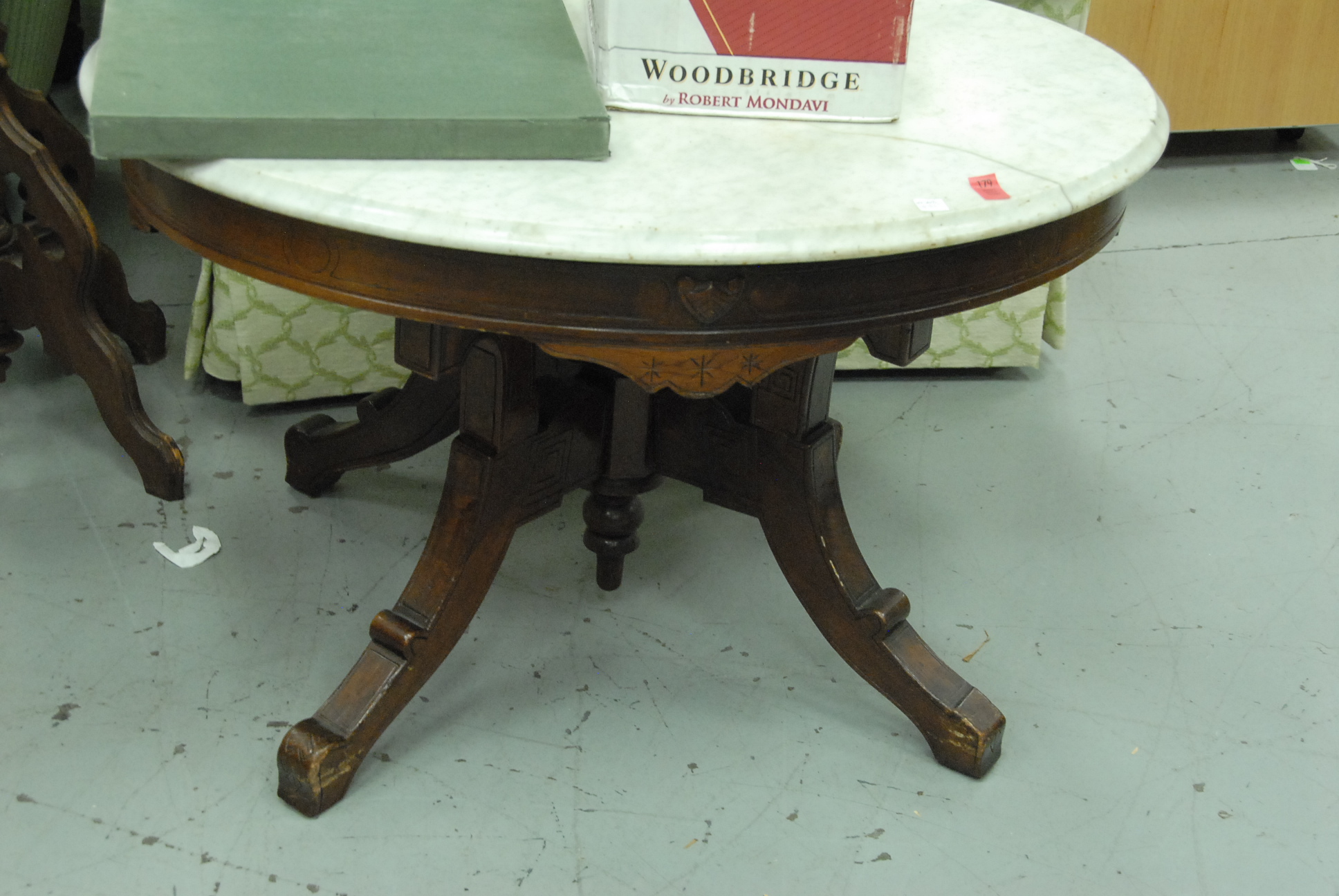 Oval Victorian marble top table, ht. 20 1/2in. lg. 33in. crack in marble.