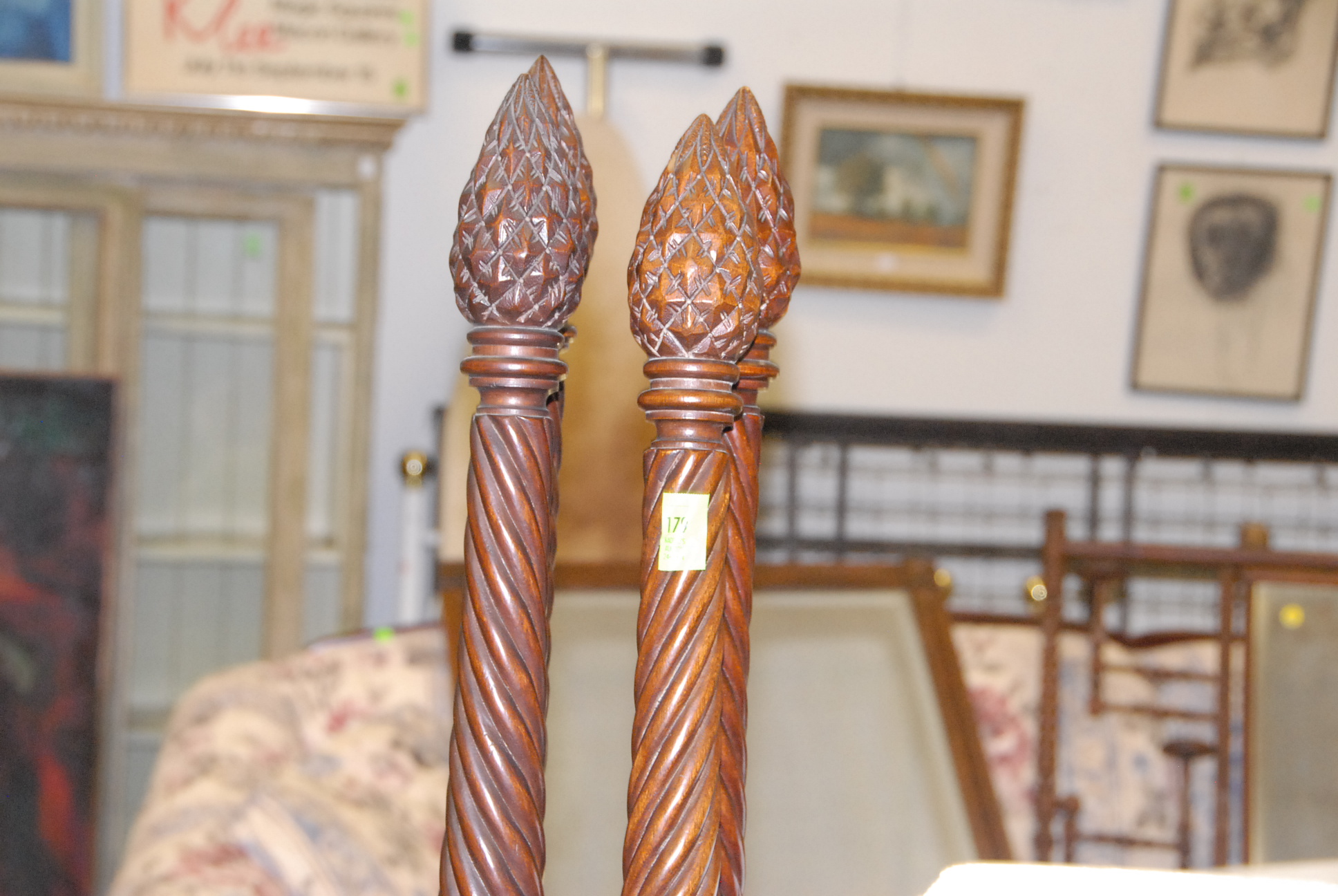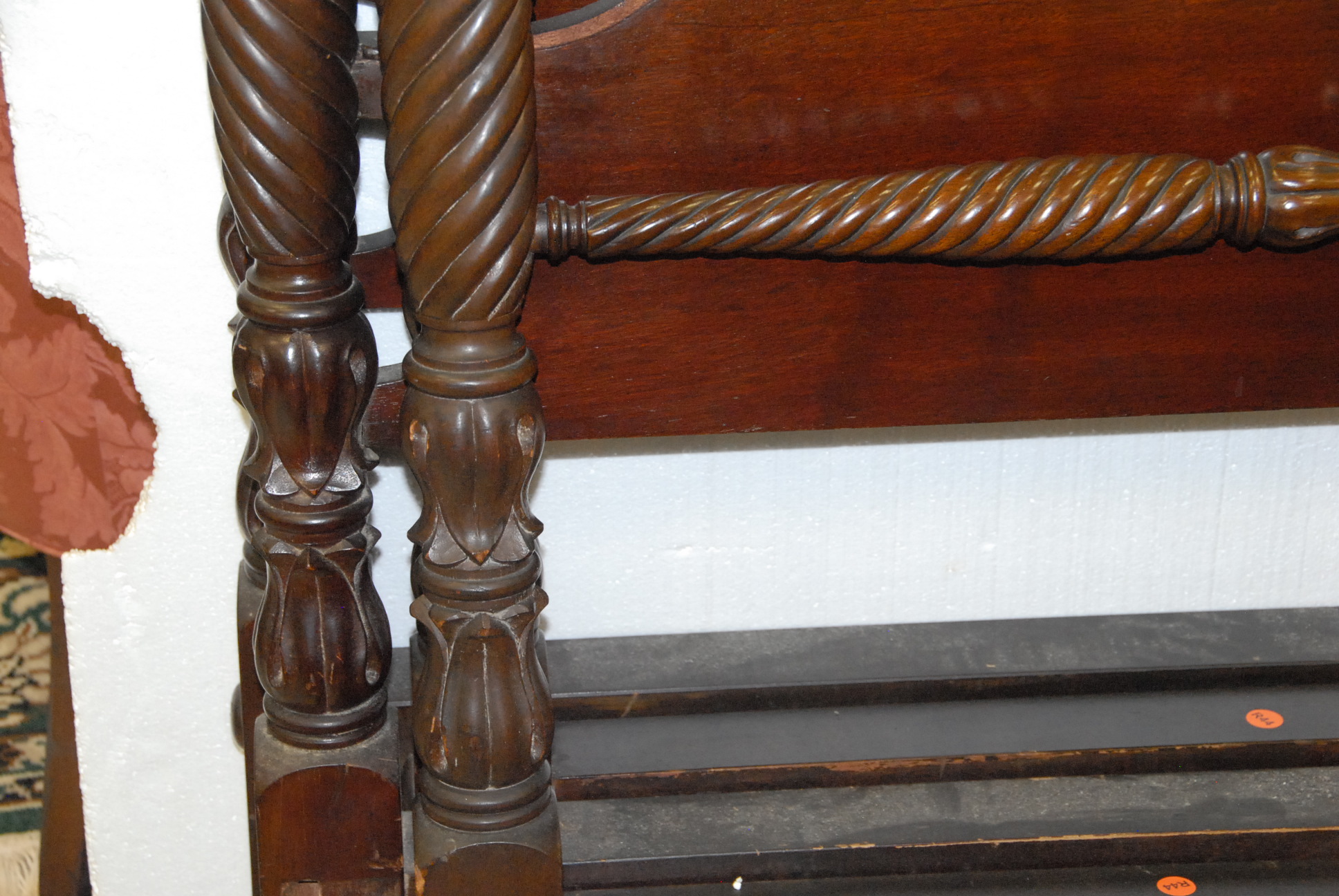 Pair of mahogany tall four post beds with custom platform boxspring, veneer chips on one headboard.