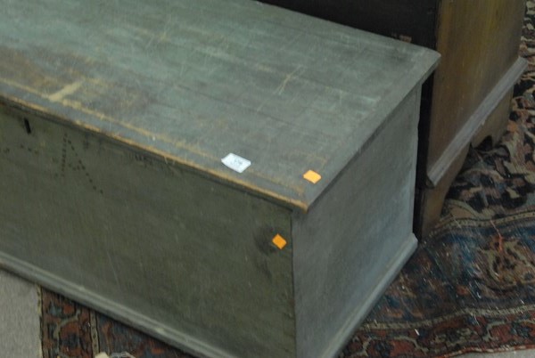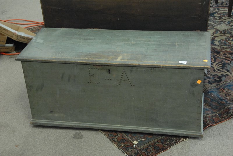 Lot 179: Primitive lift top six board blanket chest in old robin’s egg blue paint. ht. 18in. lg. 41in.