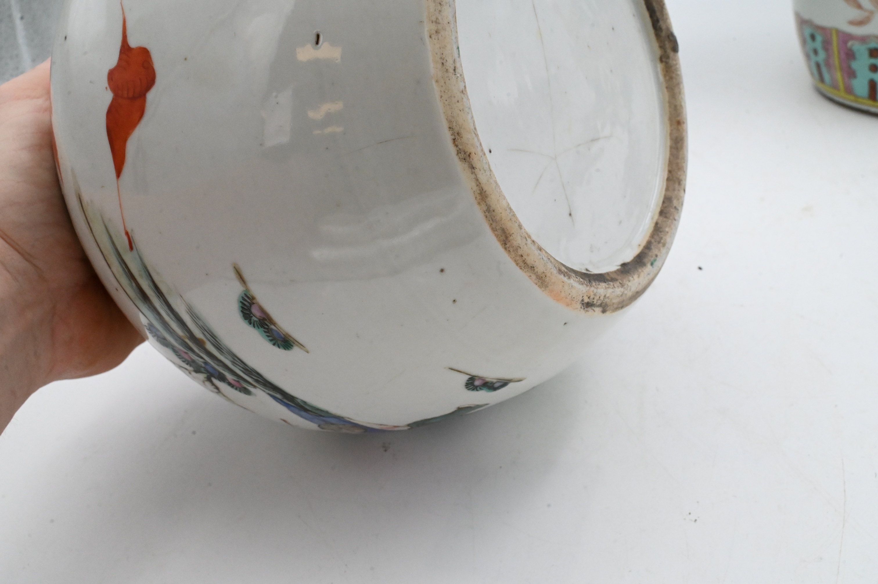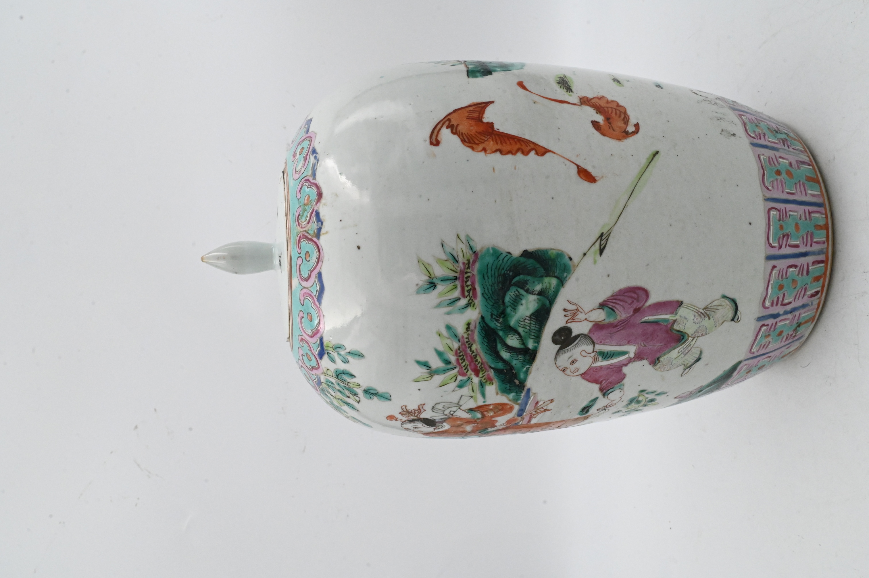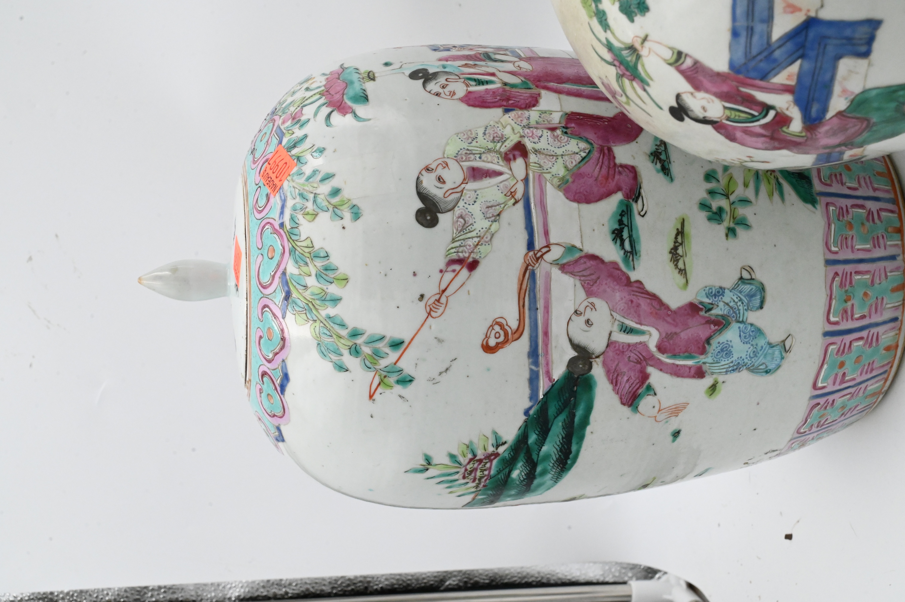 one with playing boys motif, one in famille verte with green trees and ho ho bird/phoenix motif along with a squat jar depicting a goddess riding a mythical creature