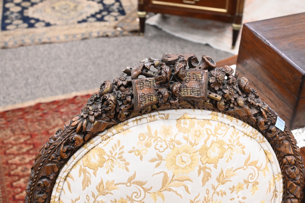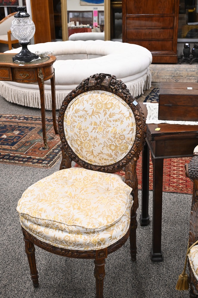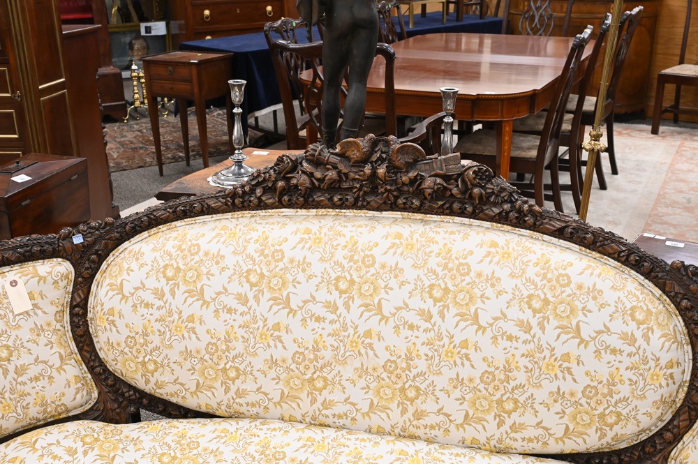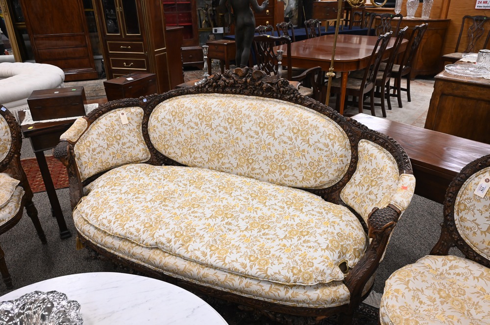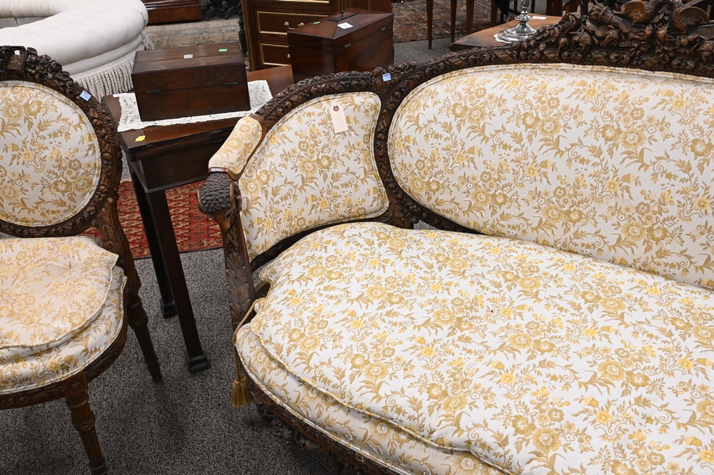 Lot 179: Three Piece Louis XVI Style Salon Set, having carved backs and rams head hand rests, with loose cushion seats (chips on wing of bird), settee length 65 inches.