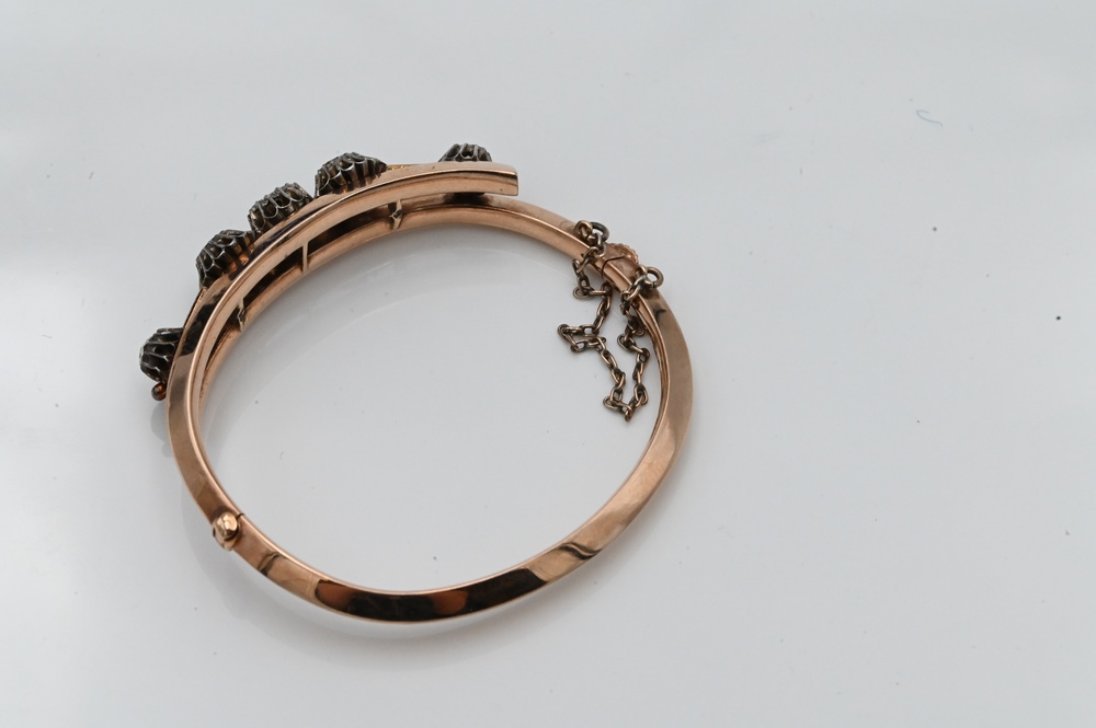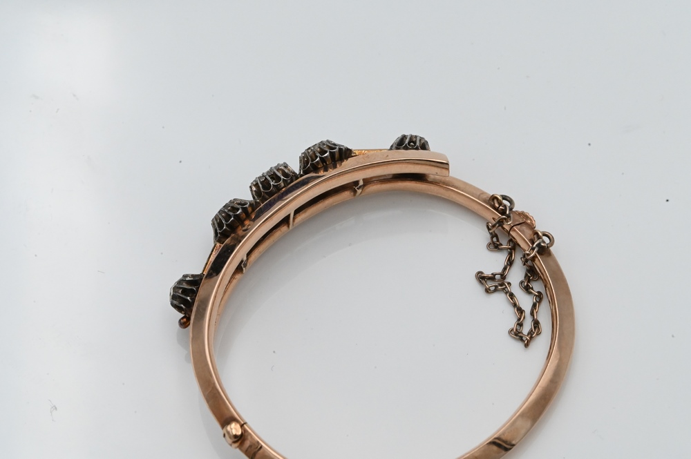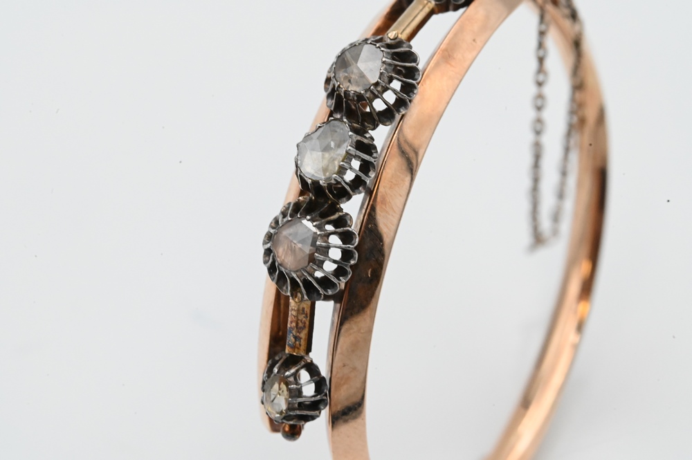 Lot 18: 14 Karat Gold Bangle Bracelet, set with five rose cut diamonds, 19th century or earlier, 14.4 grams.