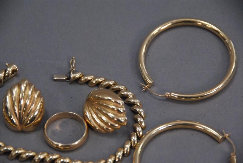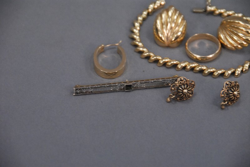 14K gold lot to include bracelet, bar pin, and earrings, 40 grams.