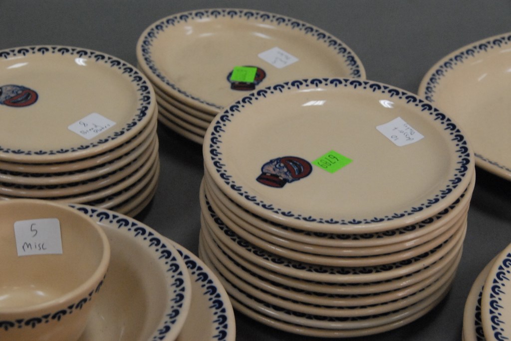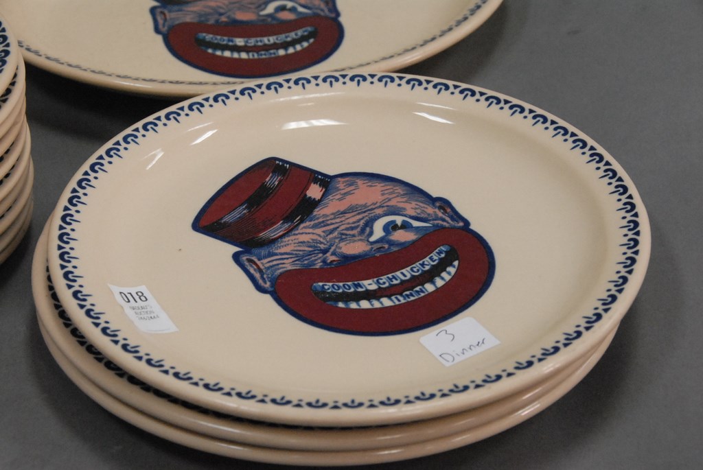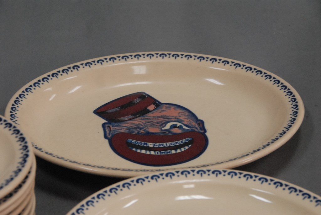 Lot 18: Black Memorabilia Coon Chicken china dinnerware: three dinner plates, large platter, five small oval plates, eight bread plates, ten…