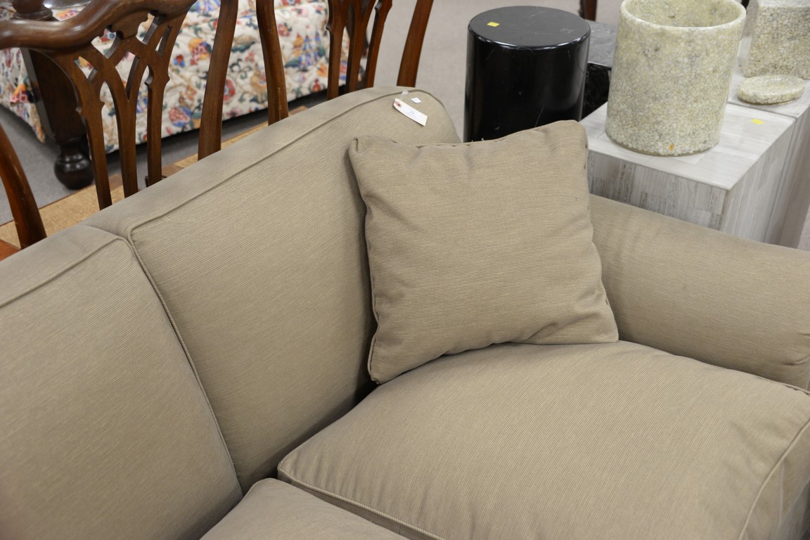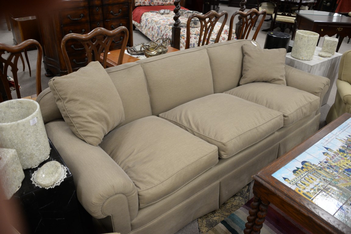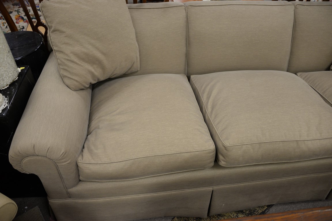 Lot 18: Custom tan upholstered sofa with rolled arms and three down filled cushions. lg. 92in. very clean condition