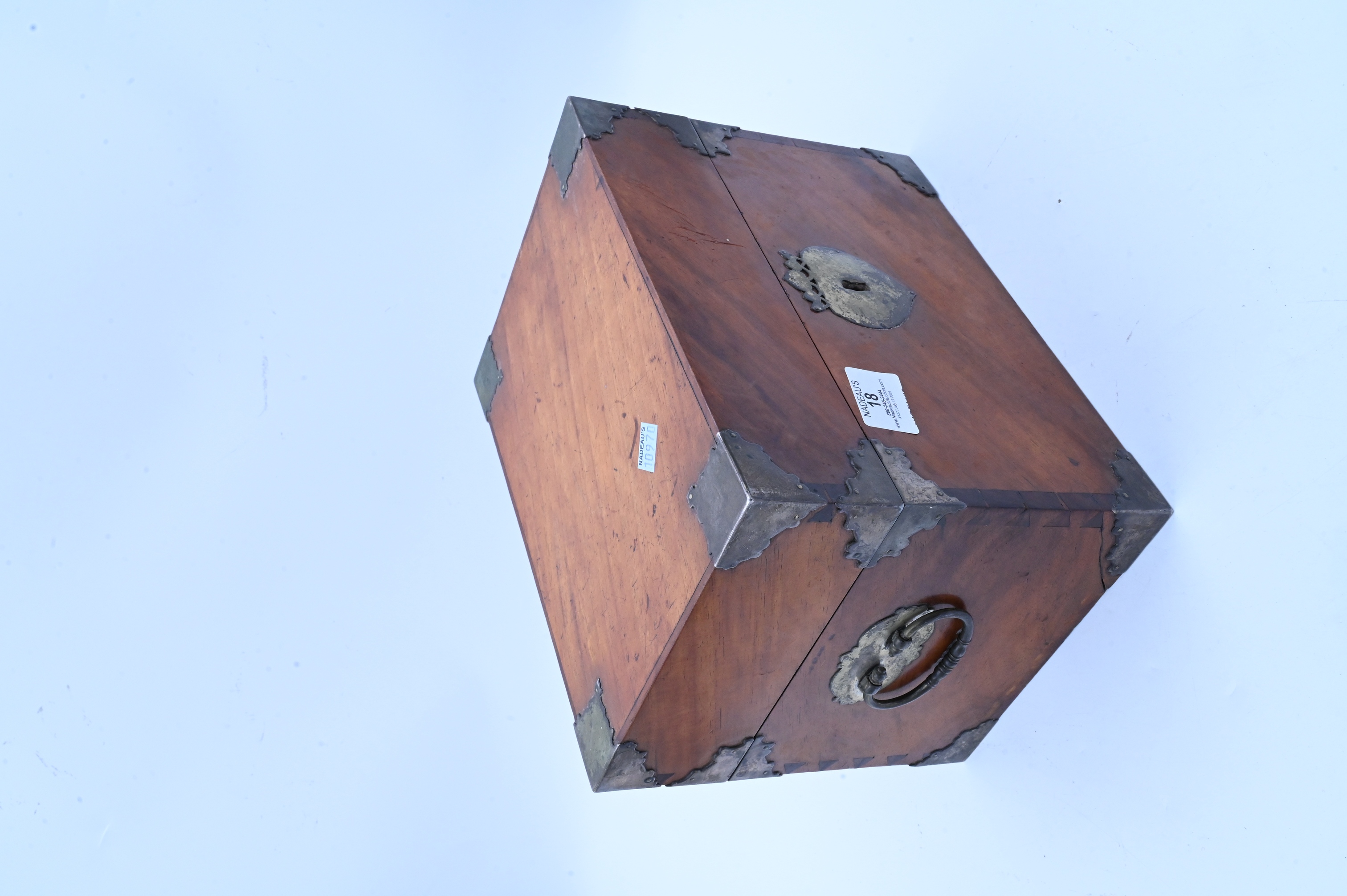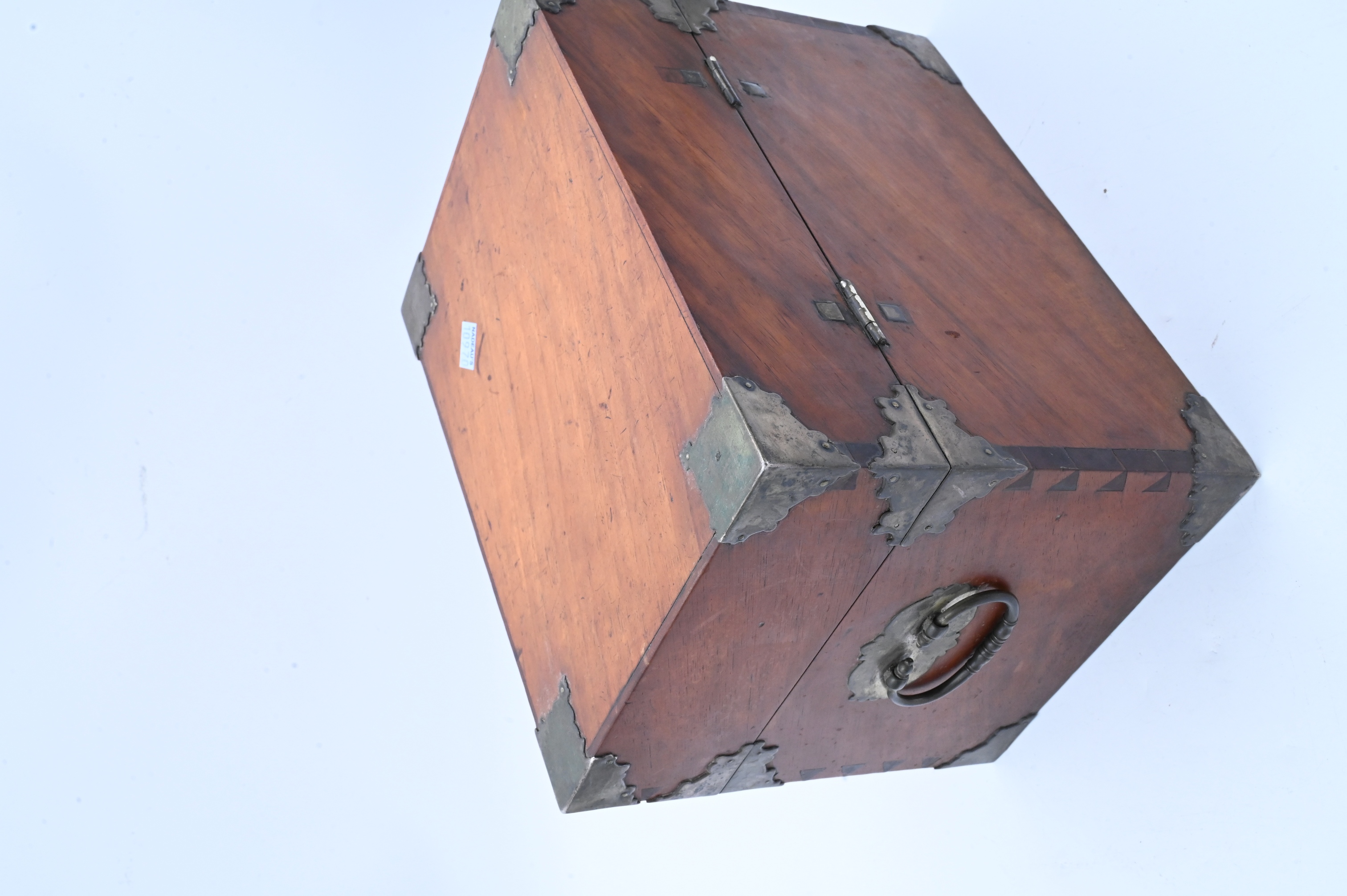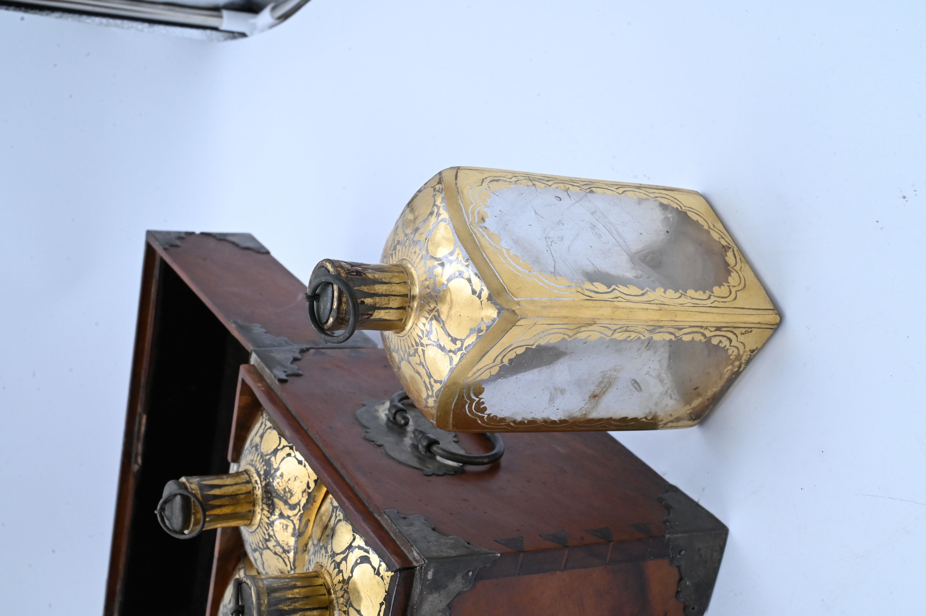 having six gilt bottles in dovetailed mahogany case with double handles and heart form hardware, 19th century or earlier