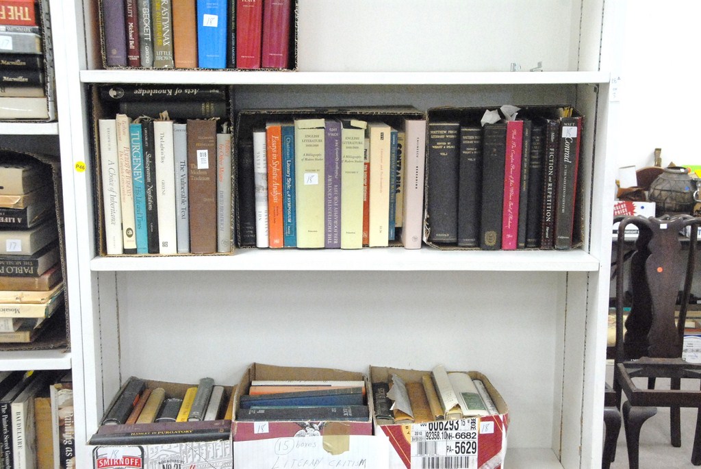 Fifteen boxes of books in white bookcase Literary Criticism and Social Science.