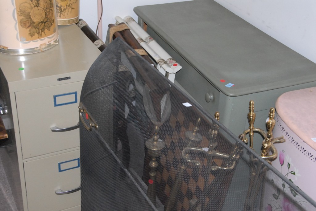 Group of furniture three drawer chest, hamper, two iron racks, fireplace tools, andirons, luggage racks, coffee table, fireplace screen, tole garbage cans, lamps, etc.