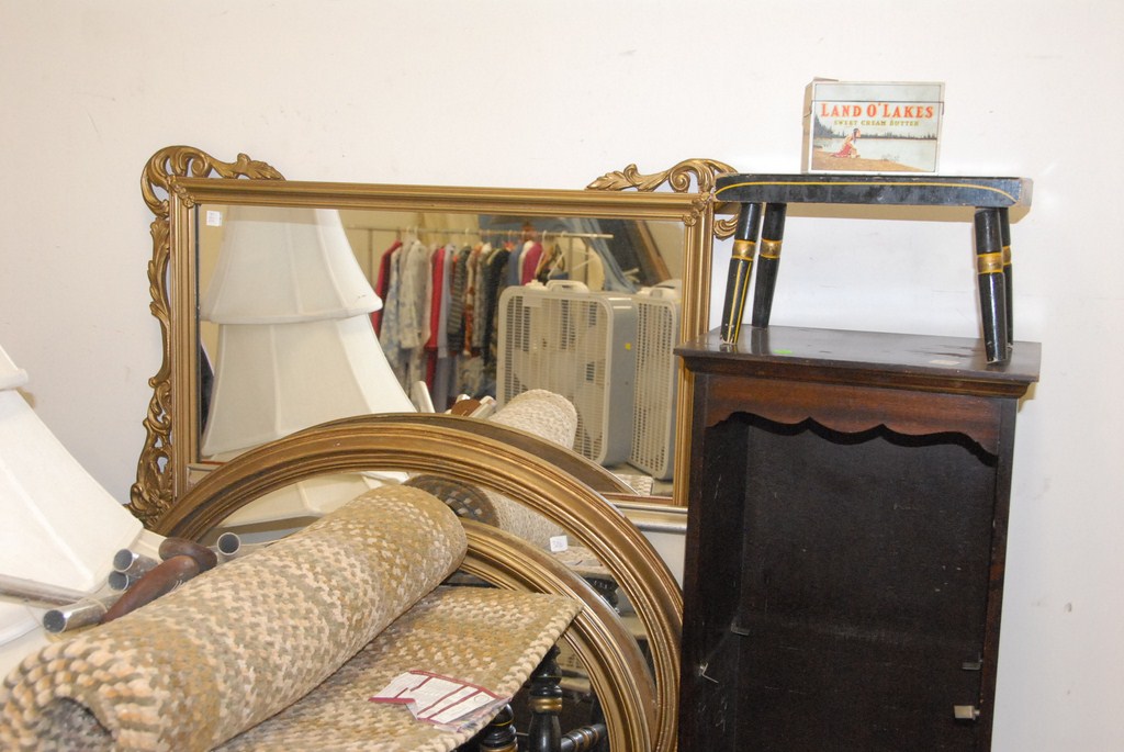 Lot 18: Large group lot several mirrors, hooked rug, outdoor chairs, Victorian piano stool, caned seat chair, narrow bookcase, painted foot…