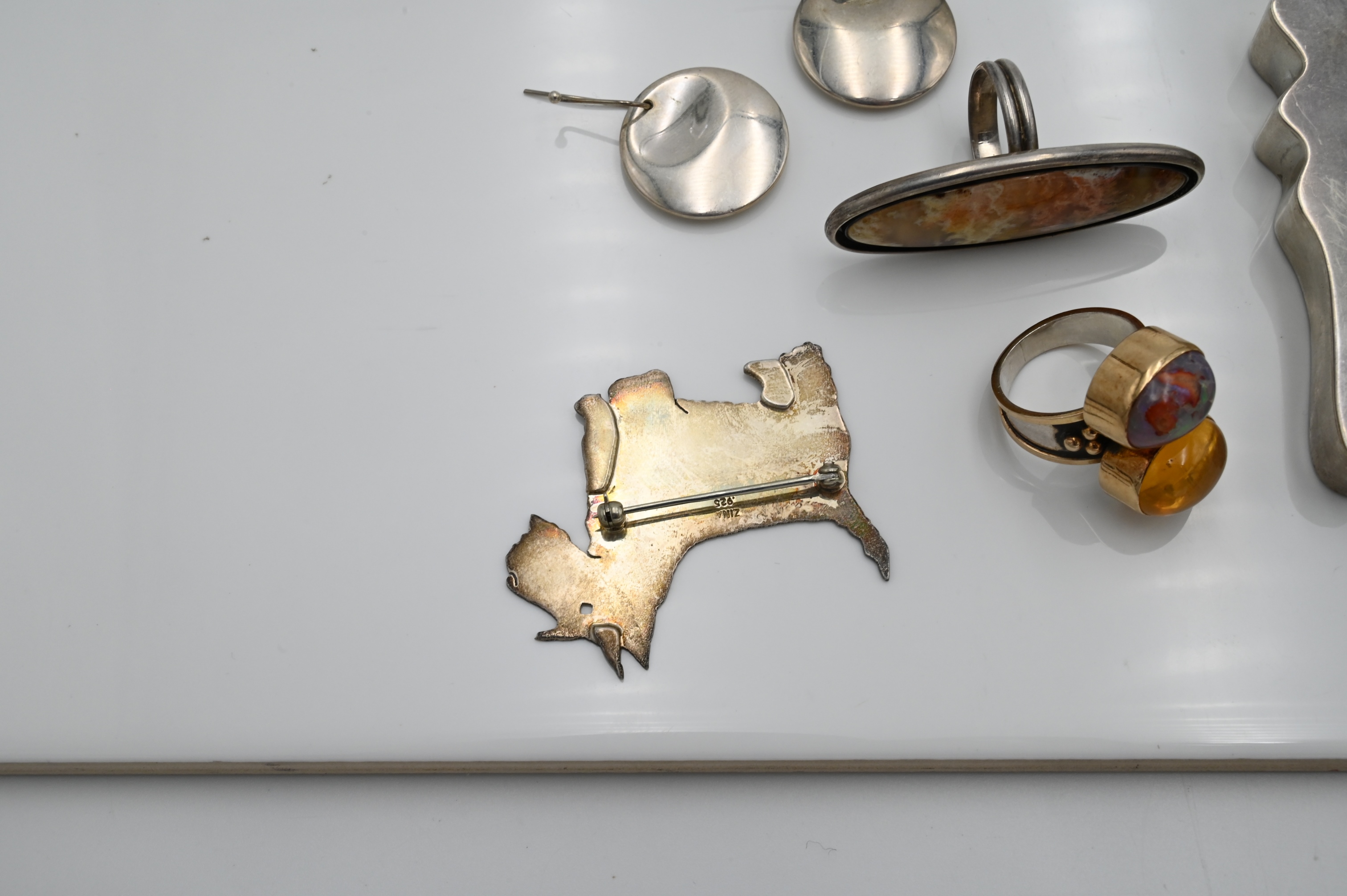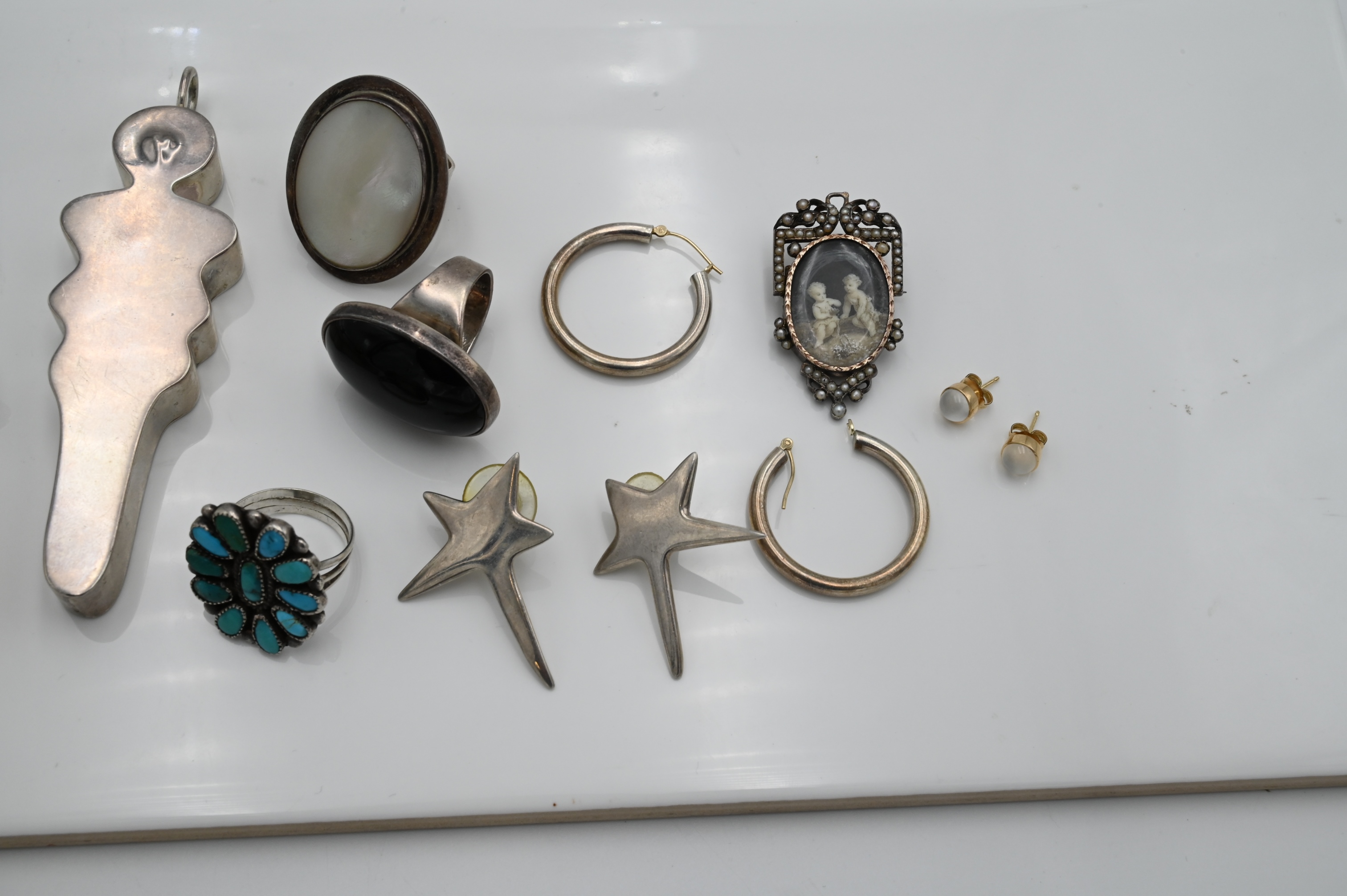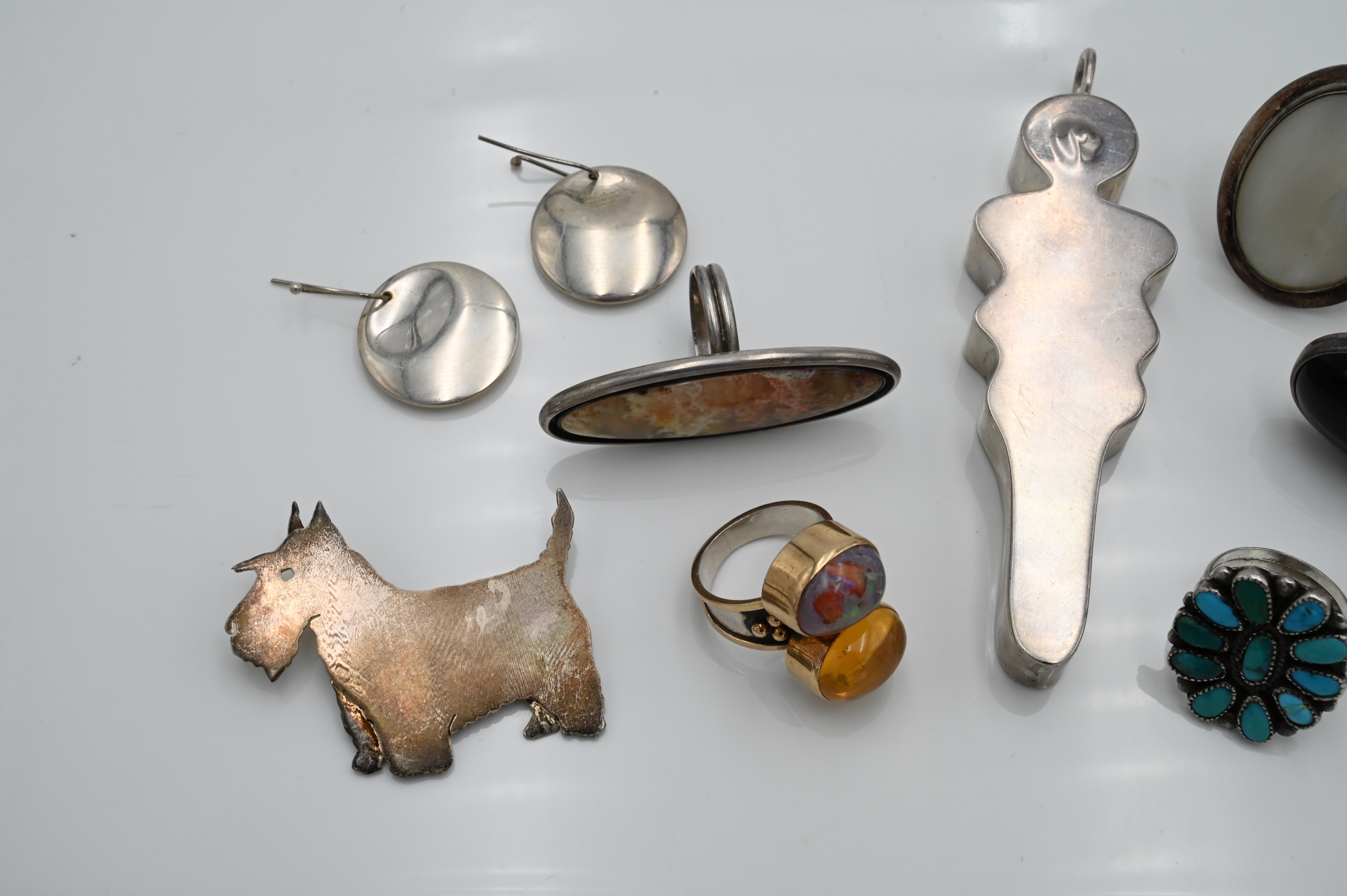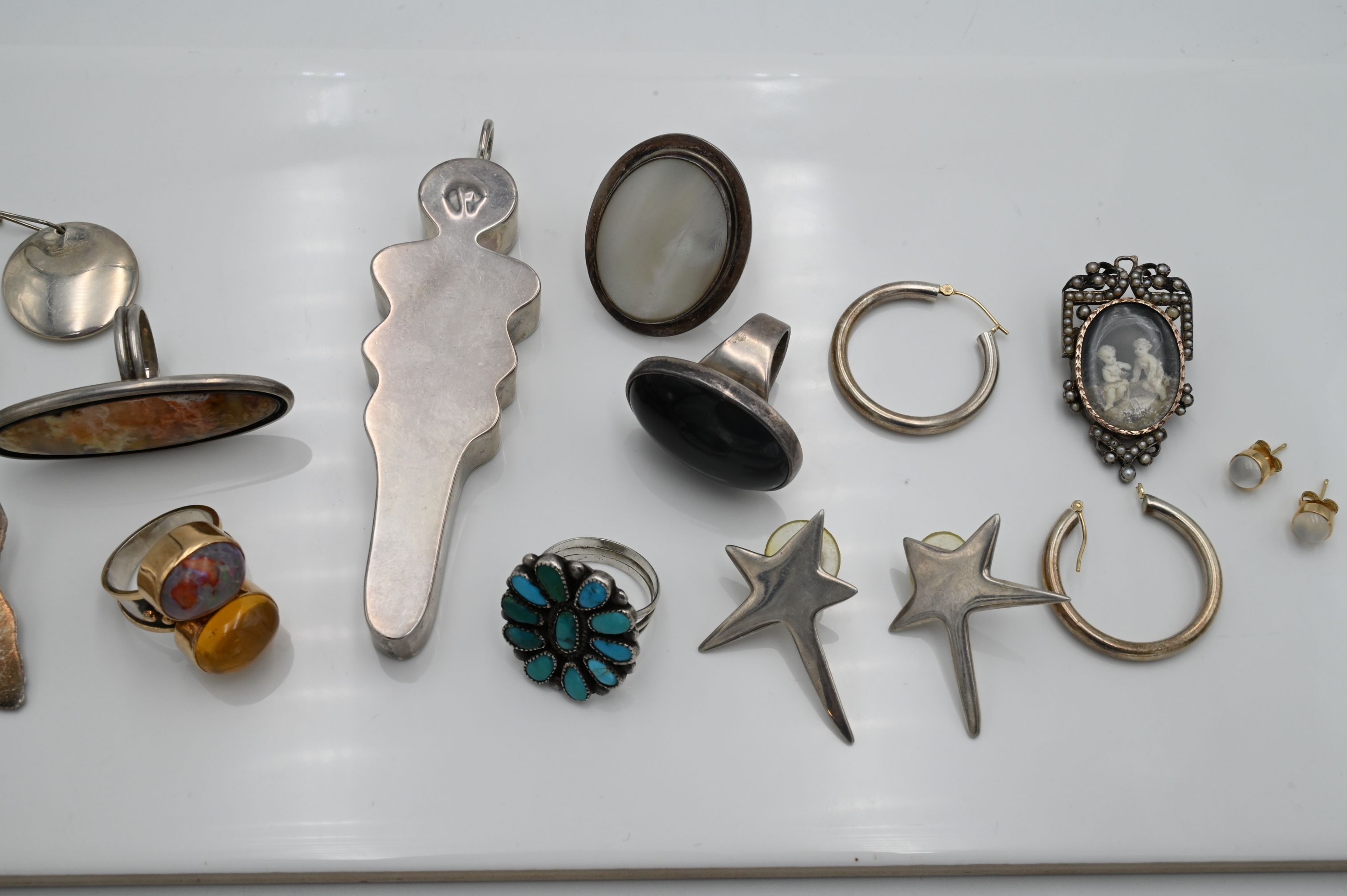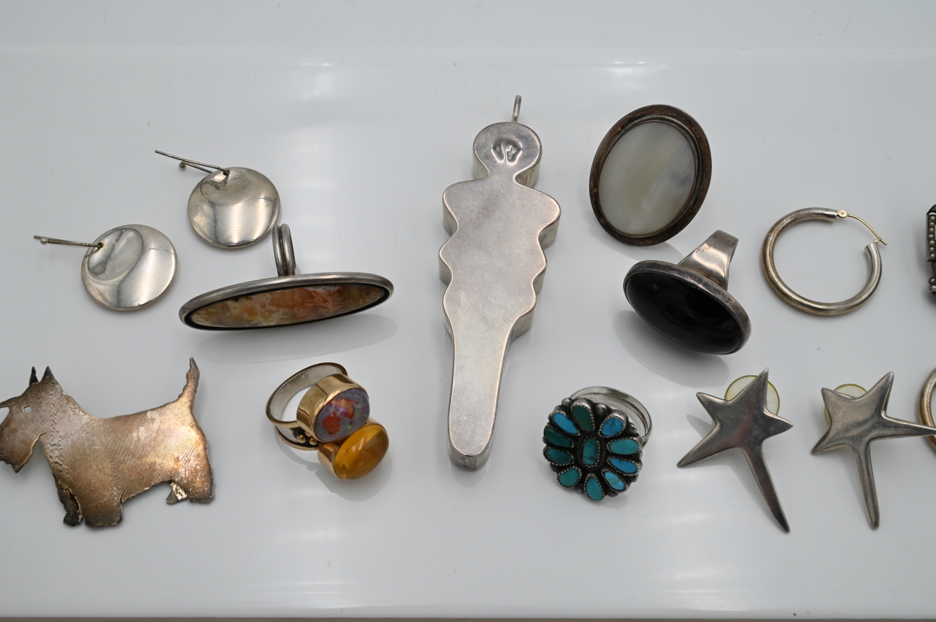 Large Grouping of Sterling Jewelry, to include three pairs of sterling earrings, one pair is Elsa Deretti for Tiffany & Co., five rings all set with stones, one pair of 18 karat gold studs, a sterling Victorian miniature portrait brooch surrounded by 58 seed pearls, along with sterling dog brooch and a figural pendant, 4.2 t.oz.