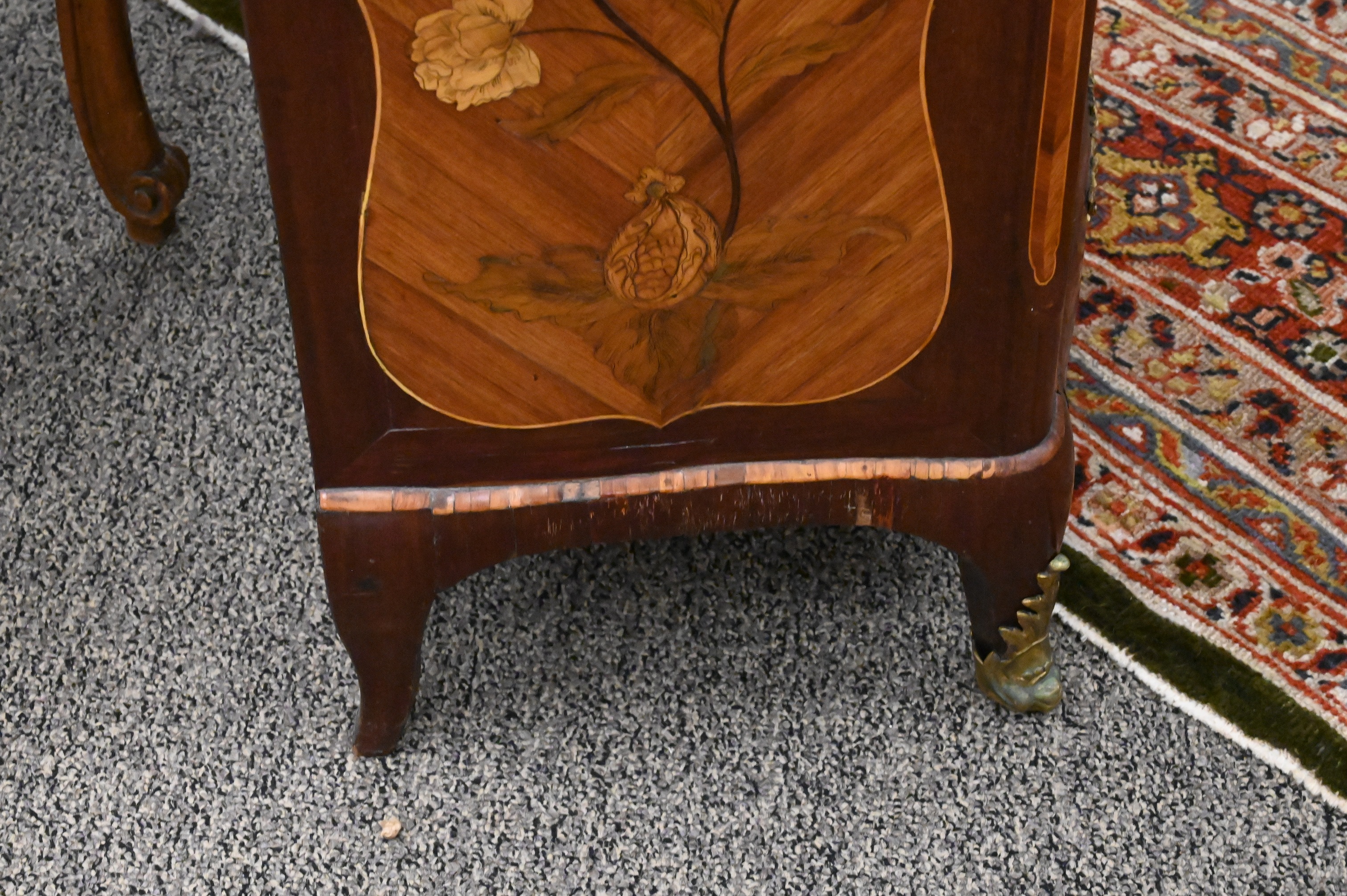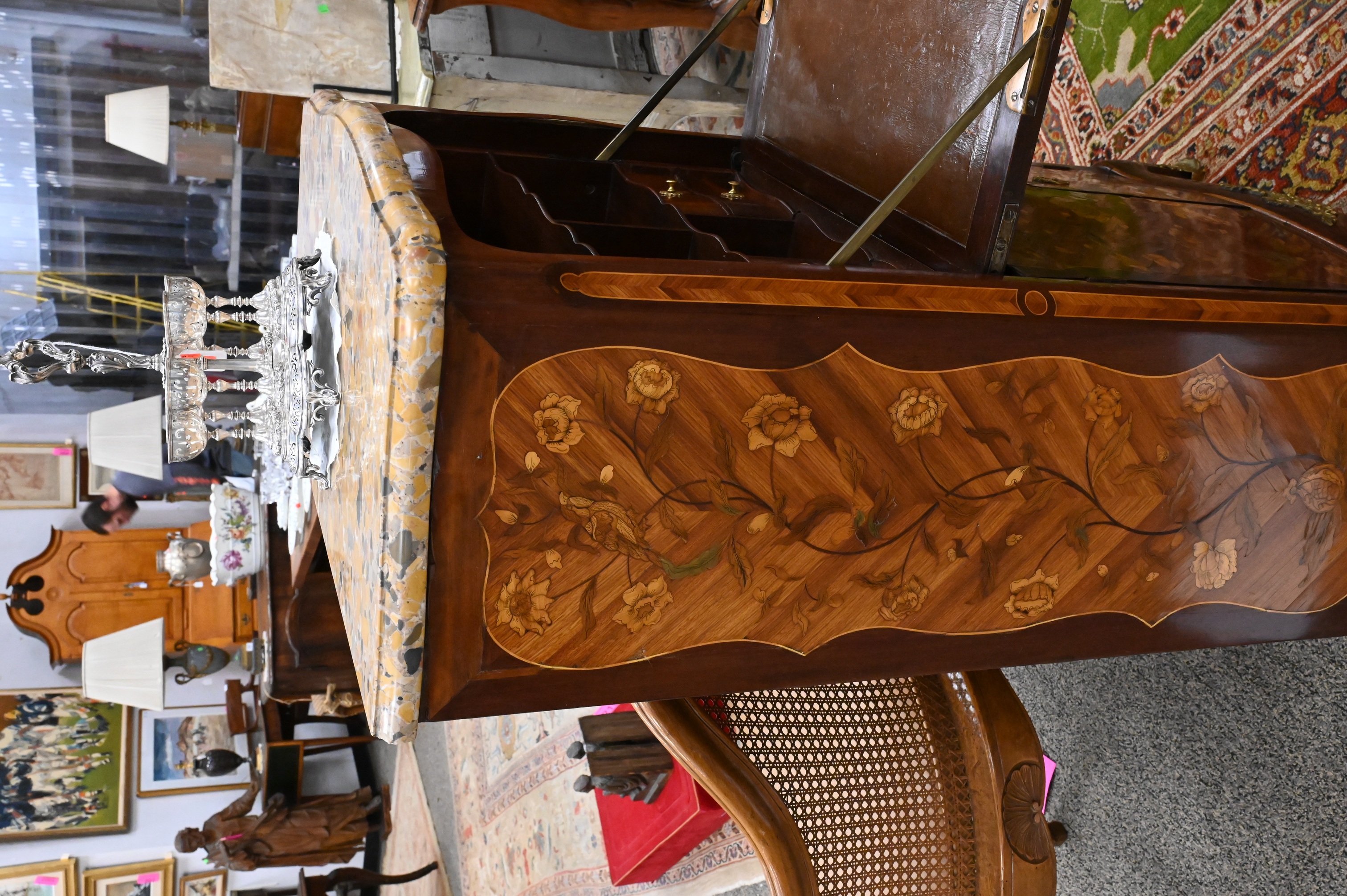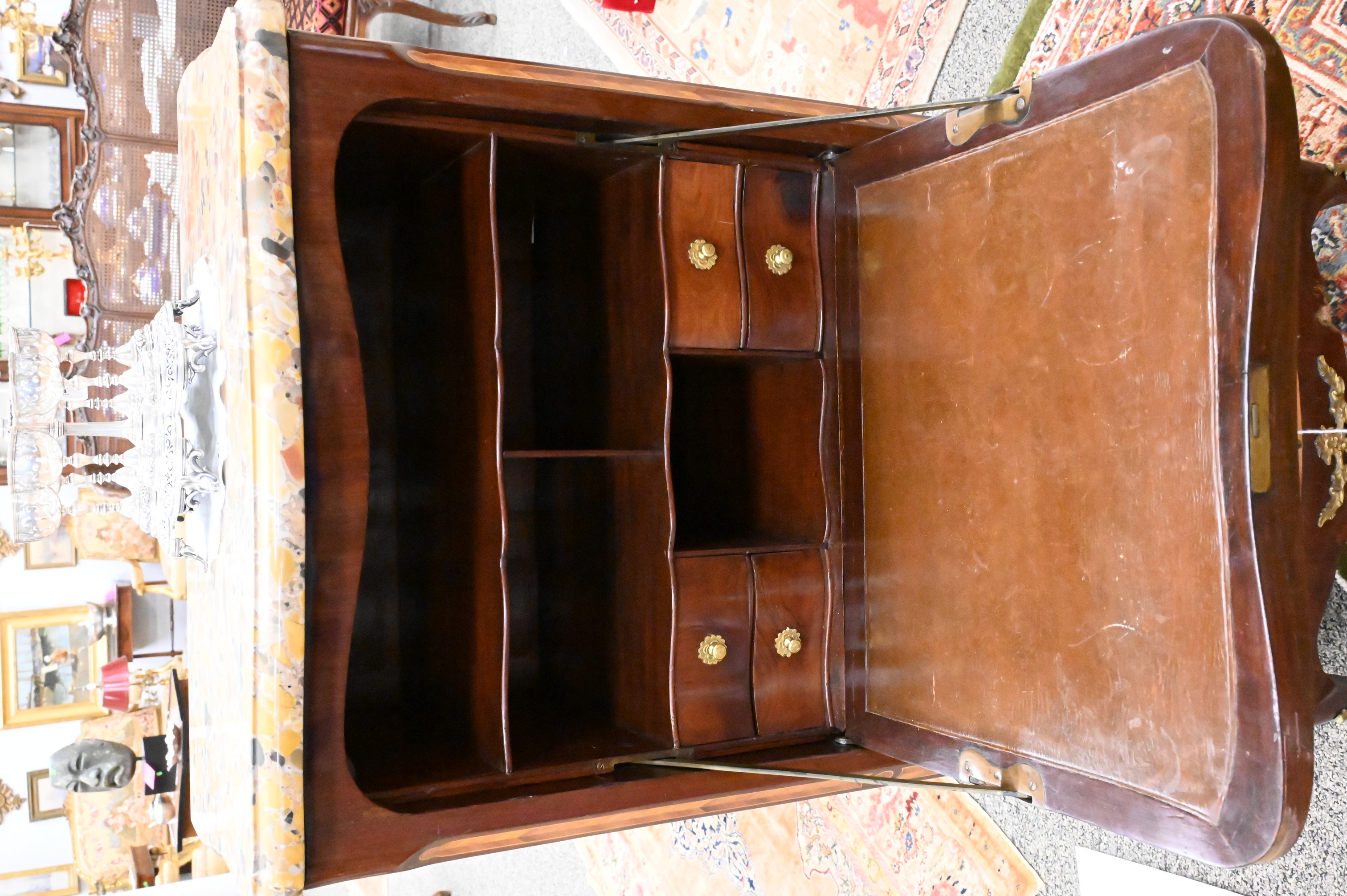 with serpentine front and elaborate floral and bird marquetry inlay of exotic woods, fall-front opens to a fitted interior with a leather writing surface and small drawers, over a pair of lower cabinet doors opening to reveal a fitted drawer with silk-lined bottom, surmounted by a molded Breccia marble top and mounted with gilt-bronze ormolu mounts and sabots, 19th century